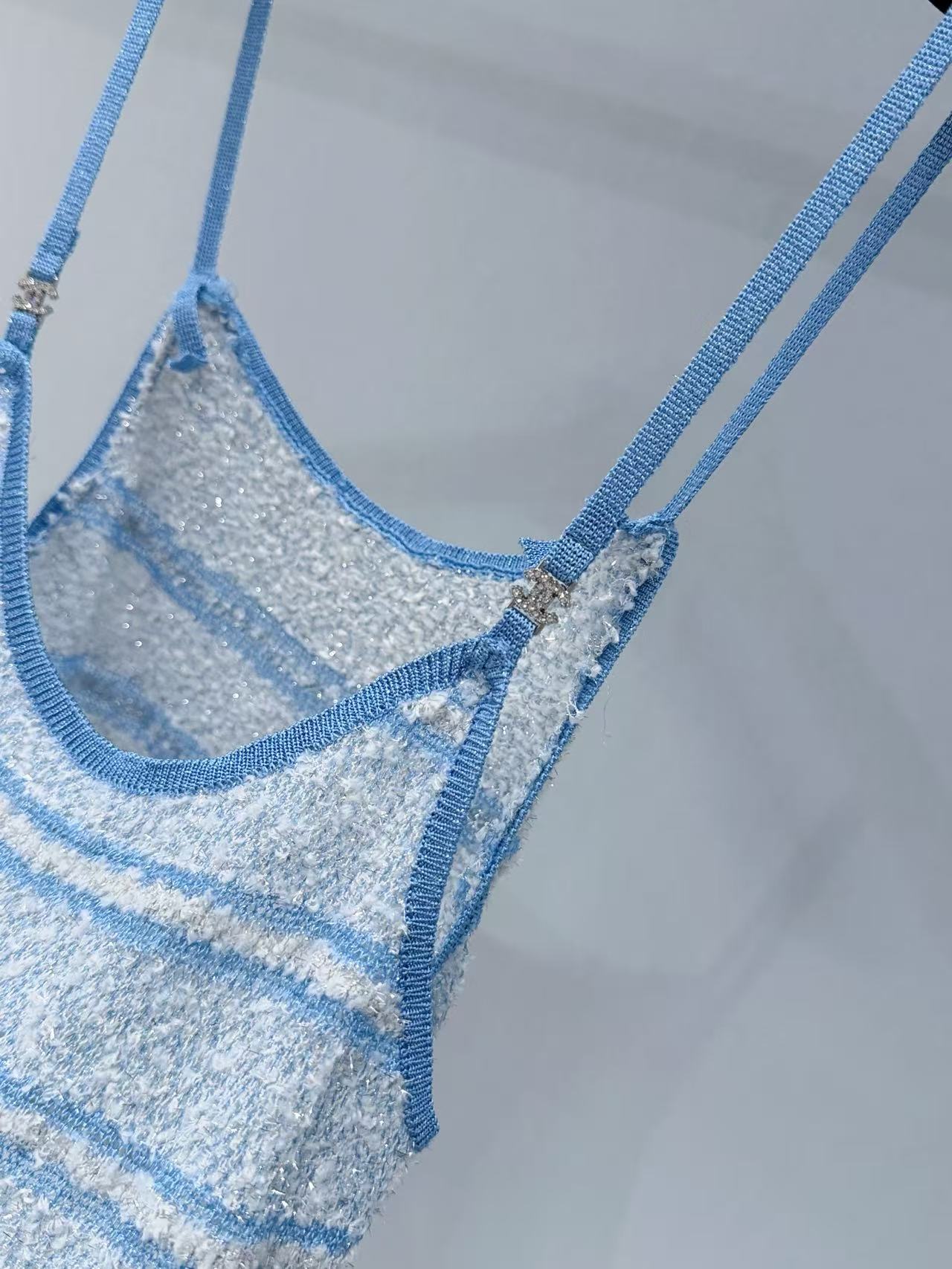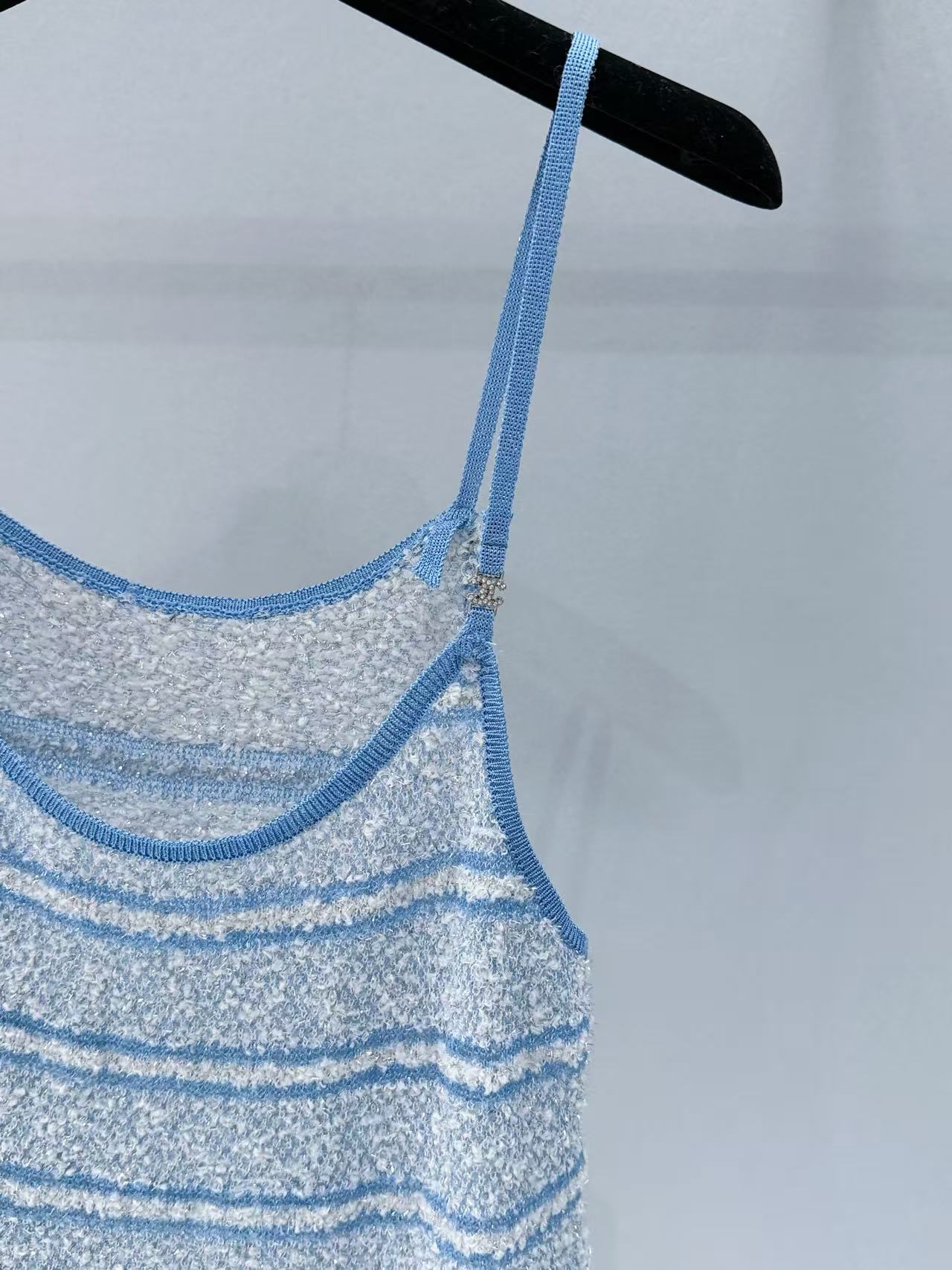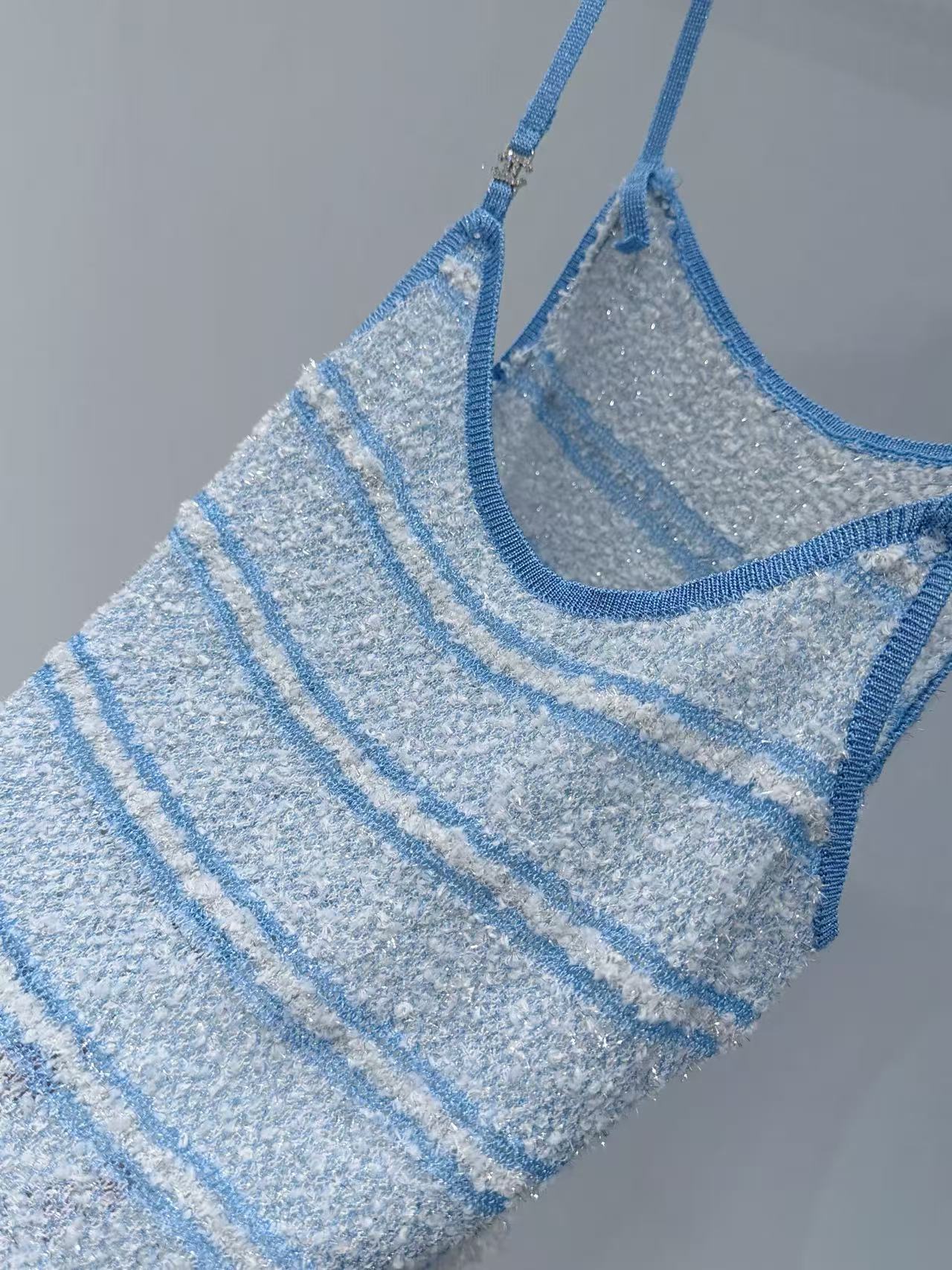 採用針織材質,融入銀線亮片,觸感柔軟又帶點閃耀光澤,藍白條紋設計清新亮眼,輕鬆營造出海邊度假的輕鬆氛圍。