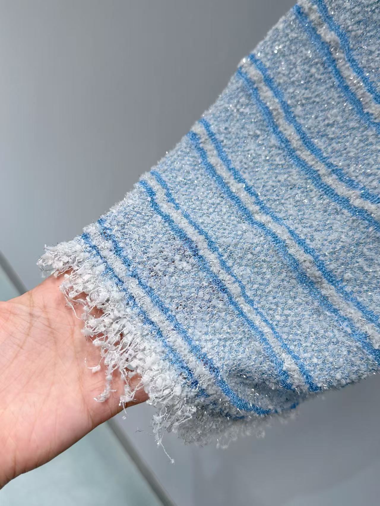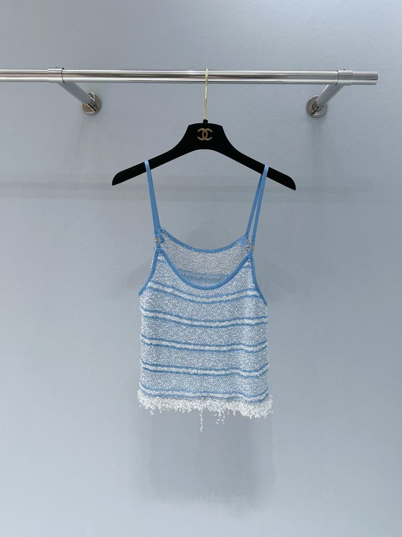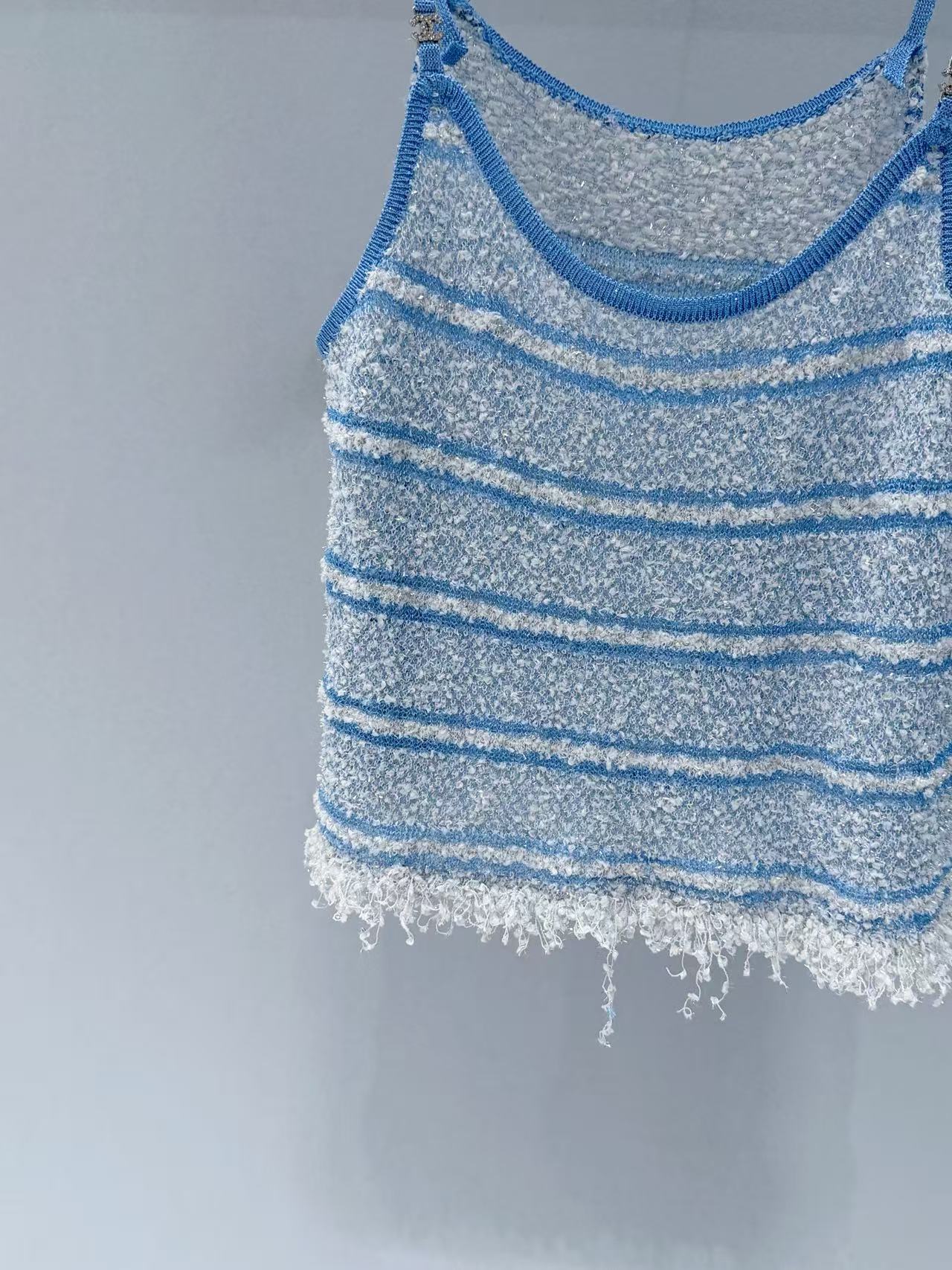 採用針織材質,融入銀線亮片,觸感柔軟又帶點閃耀光澤,藍白條紋設計清新亮眼,輕鬆營造出海邊度假的輕鬆氛圍。