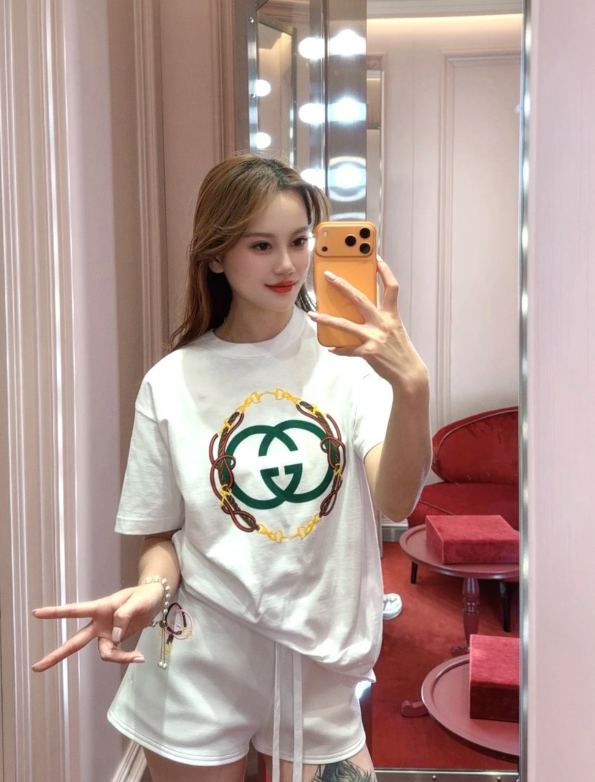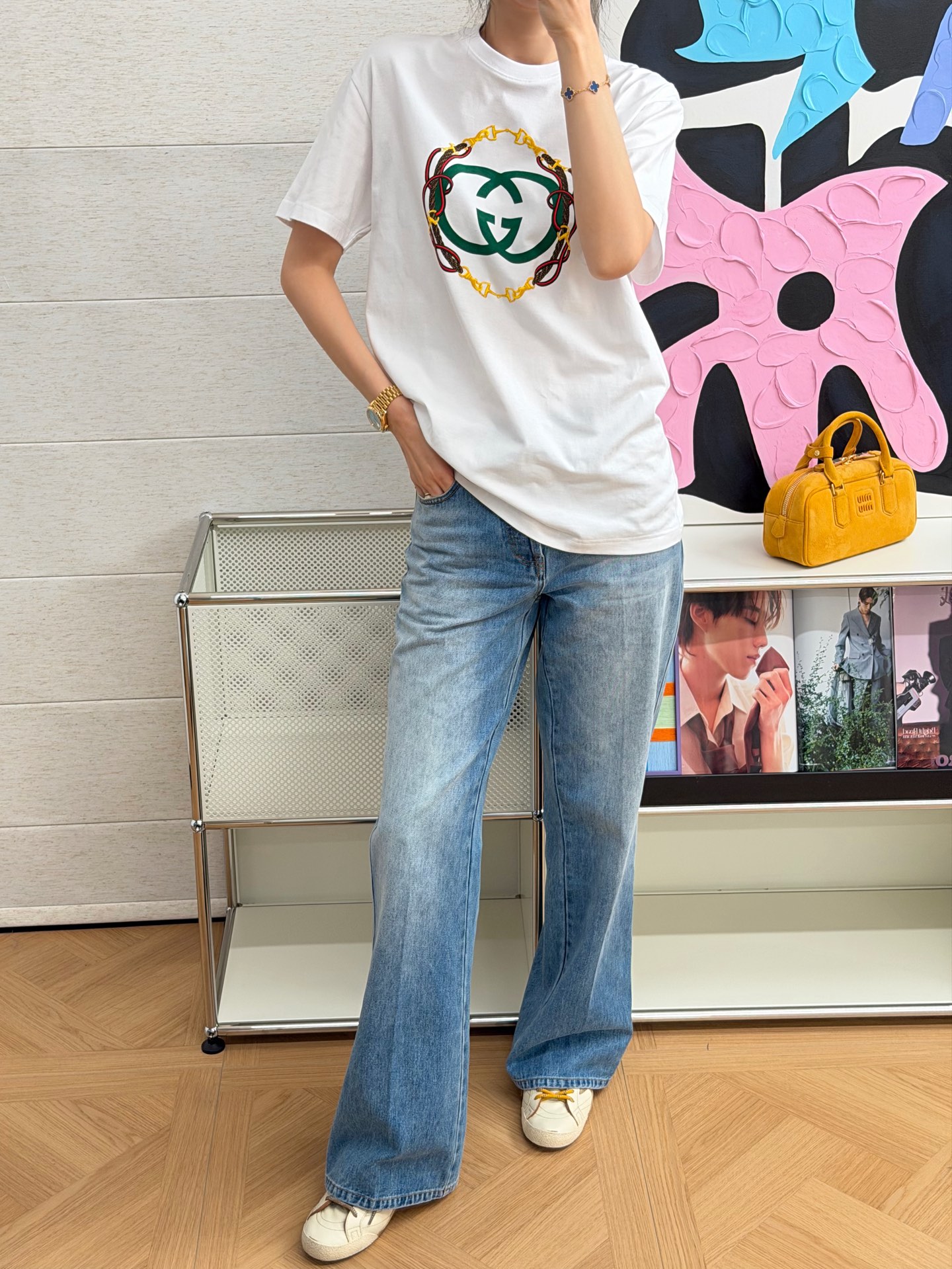 胸前的馬銜扣印花設計是整件的視覺重點,線條俐落、不過度張揚,卻能一眼看出質感與品味。