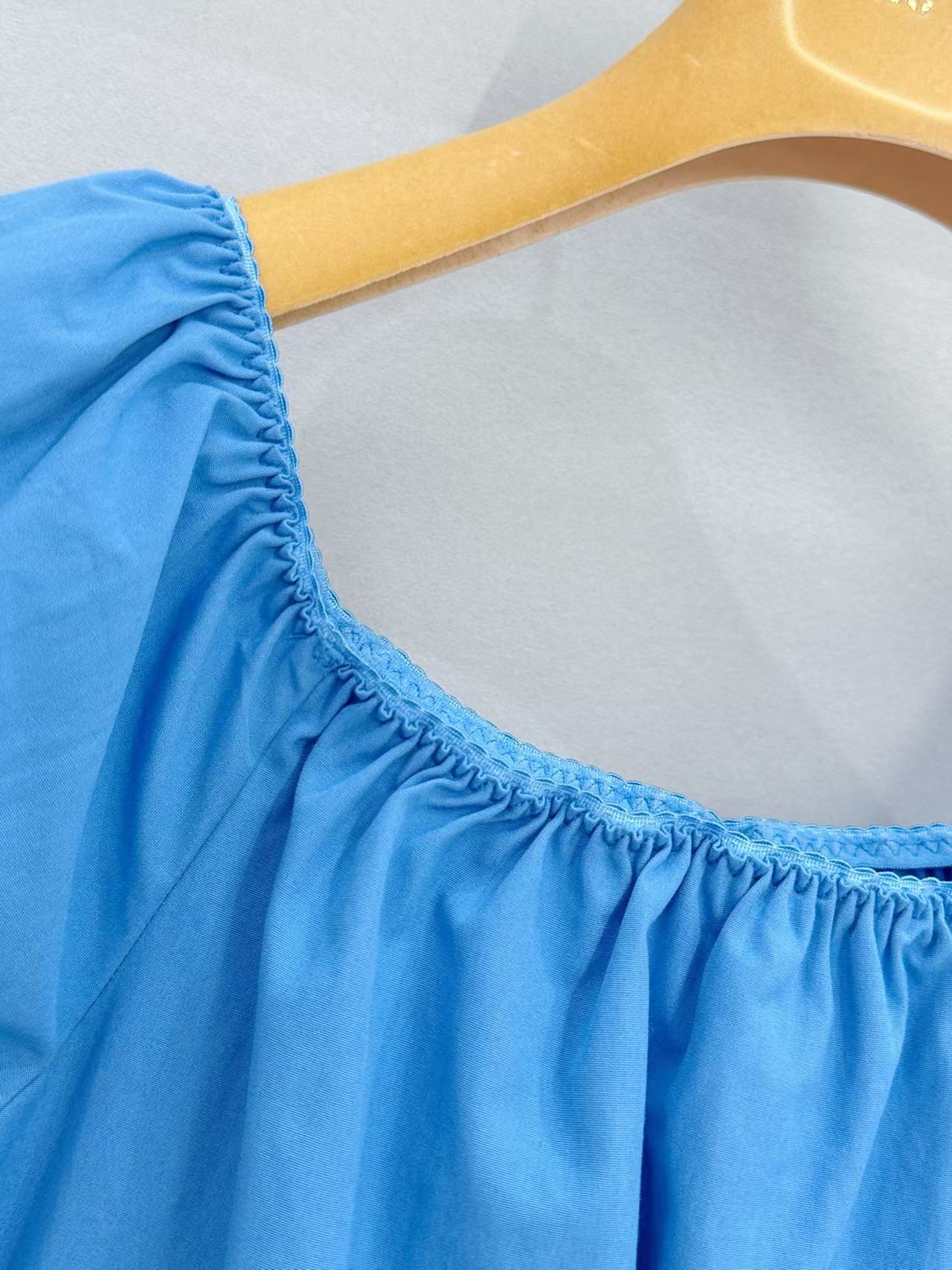 特供限定天藍定染材質: 為了還原 YB 那種清透不沈悶的藍色,面料經過多次對色定染。採用高品質的棉質混紡,手感乾爽輕盈且具備良好的挺度,確保泡泡袖的弧度立體不塌陷。