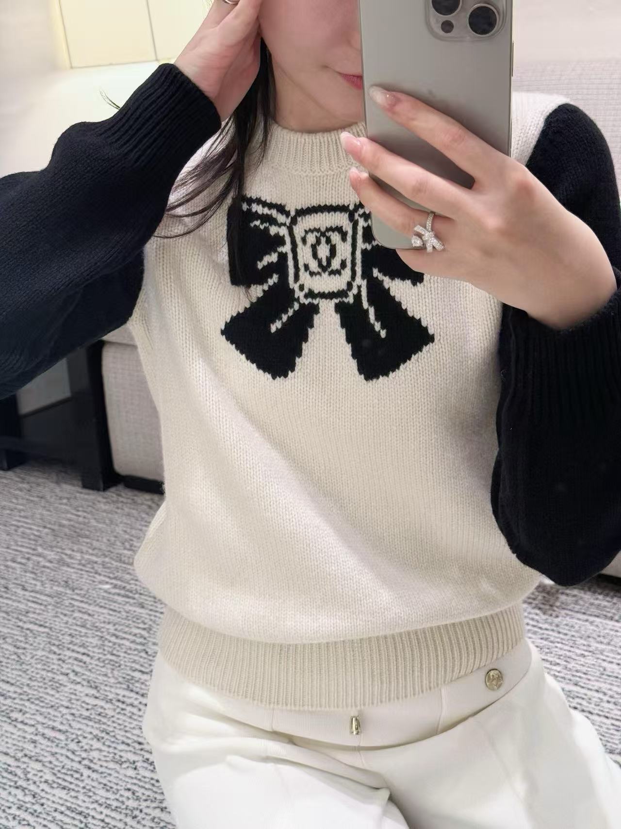 2025早秋 C家 黑色蝴蝶結提花羊絨毛衣