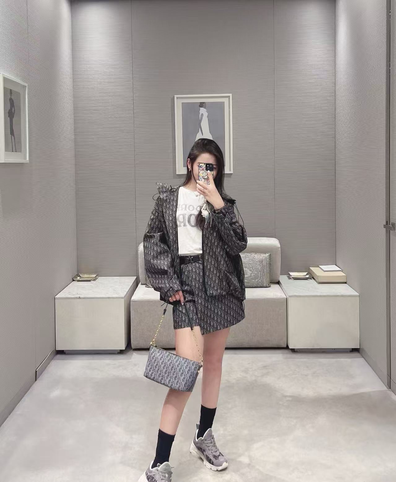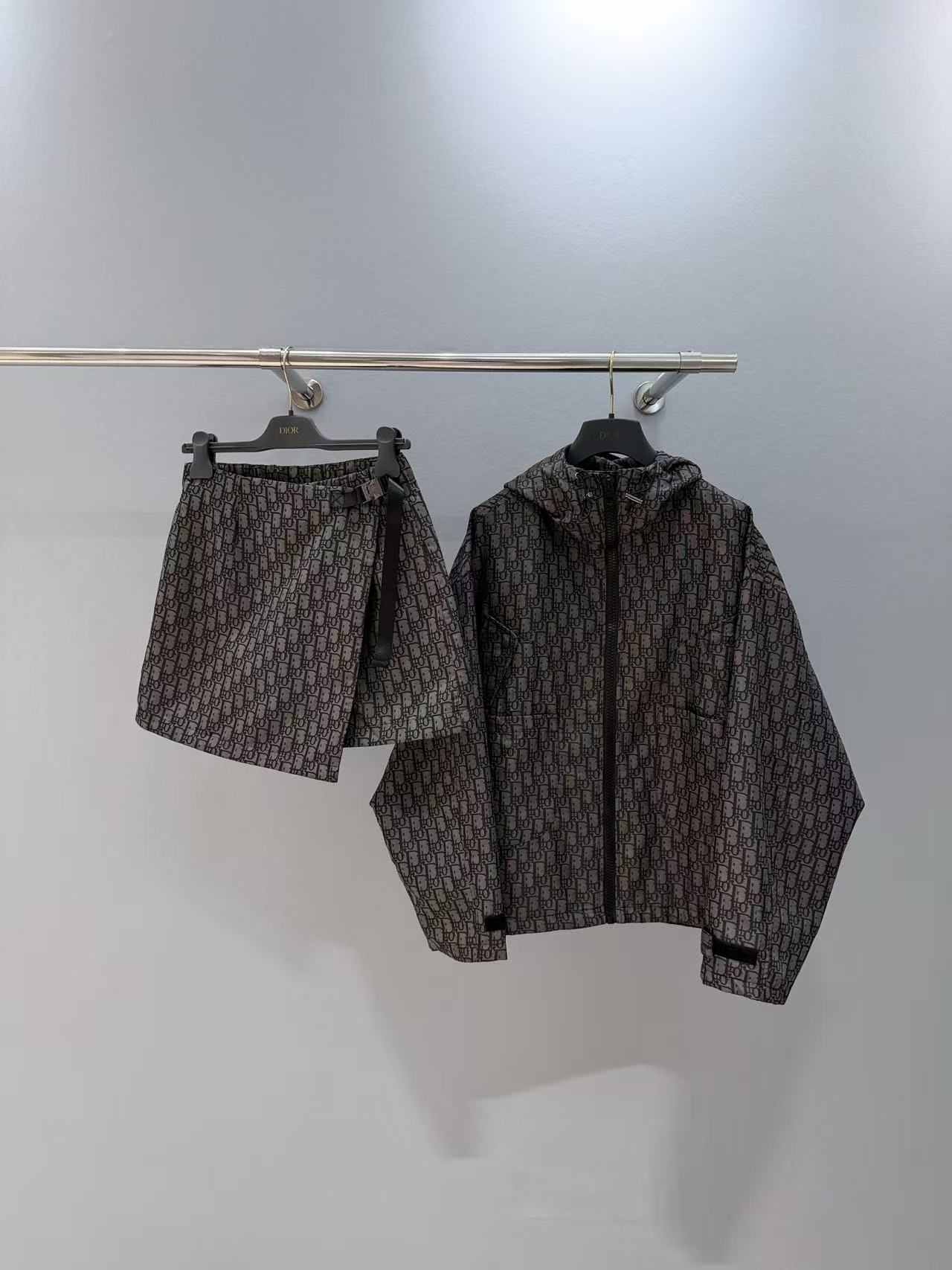 採用定制YB進口提花衝鋒材質,質感光澤挺括有型。滿版老錢感字母提花上下呼應;裙褲一片式側按扣固定,品牌徽標點綴潮流定位,一套即顯時髦洋氣