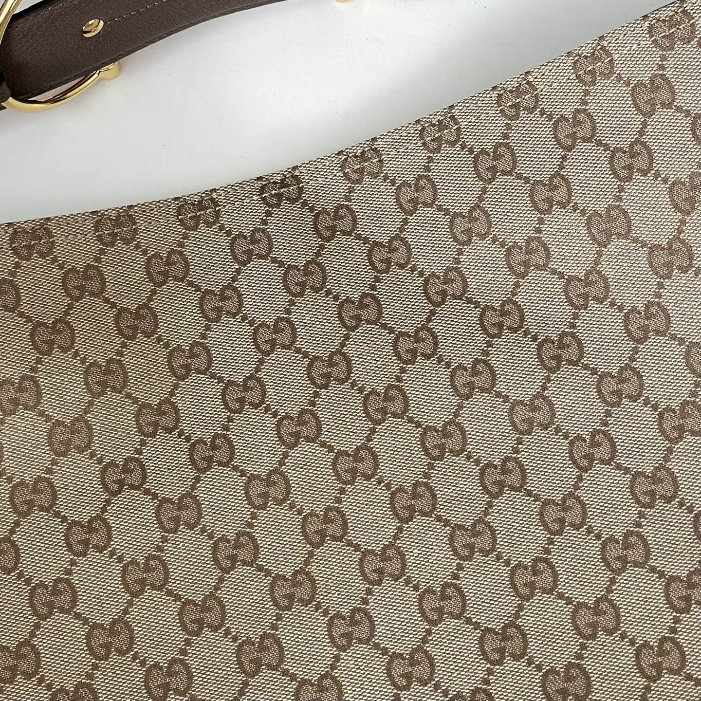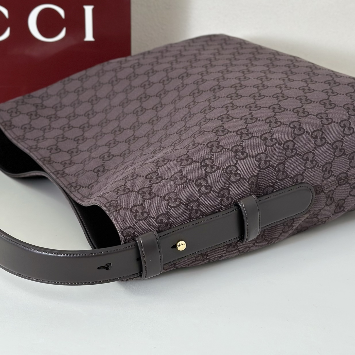 主體採用經典GG花紋帆布,質地堅韌耐磨,搭配細緻牛皮邊飾,整體更添高級層次。金色調五金件則為整體注入一抹溫潤亮點,讓整體設計更顯精緻與立體感。