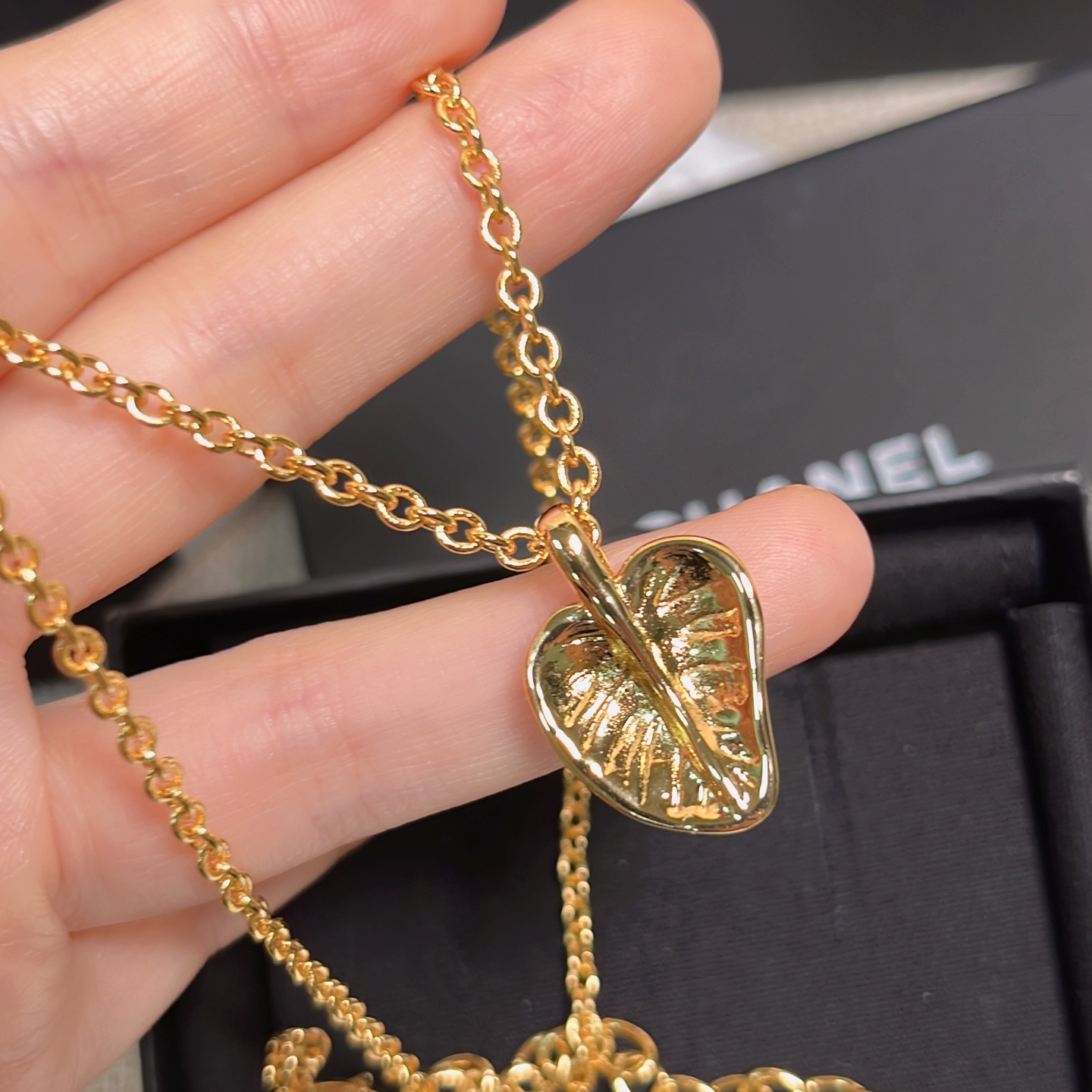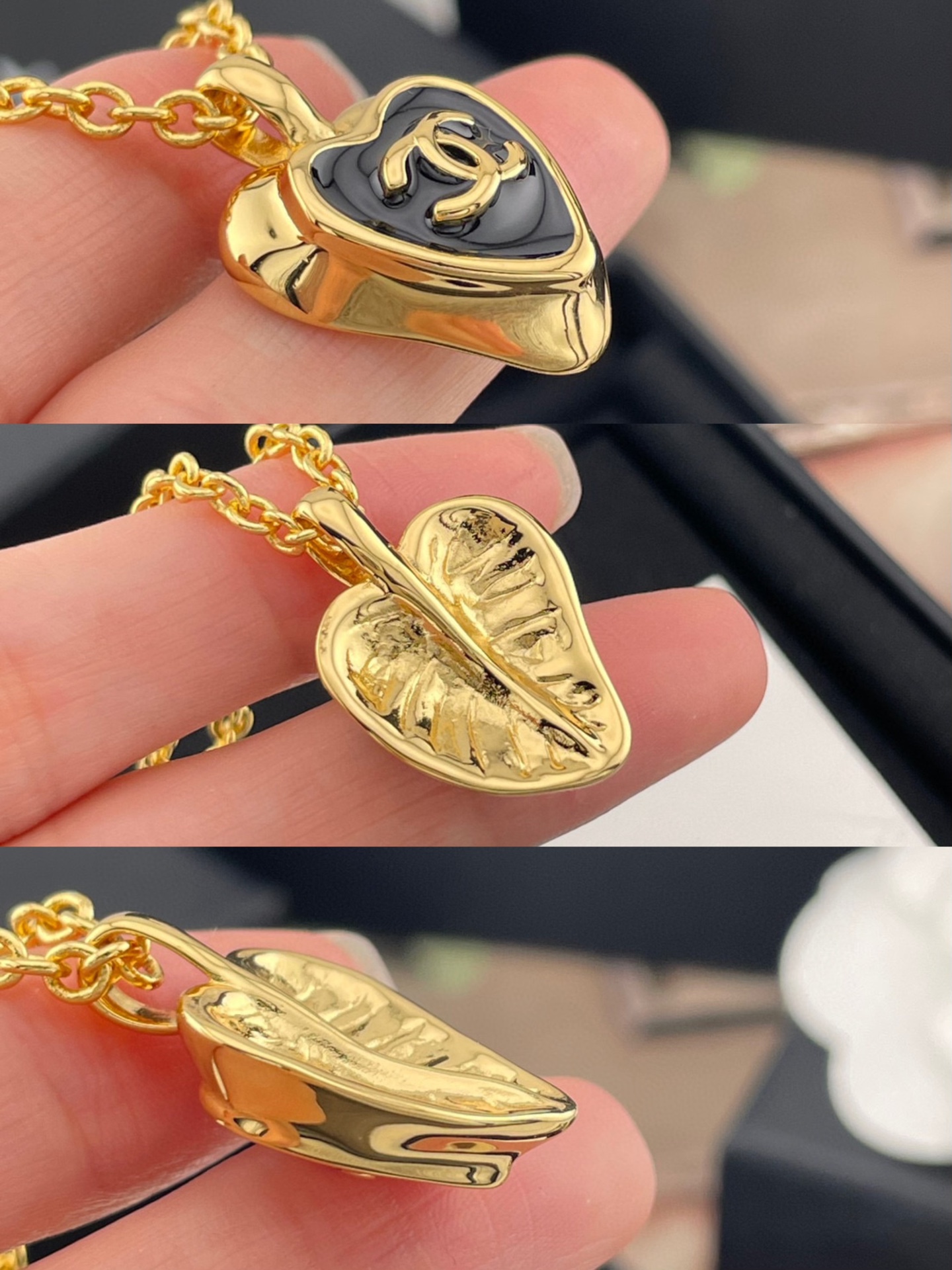 這款黑金愛心項鍊真的讓人一眼就愛上!整體工藝非常重工,細節精緻得讓人驚艷。不只是正面好看,連背面設計都用心到不行──葉子的造型立體自然,葉脈紋路清晰可見,彷彿一片真實的小葉子掛在胸前,完全展現對質感的堅持。