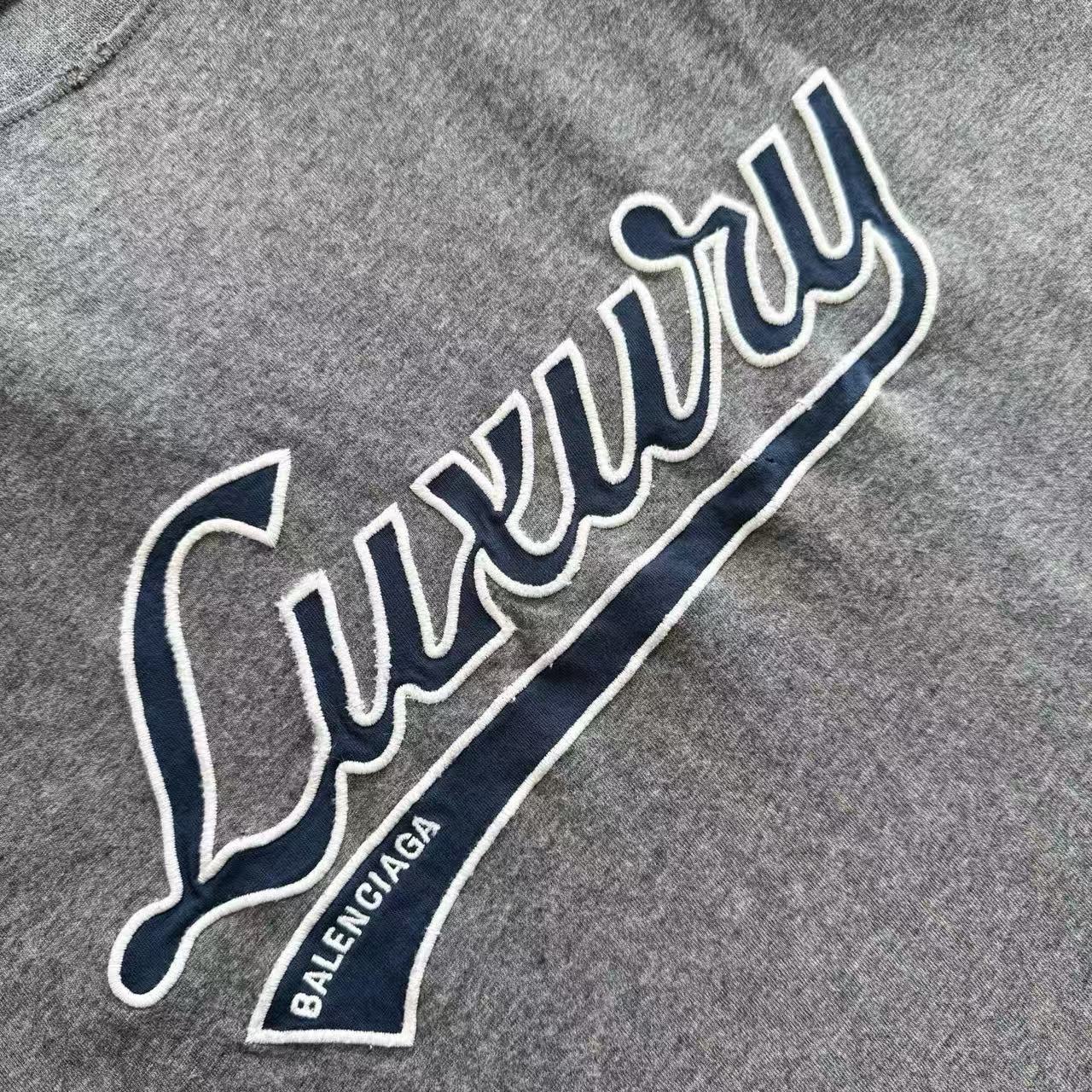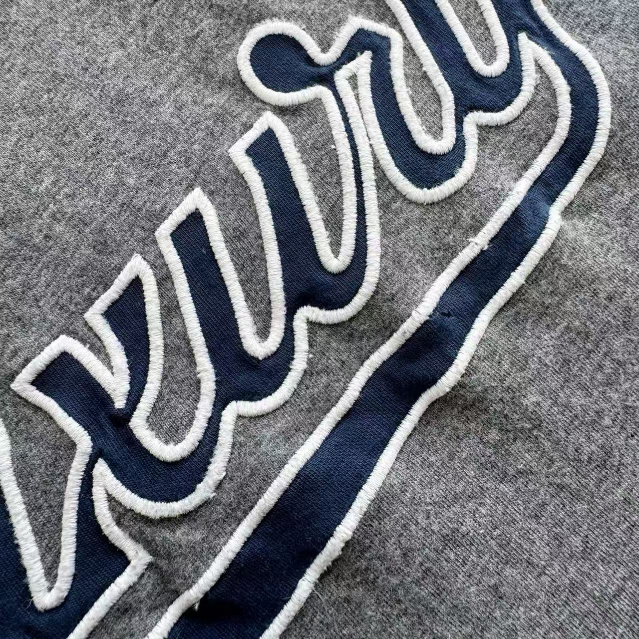 整件以極具存在感的 luxury script 藝術字體貼布刺繡 為視覺主軸,利用雷射切割貼布技術裁邊俐落無毛邊,再搭配磨損工藝與水洗仿舊處理,讓字樣邊緣呈現自然破損與立體起毛的效果,完美模擬出「舊得剛剛好」的街頭質感。