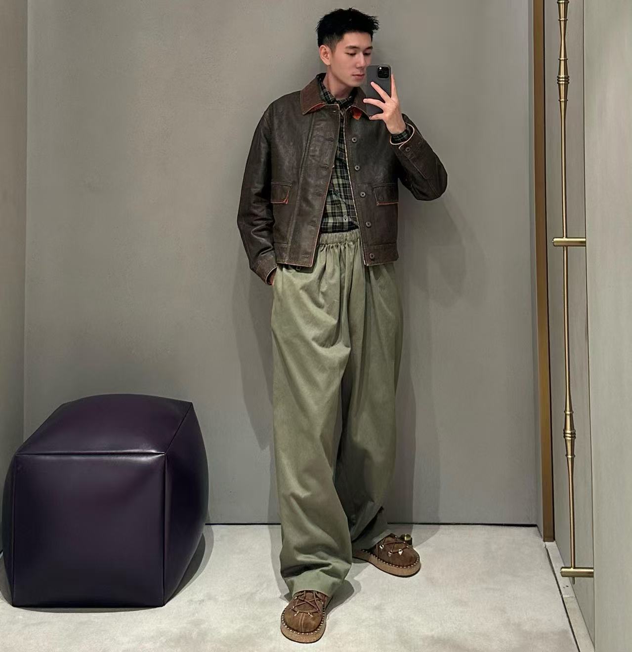 這件長褲的材質真的非常講究!它使用了高克重的棉質緞面材料,這種材質摸起來手感光滑、舒適,帶有一種高級的微光澤感,讓軍綠色看起來更有深度。