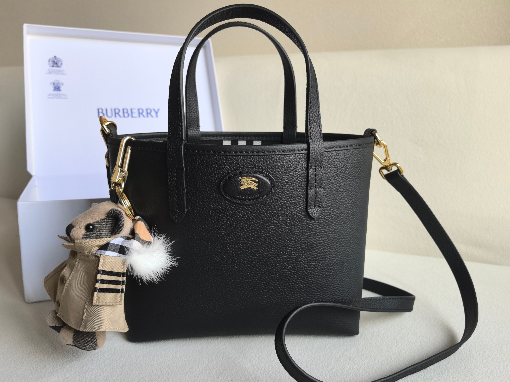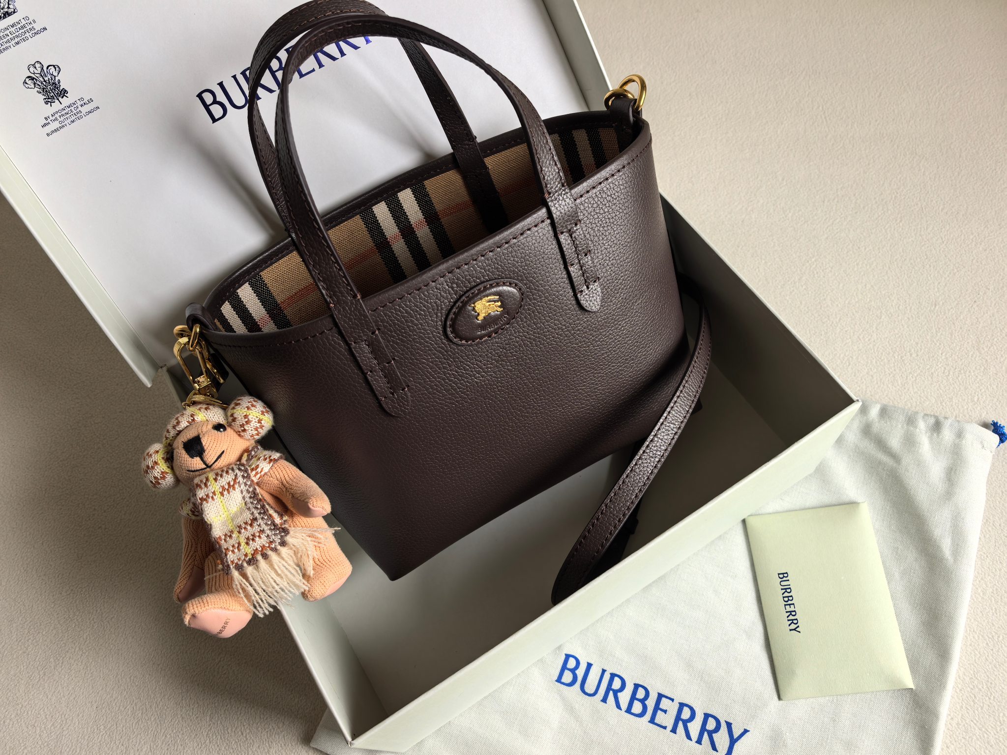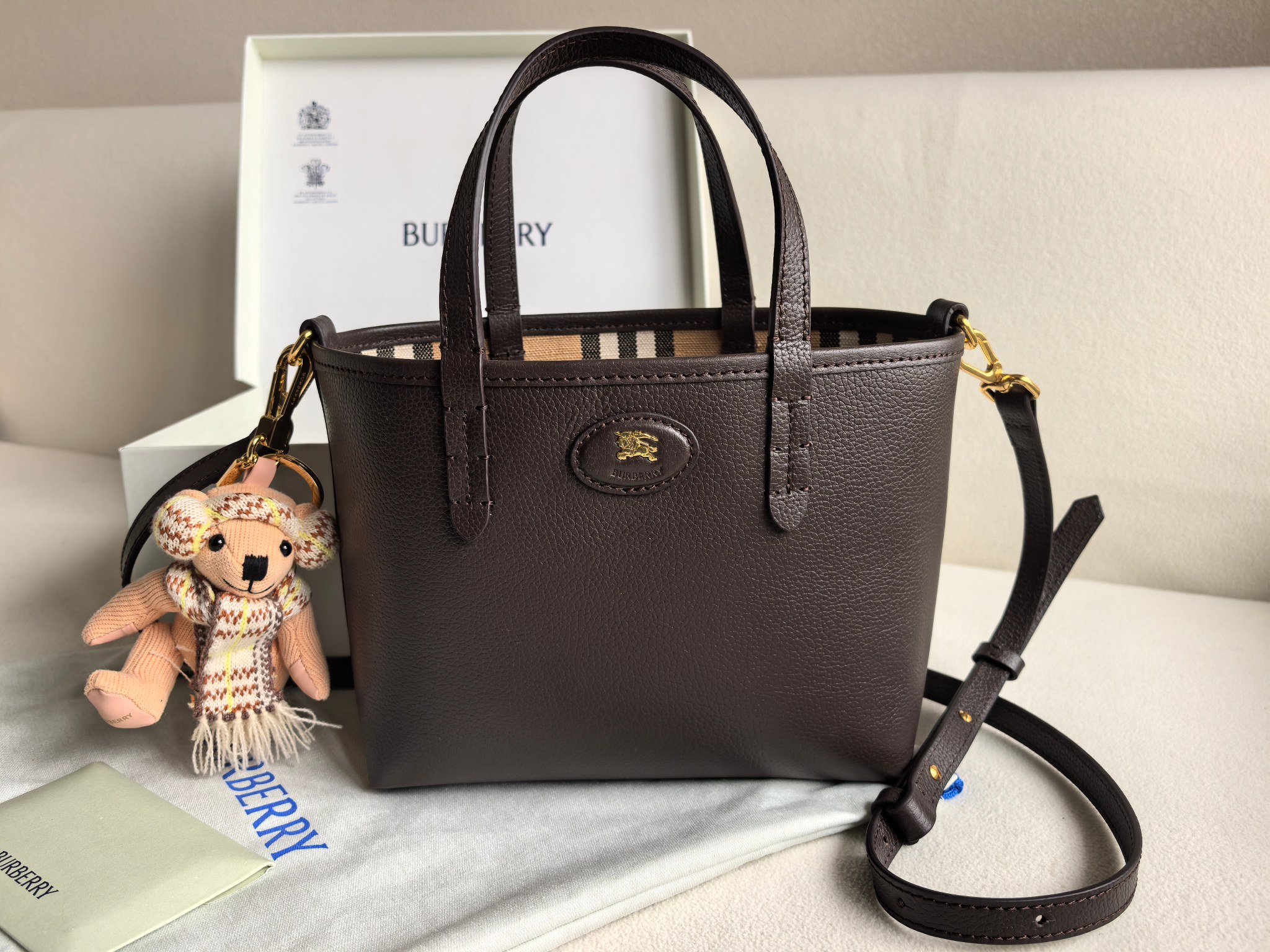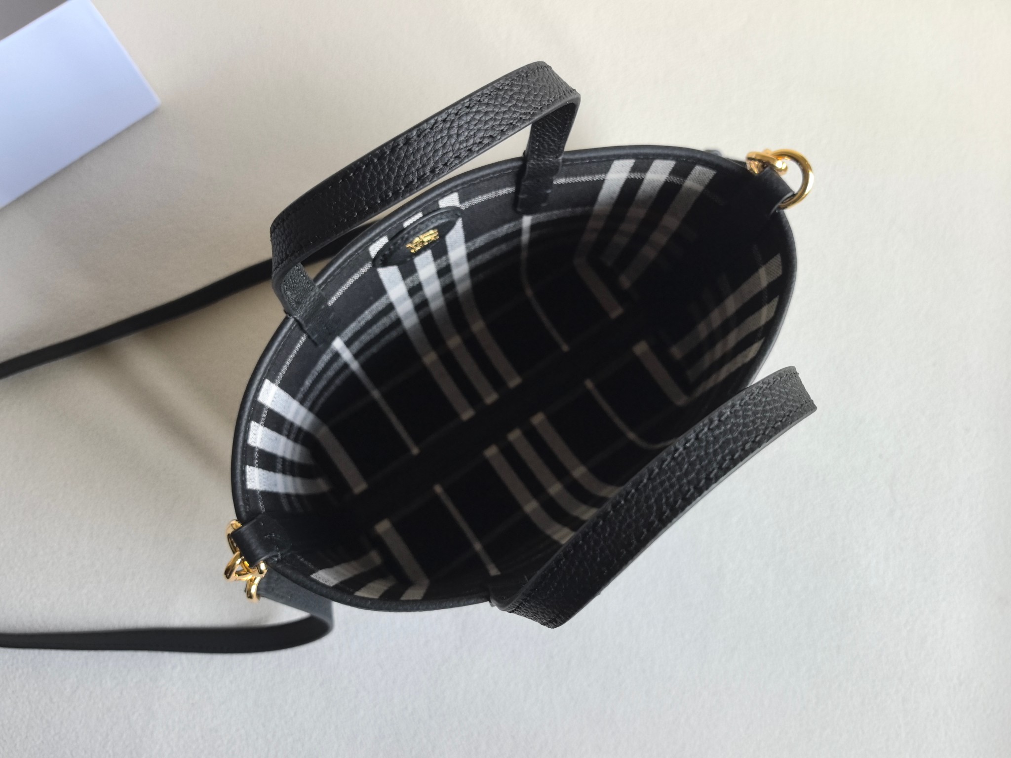 最加分的是它的雙面設計,一面是質感滿滿的粒紋皮革,另一面則是經典格紋拼接,等於一顆包直接擁有兩種風格,隨心情或穿搭切換,實用度真的很高。
