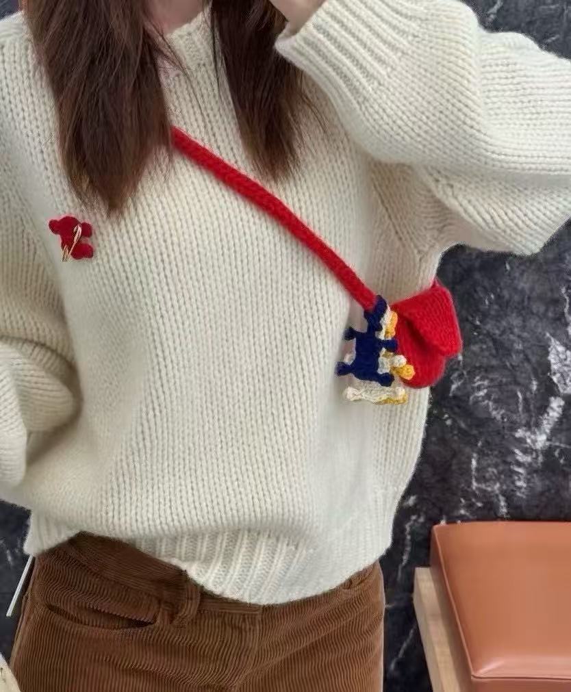 這件短款圓領毛衣簡約到極致,寬鬆袖口隨性優雅,胸前紅色凱旋門刺繡胸針可拆卸,想俏皮就別上、想低調就拿掉,百變玩法超上頭。