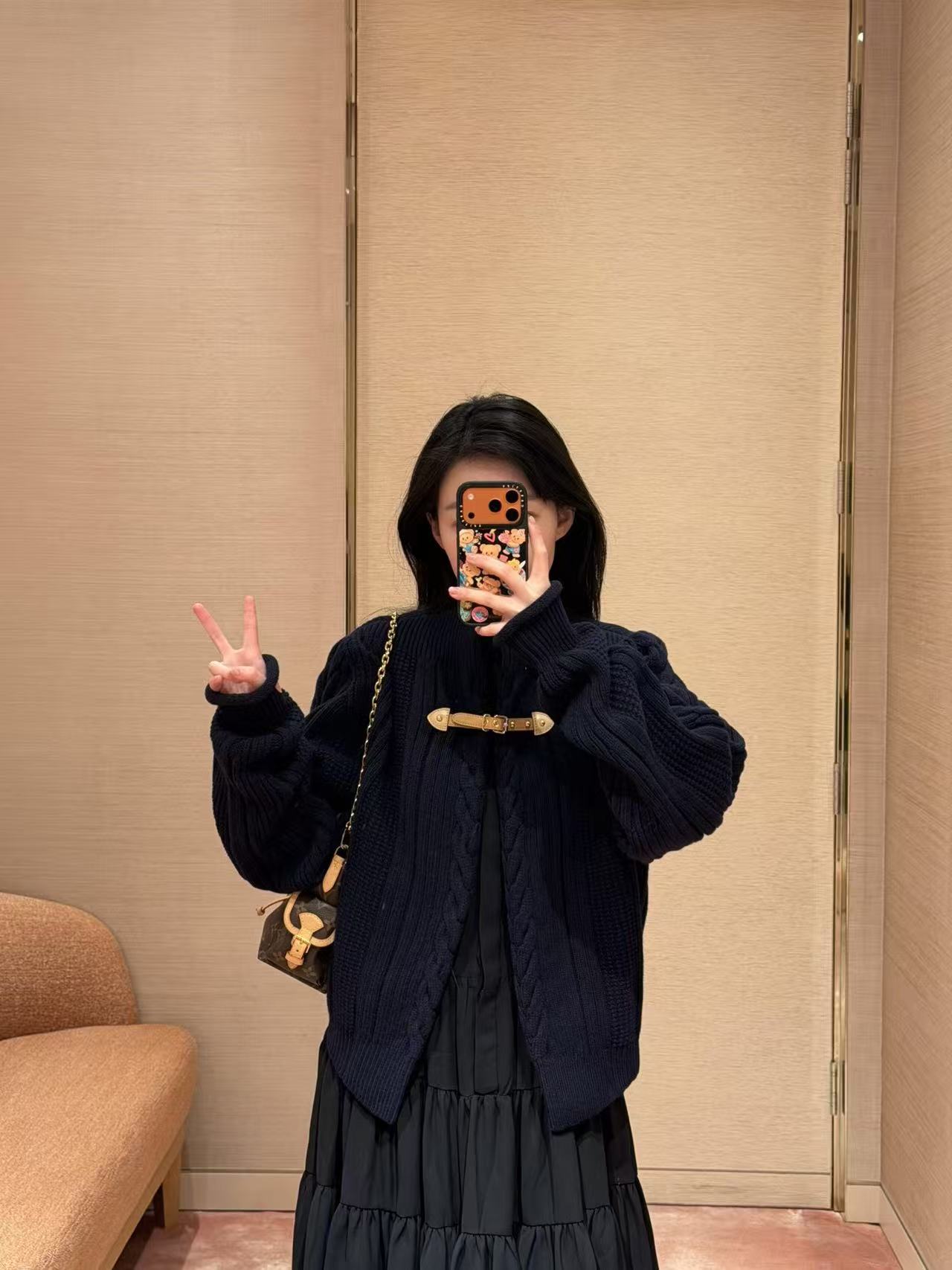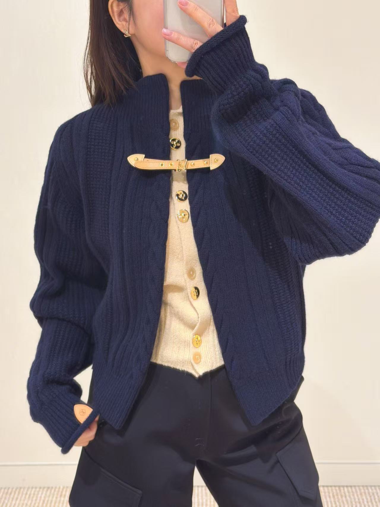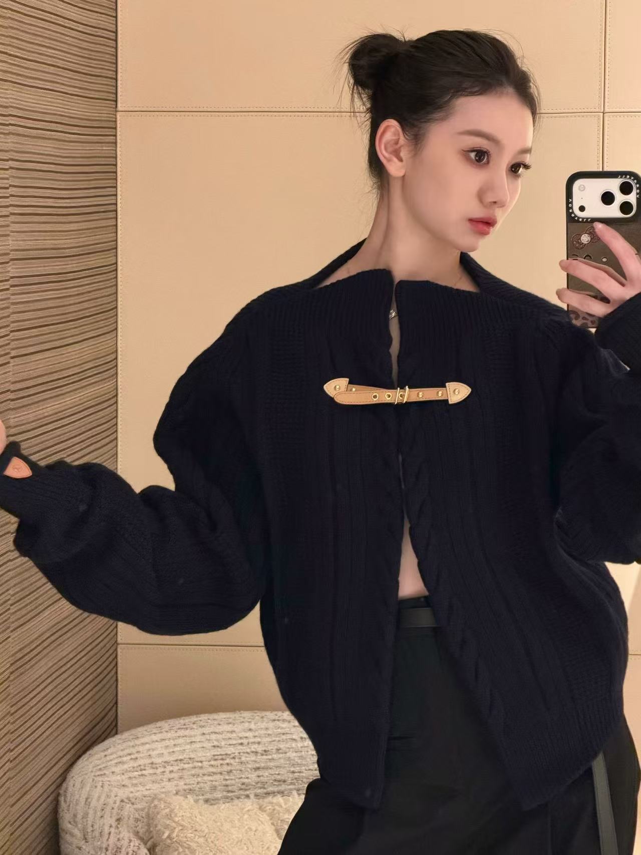 麻花紋理立體有層次,搭配皮扣設計超級精緻,袖口跟下擺的皮質點綴直接把細節拉滿,低調奢華感爆表。