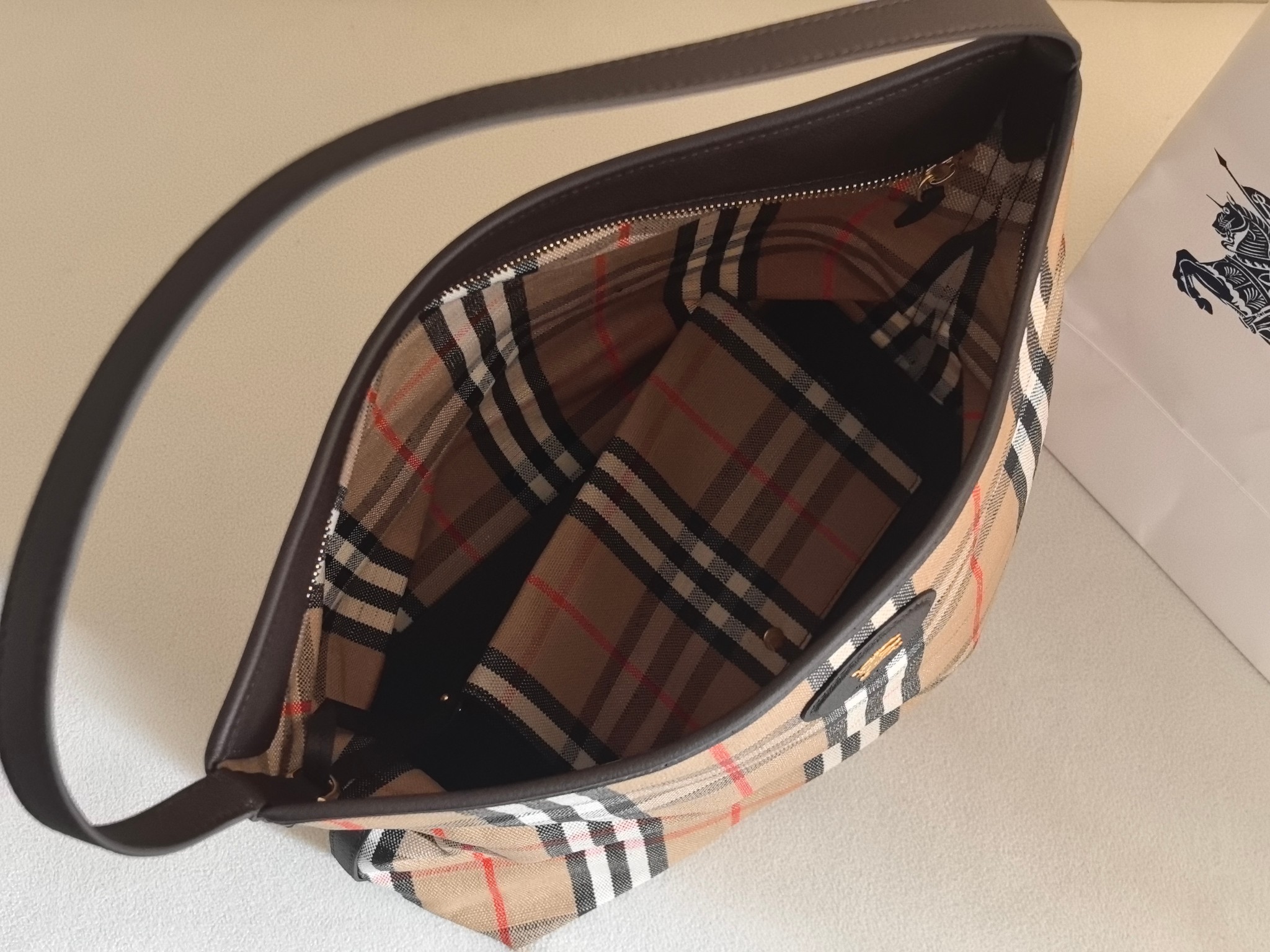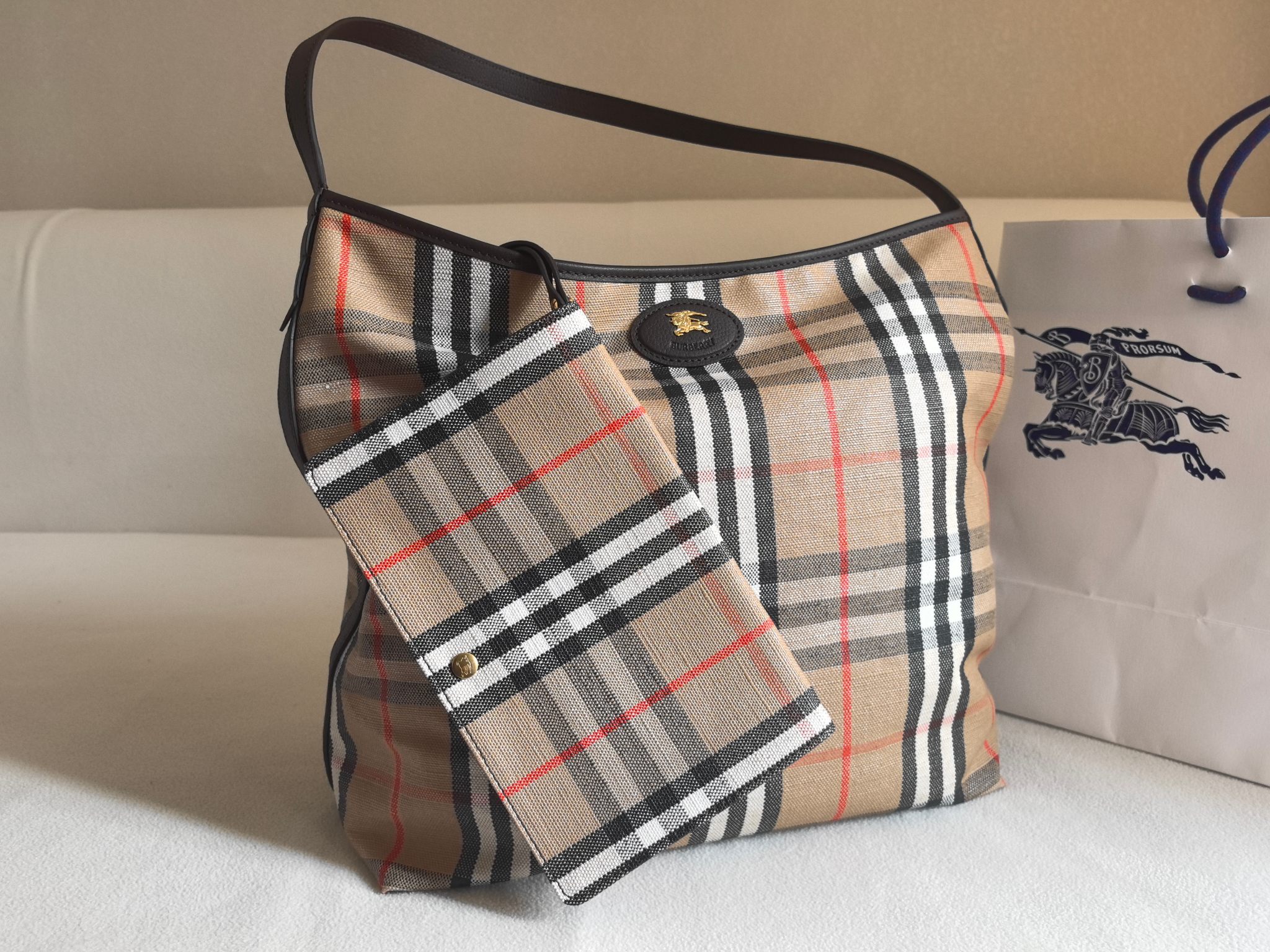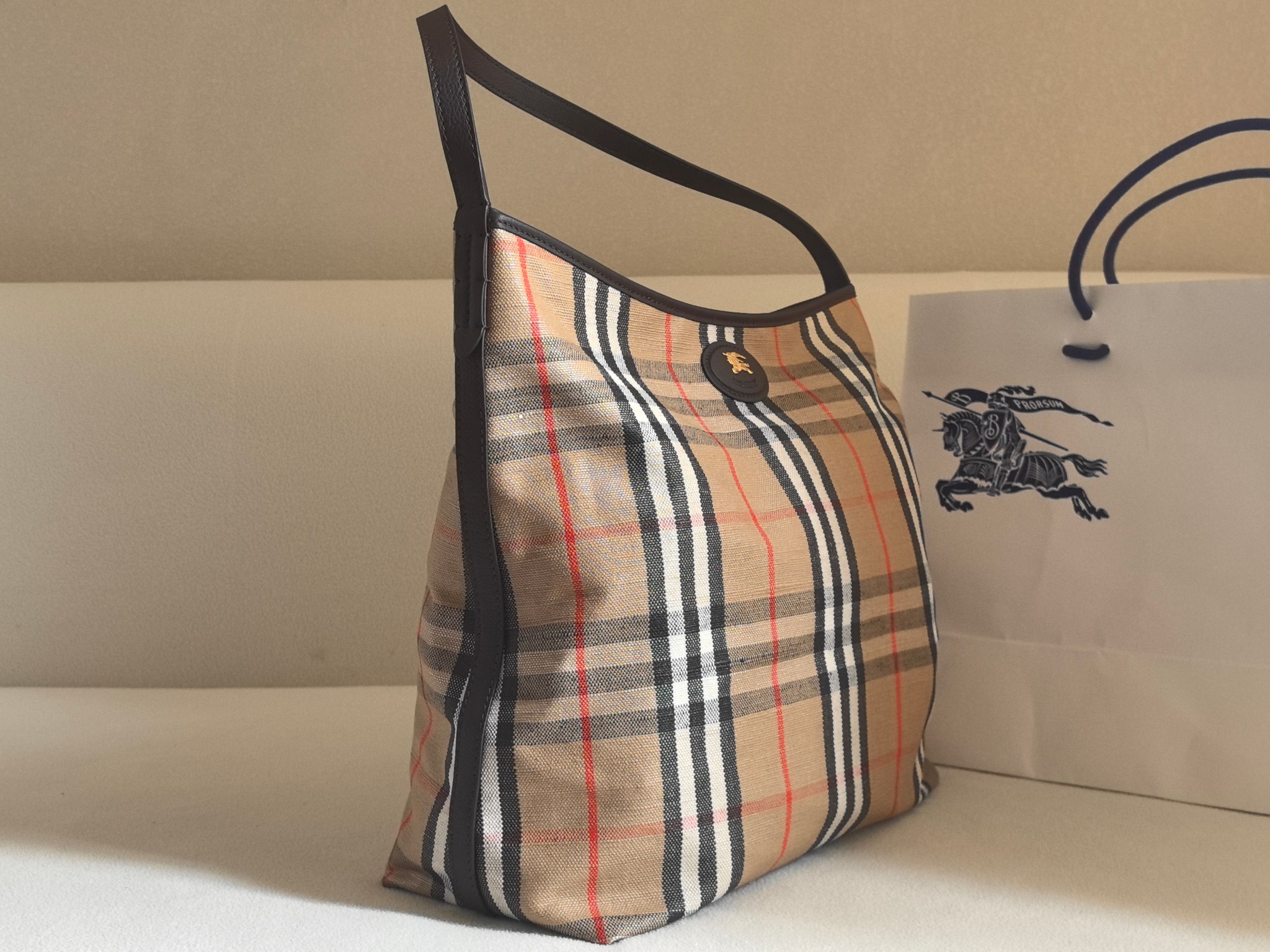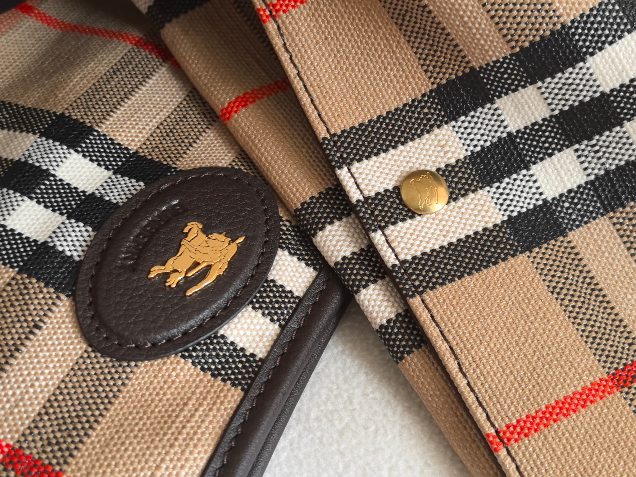經典 Bur 格紋以提花織法呈現,細節之處更顯工藝之美。風衣靈感的涂層處理,搭配騎士印章徽標皮革飾牌,處處都能看見對於傳承的堅持與對細節的講究。