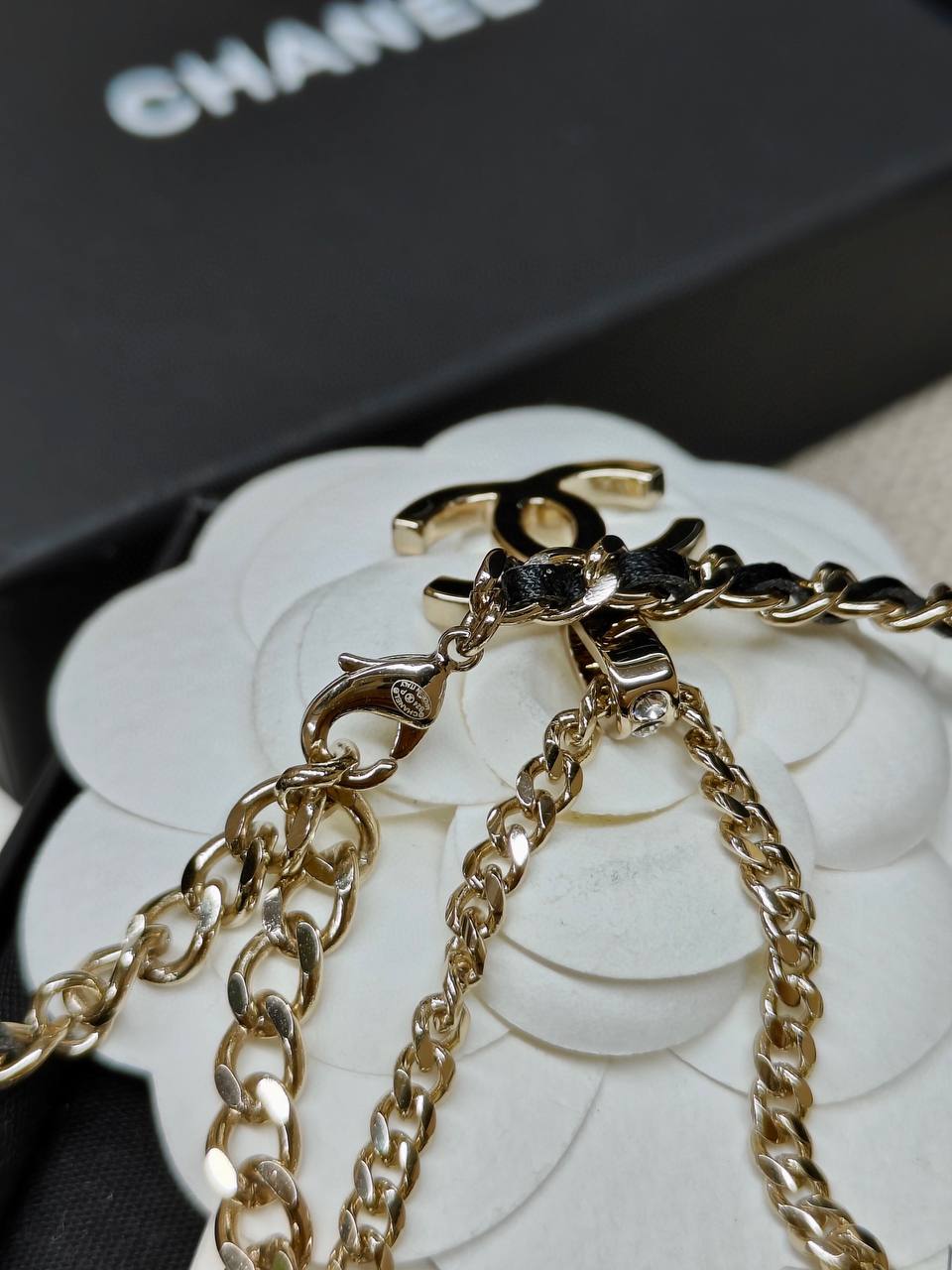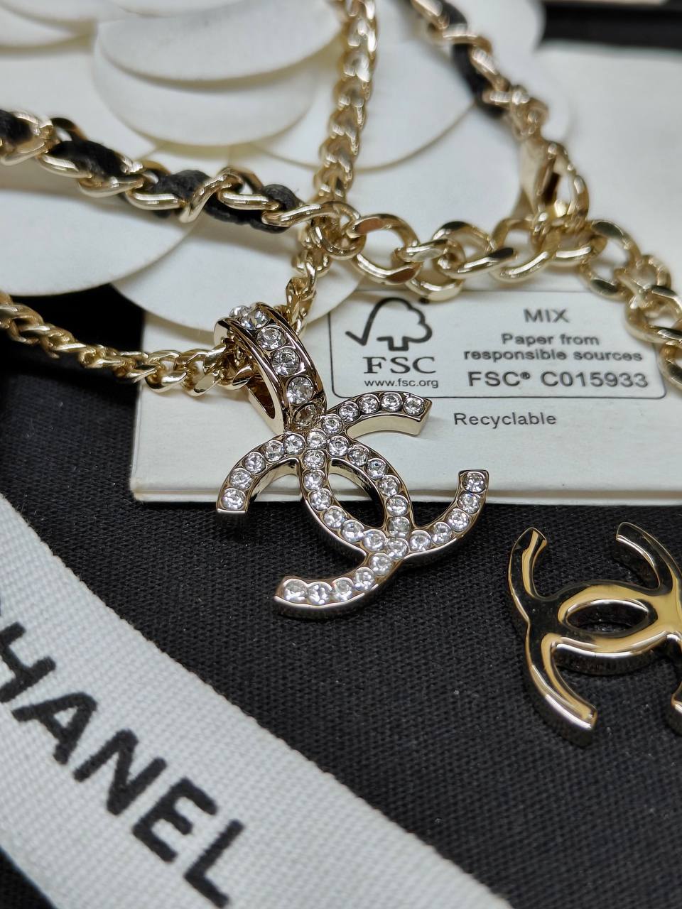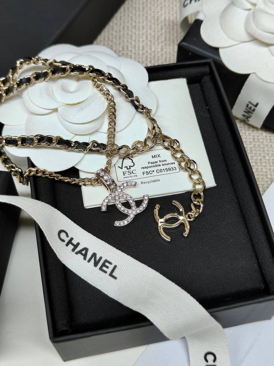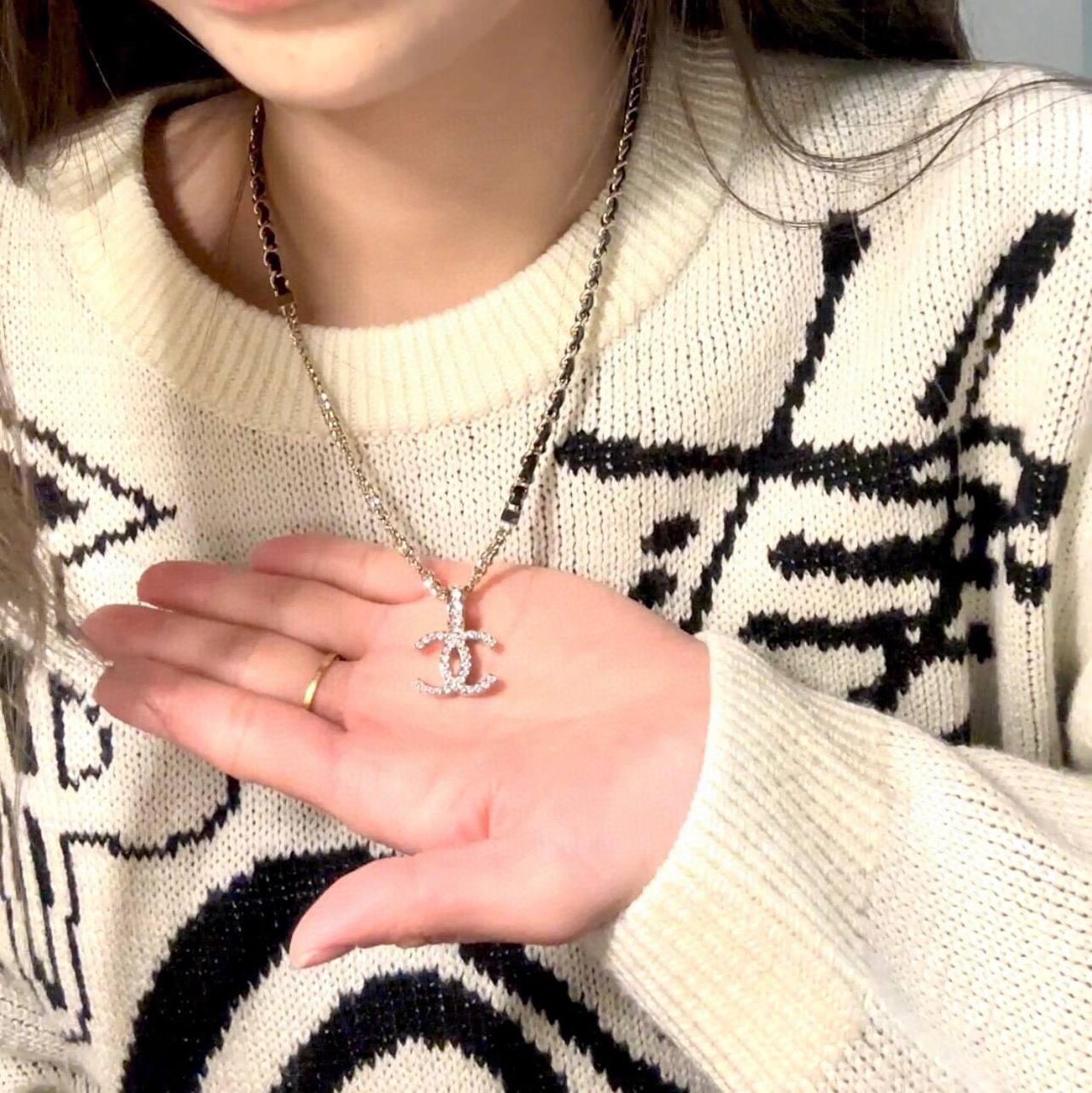 面鏈+經典雙C+穿皮設計時尚又百搭👍🏻非常高級重工❣️配件全部需要定制,上邊的鑽是施華洛水晶,尾鍊長短可調節,整套入,上身氣質超美膩,可鹽可甜,可純可欲的時尚風!