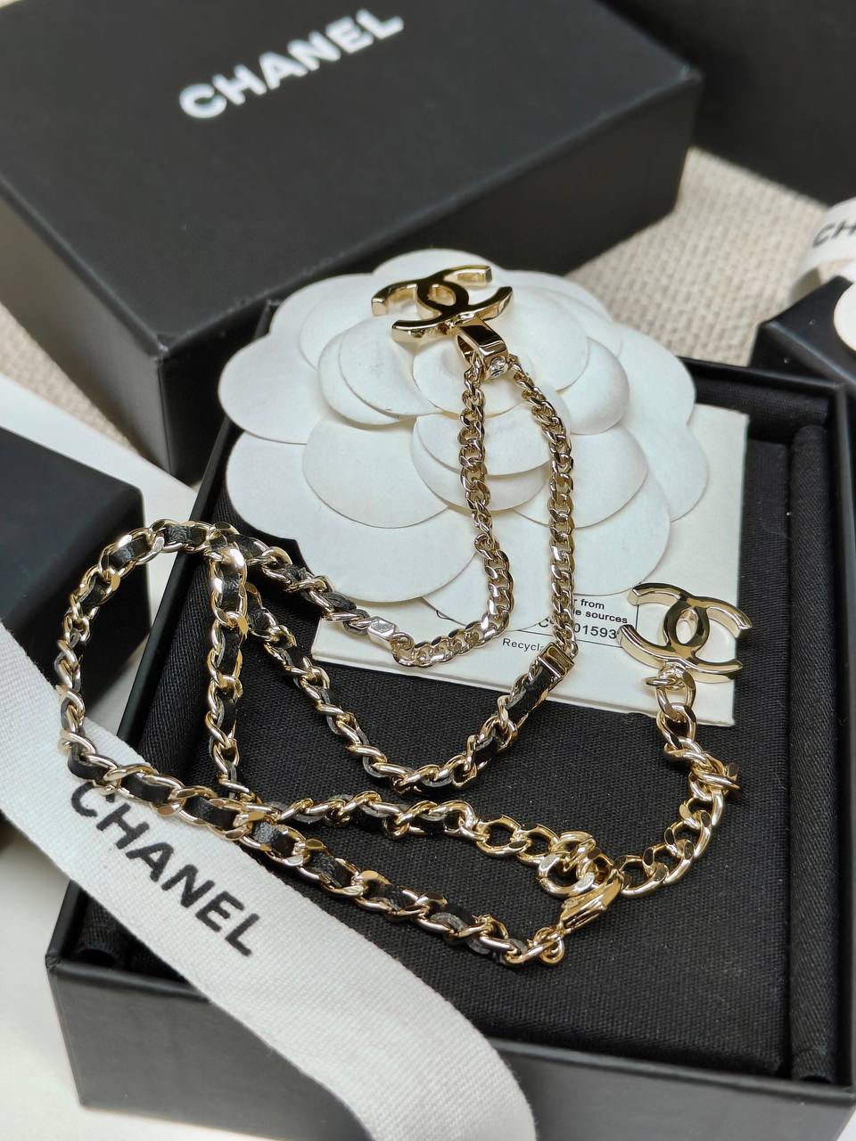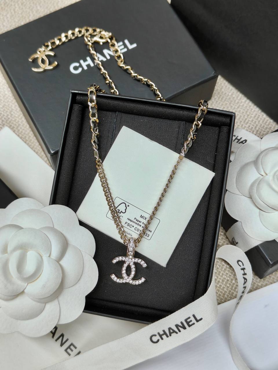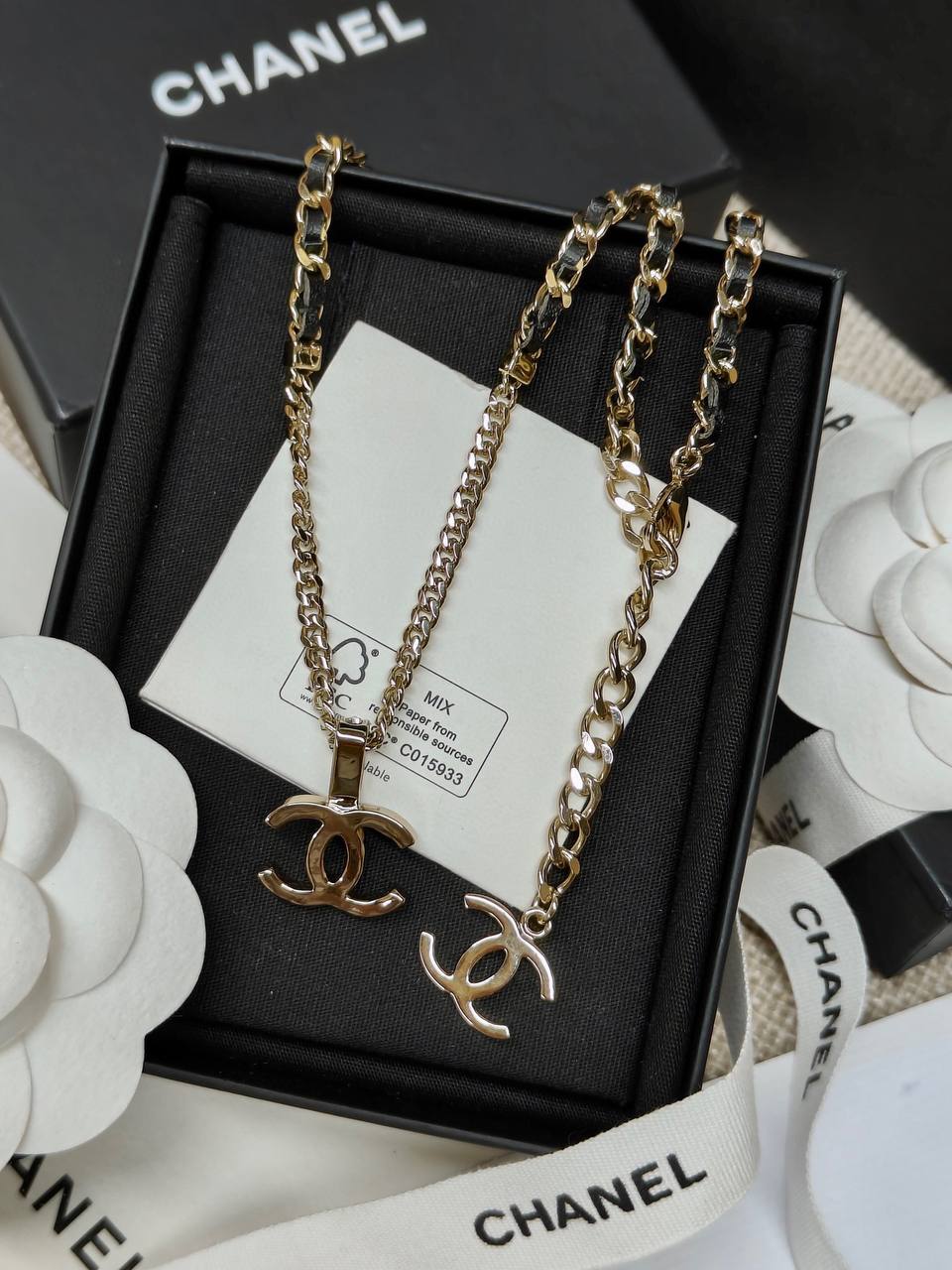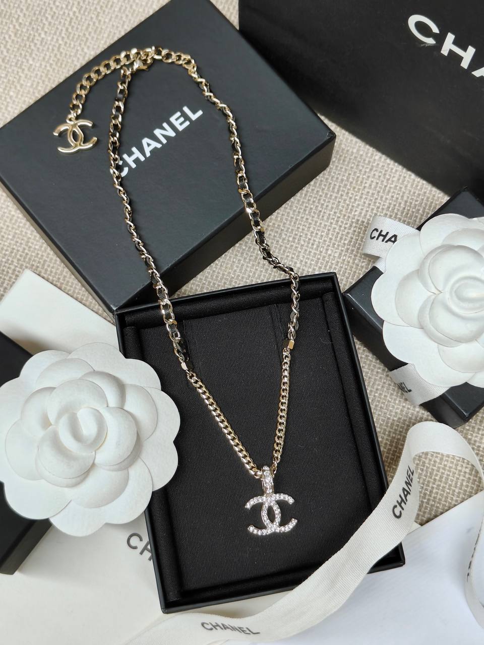 面鏈+經典雙C+穿皮設計時尚又百搭👍🏻非常高級重工❣️配件全部需要定制,上邊的鑽是施華洛水晶,尾鍊長短可調節,整套入,上身氣質超美膩,可鹽可甜,可純可欲的時尚風!