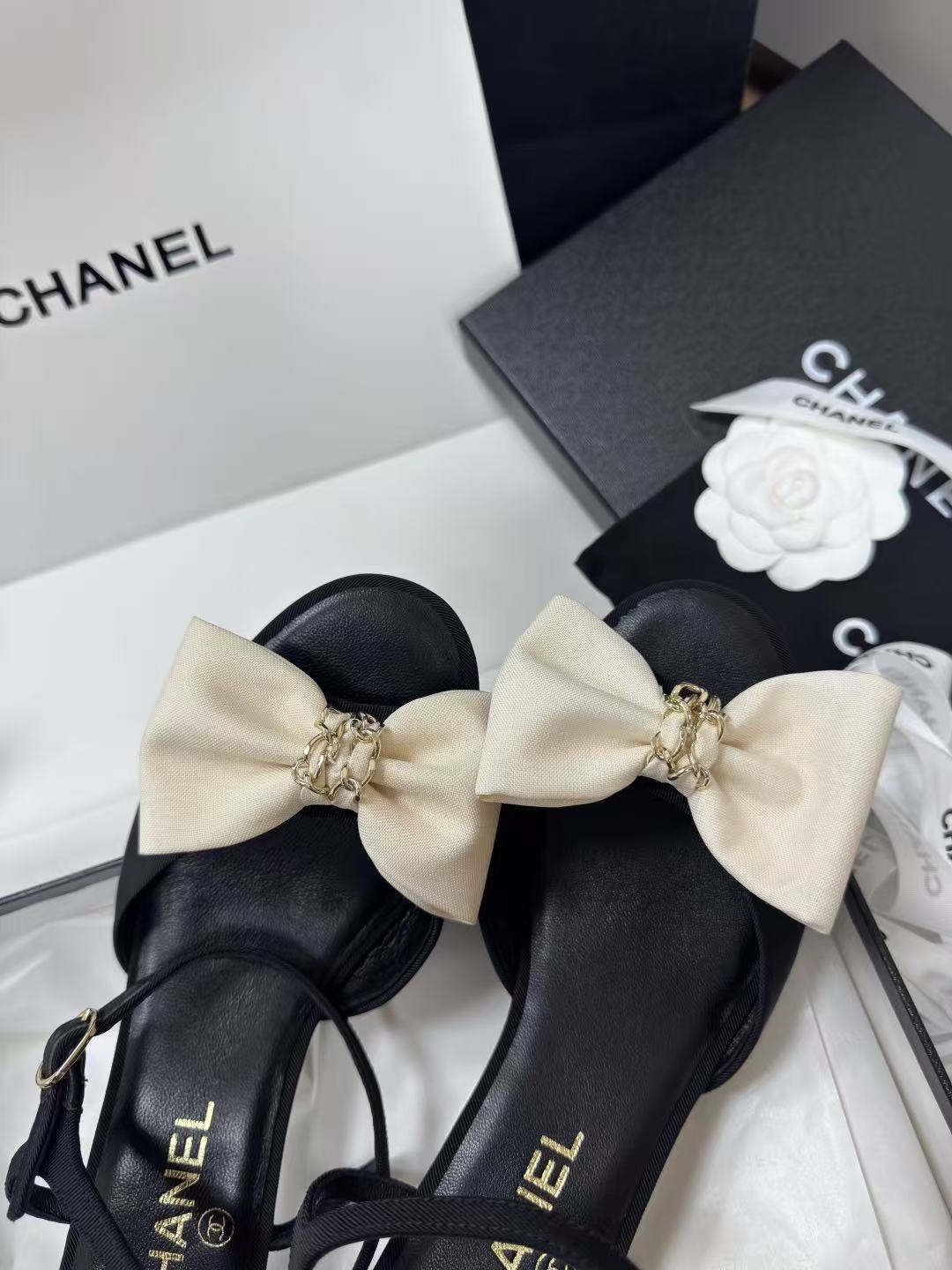 設計核心聚焦於鞋面中央那抹立體的米白色緞面大蝴蝶結,中心更巧妙點綴了品牌標誌性的金色鍊條裝飾。這種黑白對比的經典配色,將法式優雅與復古高級感揉合得恰到好處,是本季最具辨識度的靈魂單品之一。