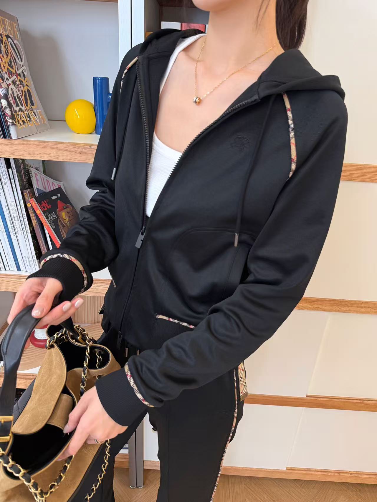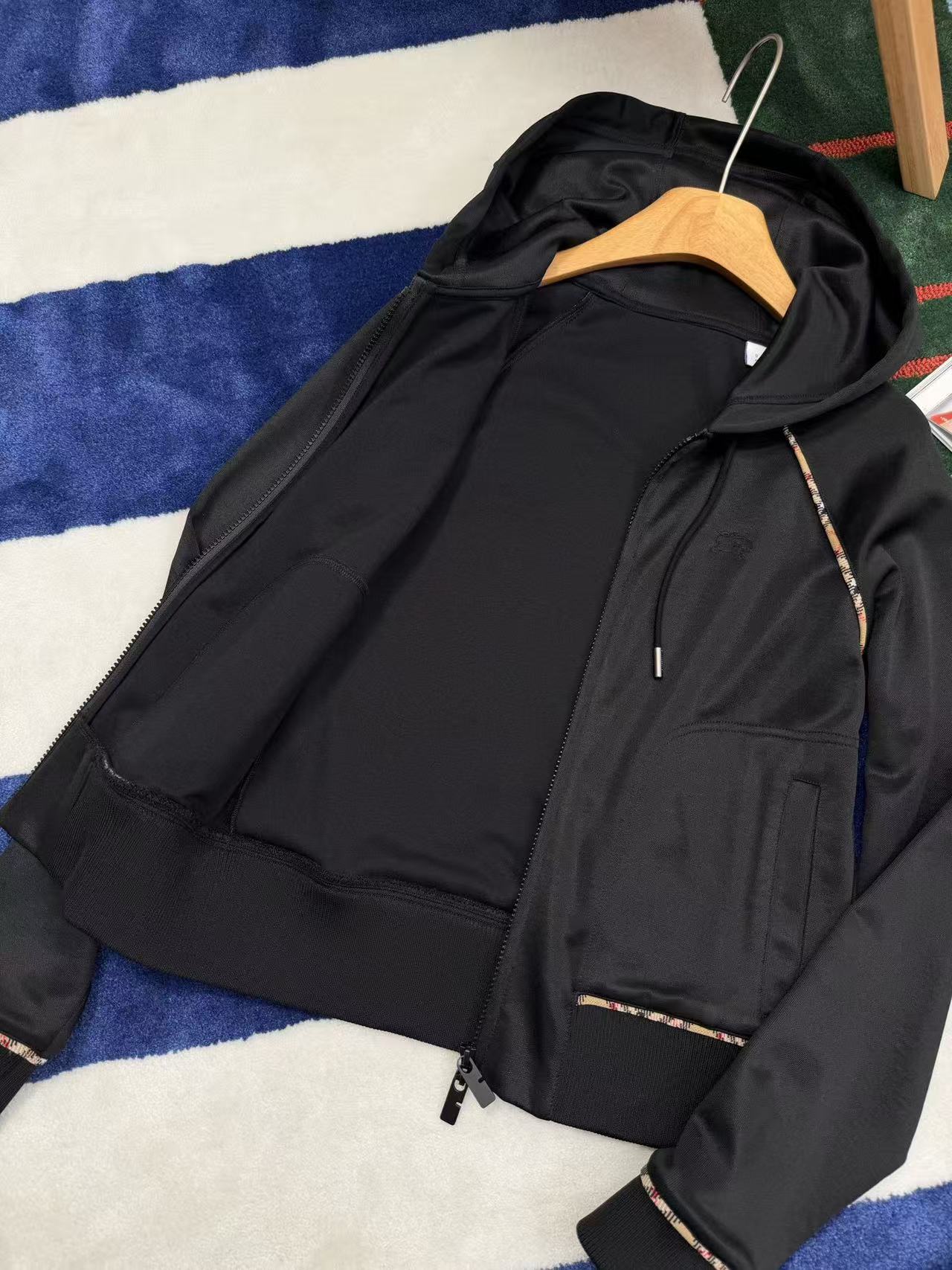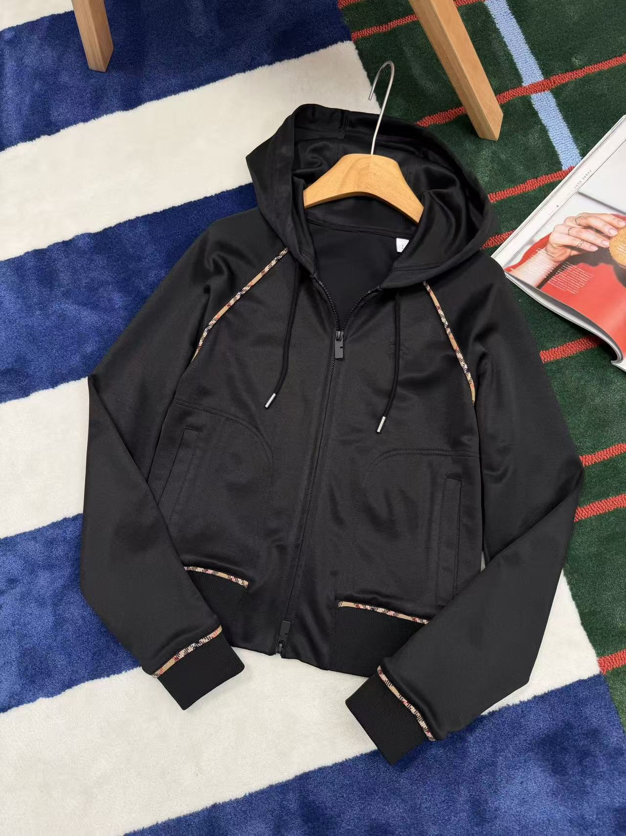 插肩袖+沙色經典格紋滾邊,視覺瞬間拉長比例,穿起來肩頸線條超美,隨手一拉拉鍊就有那種慵懶又高級的現代休閒感,胸前還有精緻的騎士徽章刺繡,細節滿分,完全是低調奢的代表!