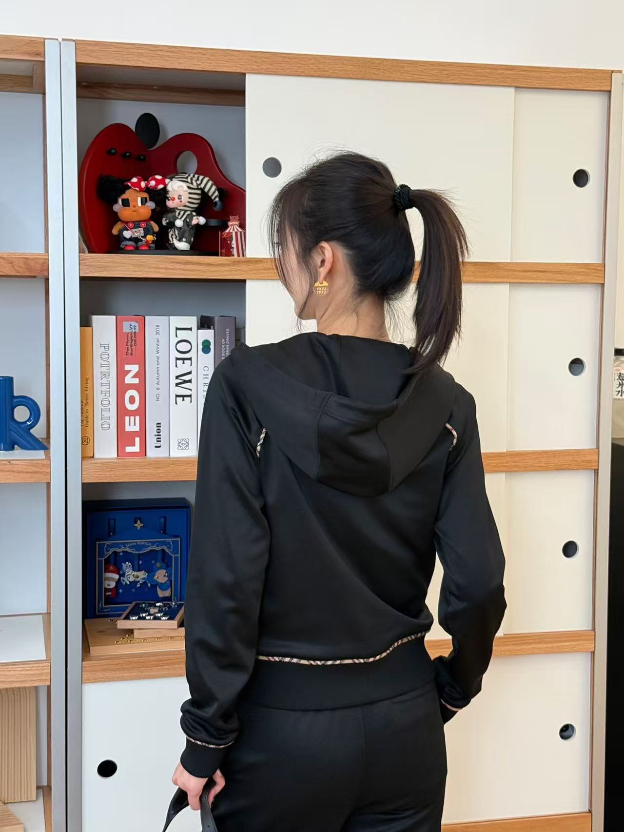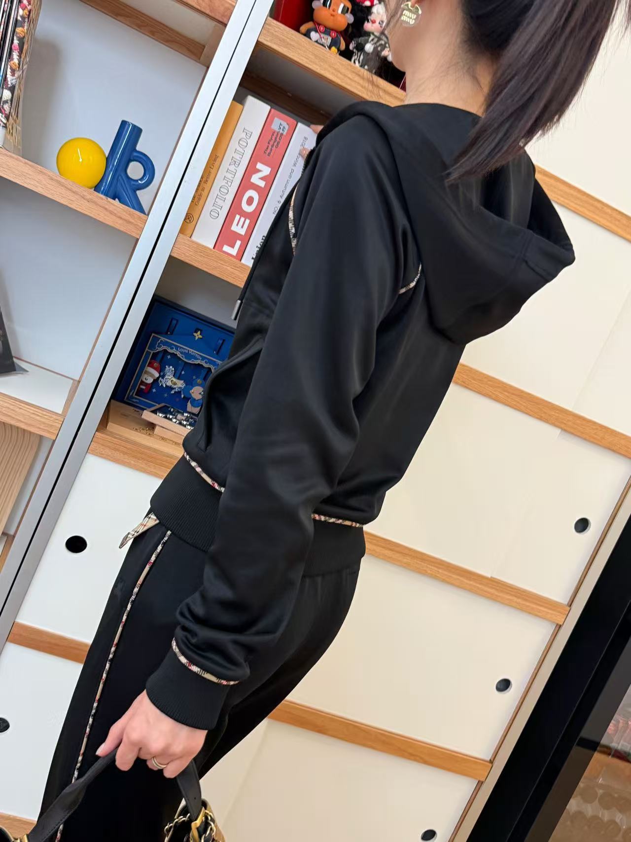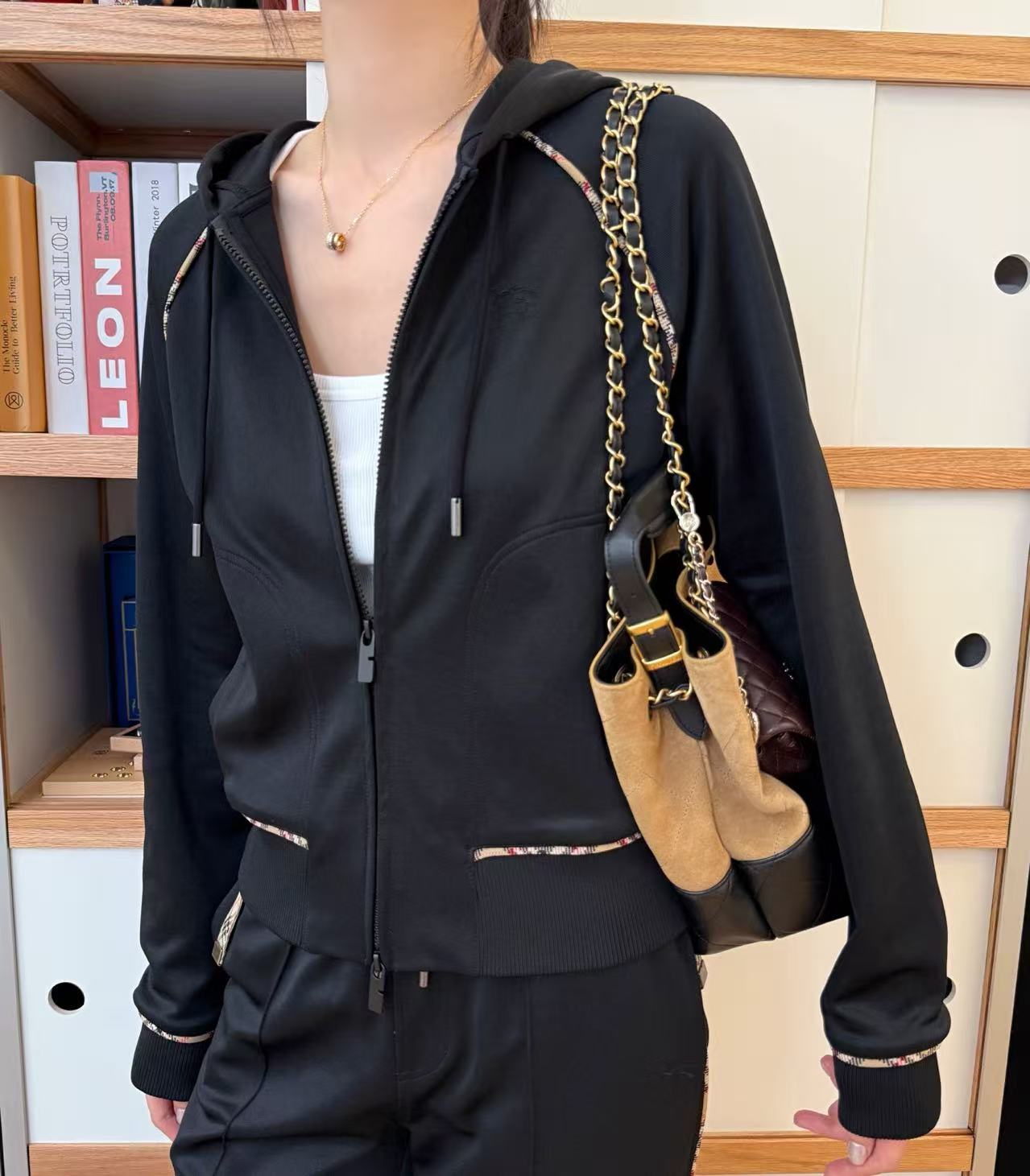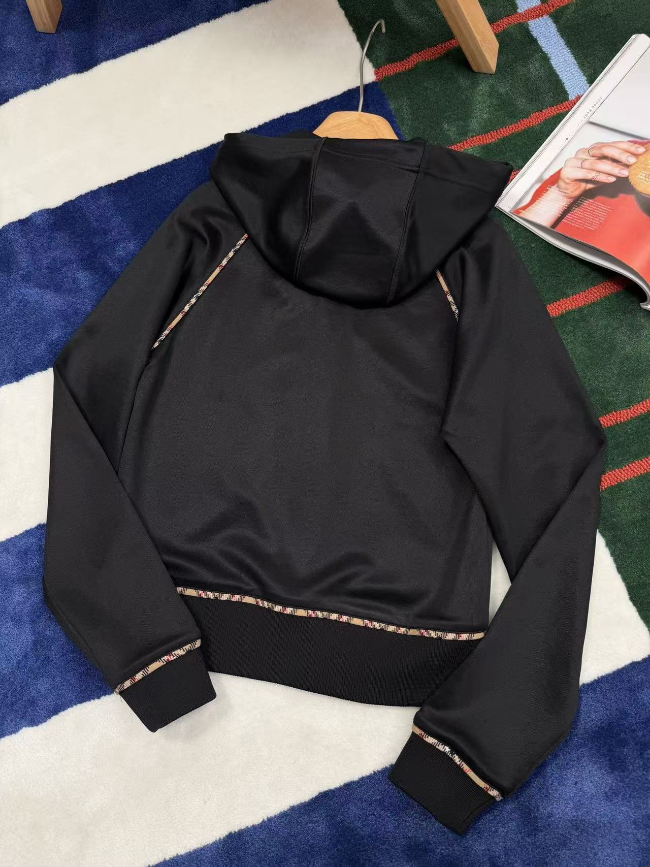 插肩袖+沙色經典格紋滾邊,視覺瞬間拉長比例,穿起來肩頸線條超美,隨手一拉拉鍊就有那種慵懶又高級的現代休閒感,胸前還有精緻的騎士徽章刺繡,細節滿分,完全是低調奢的代表!