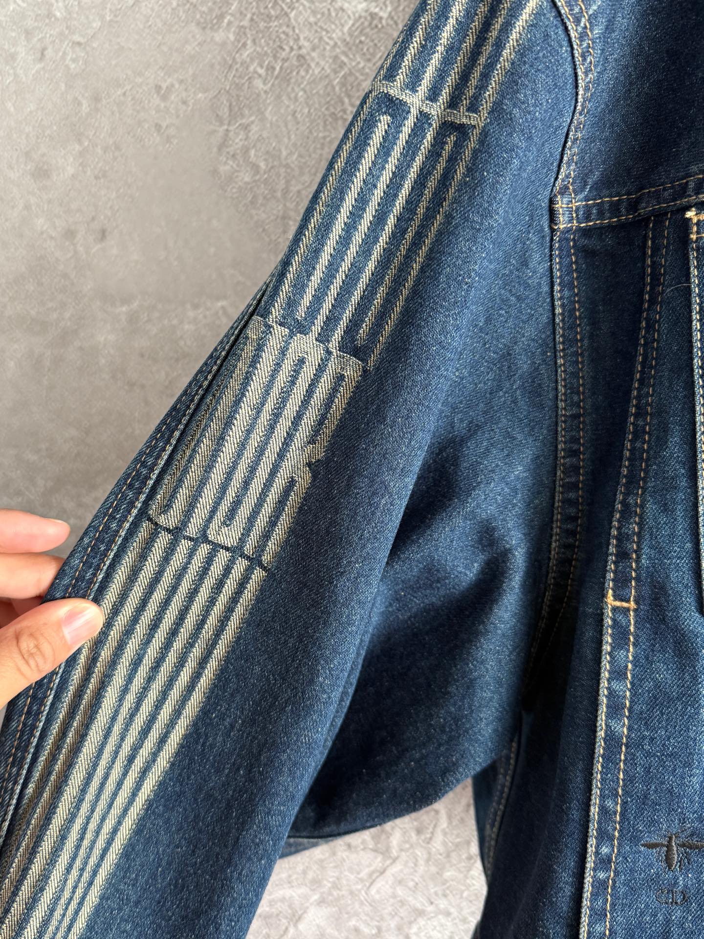 外套兩側袖子做了 提花色織條形細節,真的非常少見,工藝難度高、完成度也很漂亮,遠看近看都很有質感。
