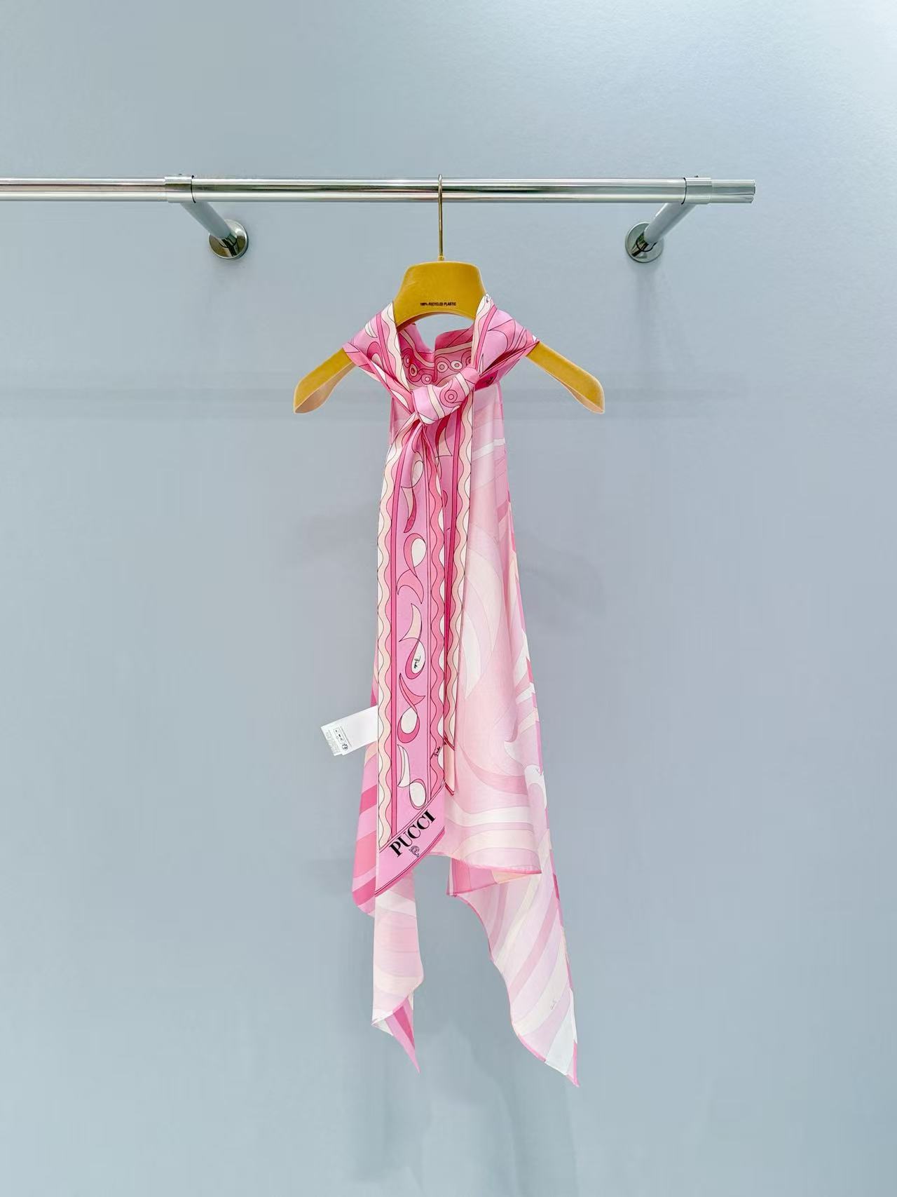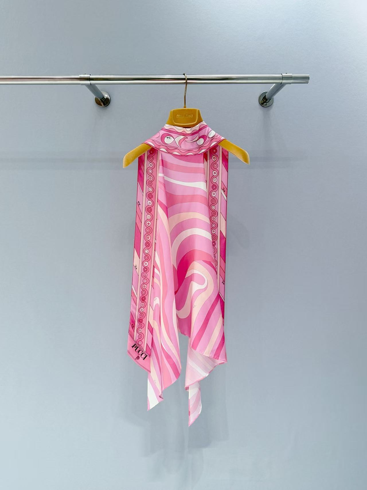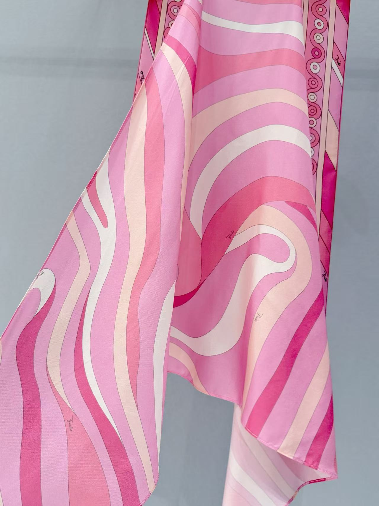標誌性幾何漩渦噴繪: 採用高精密數位印染技術,將粉、橘、白相間的圖騰還原得色彩飽滿。印花色彩與絲綢光澤完美融合。