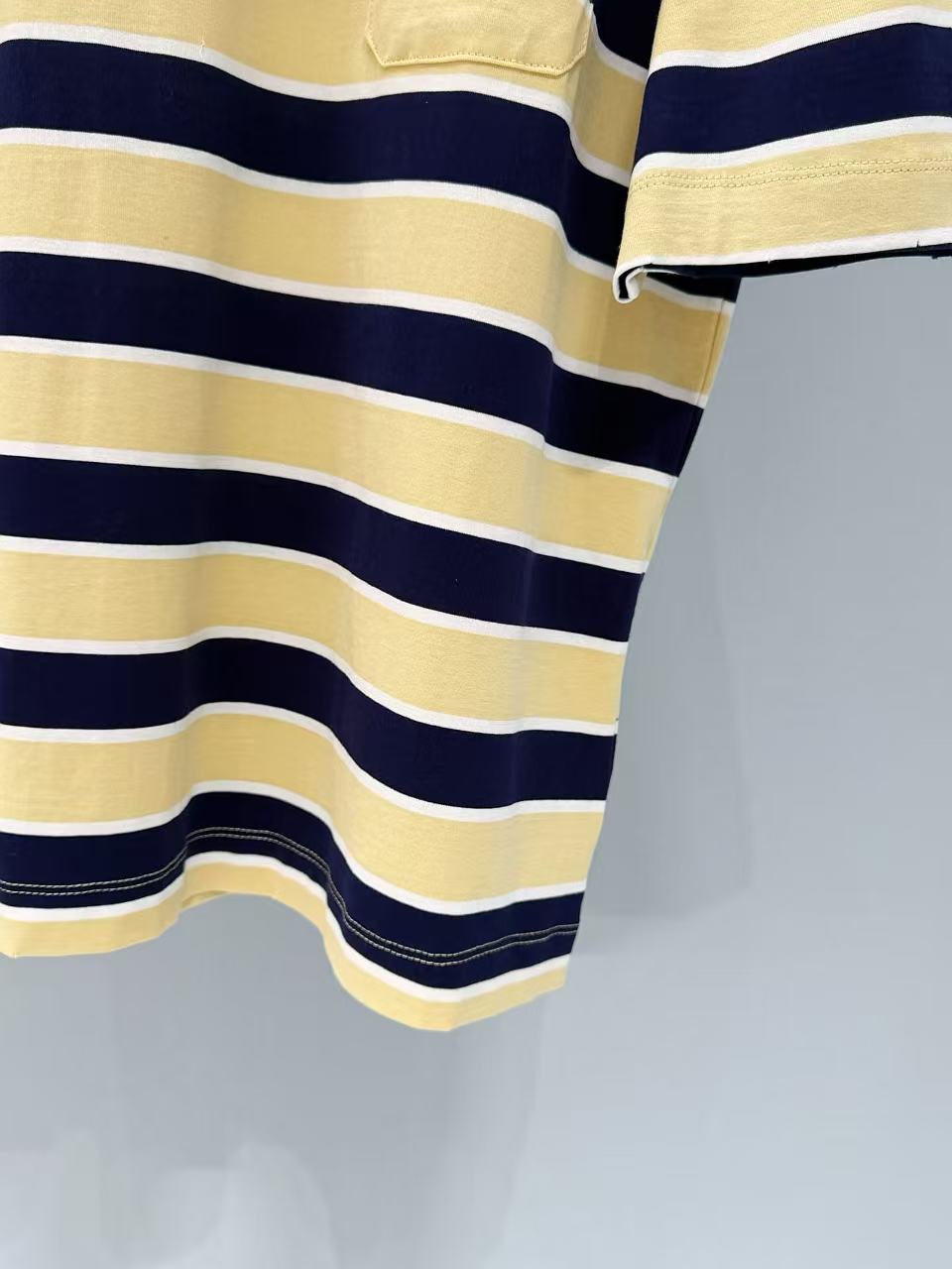 藍、黃、白三色交織的橫條紋設計,視覺上非常清爽且充滿活力。細節處更是亮點:左胸前設有精緻的小口袋,並點綴了標誌性的藍色品牌標籤,低調卻極具辨識度。