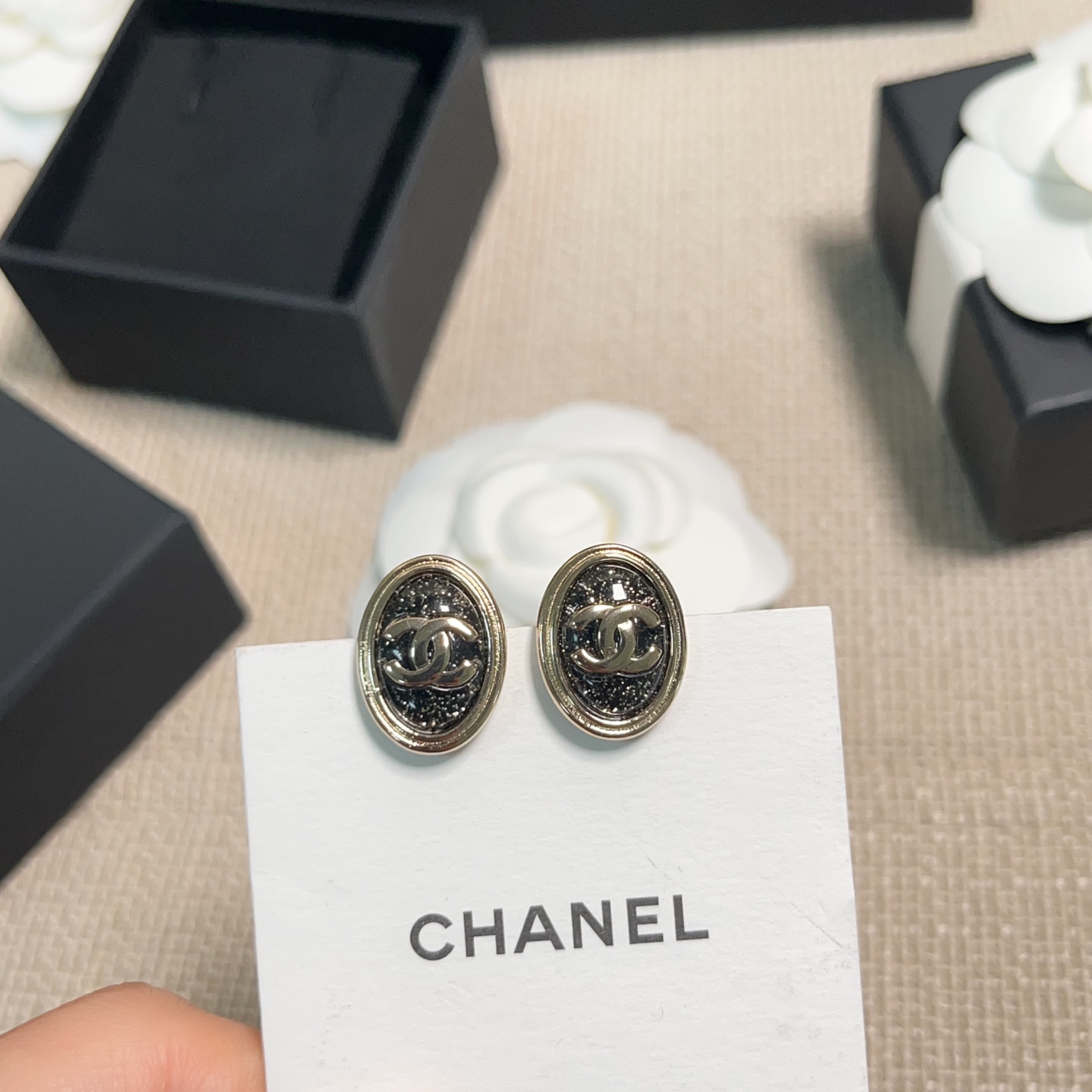 黑石中隱隱閃耀著金色細閃,如同夜空裡最閃爍的星光,低調卻奪目,越看越迷人。橢圓造型優雅大氣,不論是日常出門還是正式場合都能完美駕馭,整體散發出一種「靜靜地在發光」的高級氛圍。