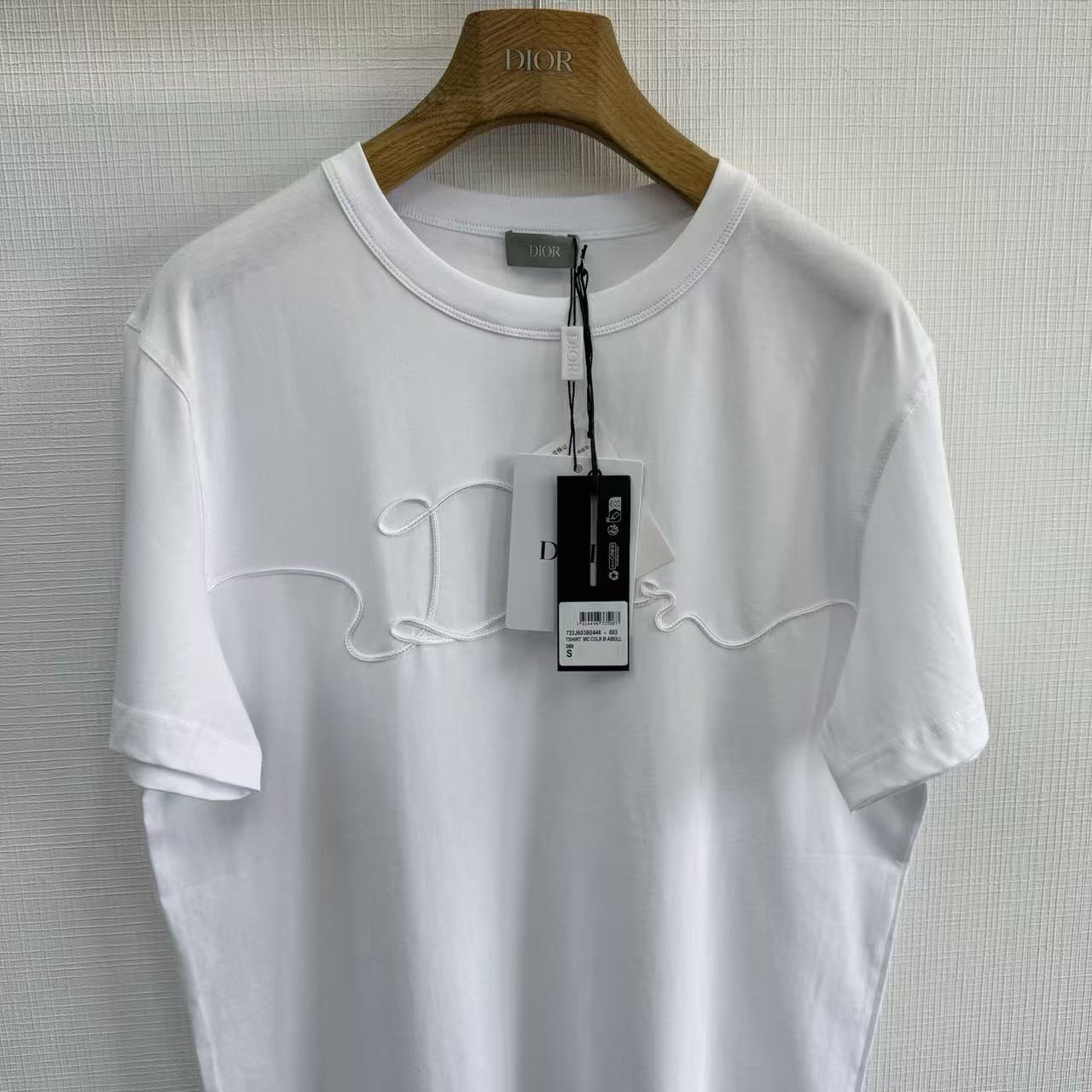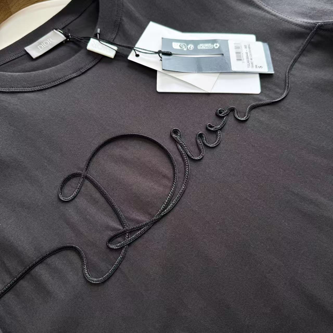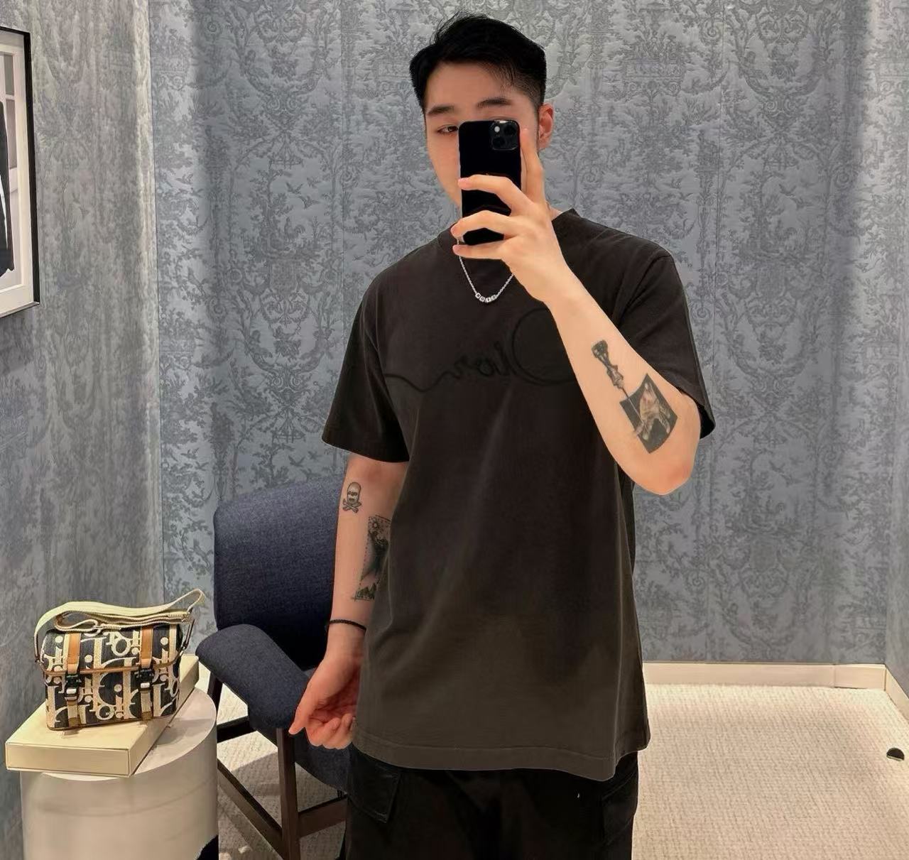 最犯規的還是那滿版的「織緞徽章」設計!一樣是用帶絲質光澤的緞帶織出來,再用特殊工藝完美固定在衣服上~緞面滑順會發光+T恤本身的霧面棉感形成超強對比,陽光一照整個衣服都在閃,卻又不會太誇張,真的高級到讓人想尖叫!