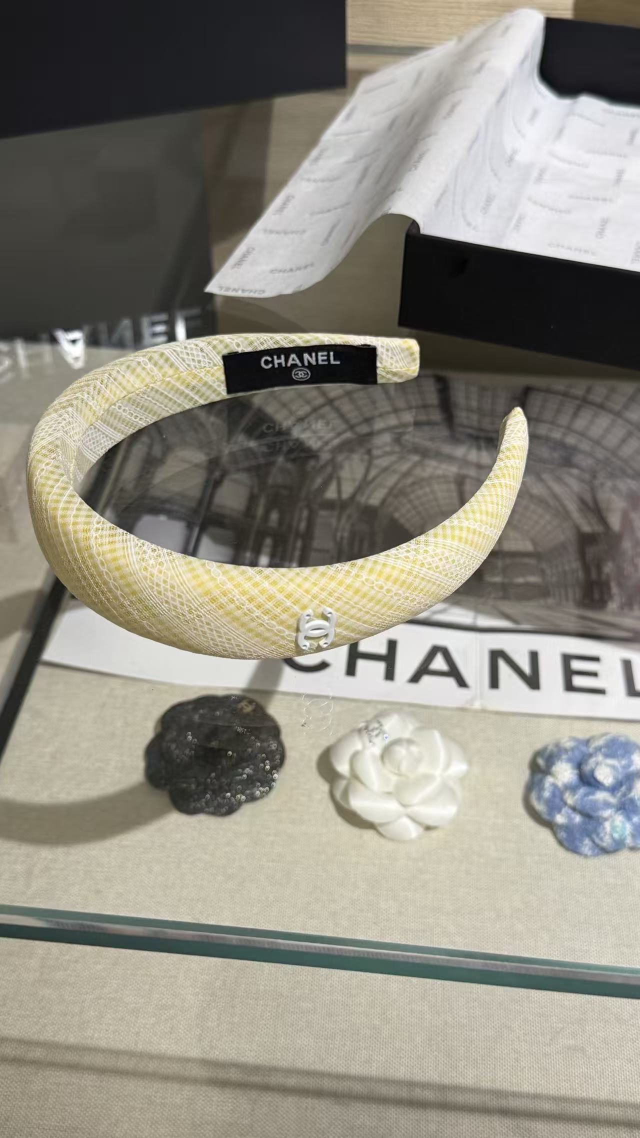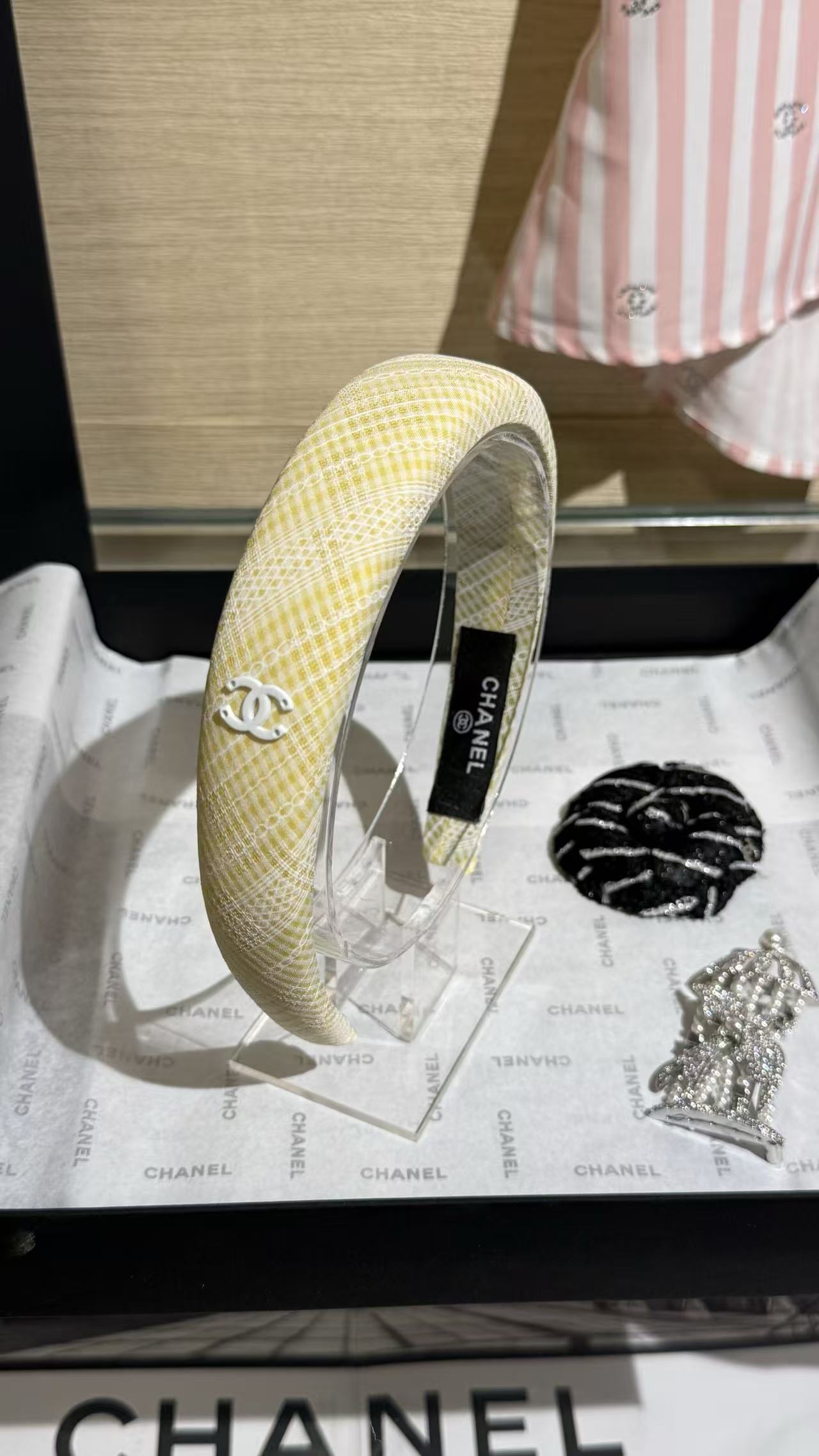 奶黃色小格紋布料超級溫柔,邊緣一圈細緻法式蕾絲,中央是經典白色琺瑯雙C Logo,