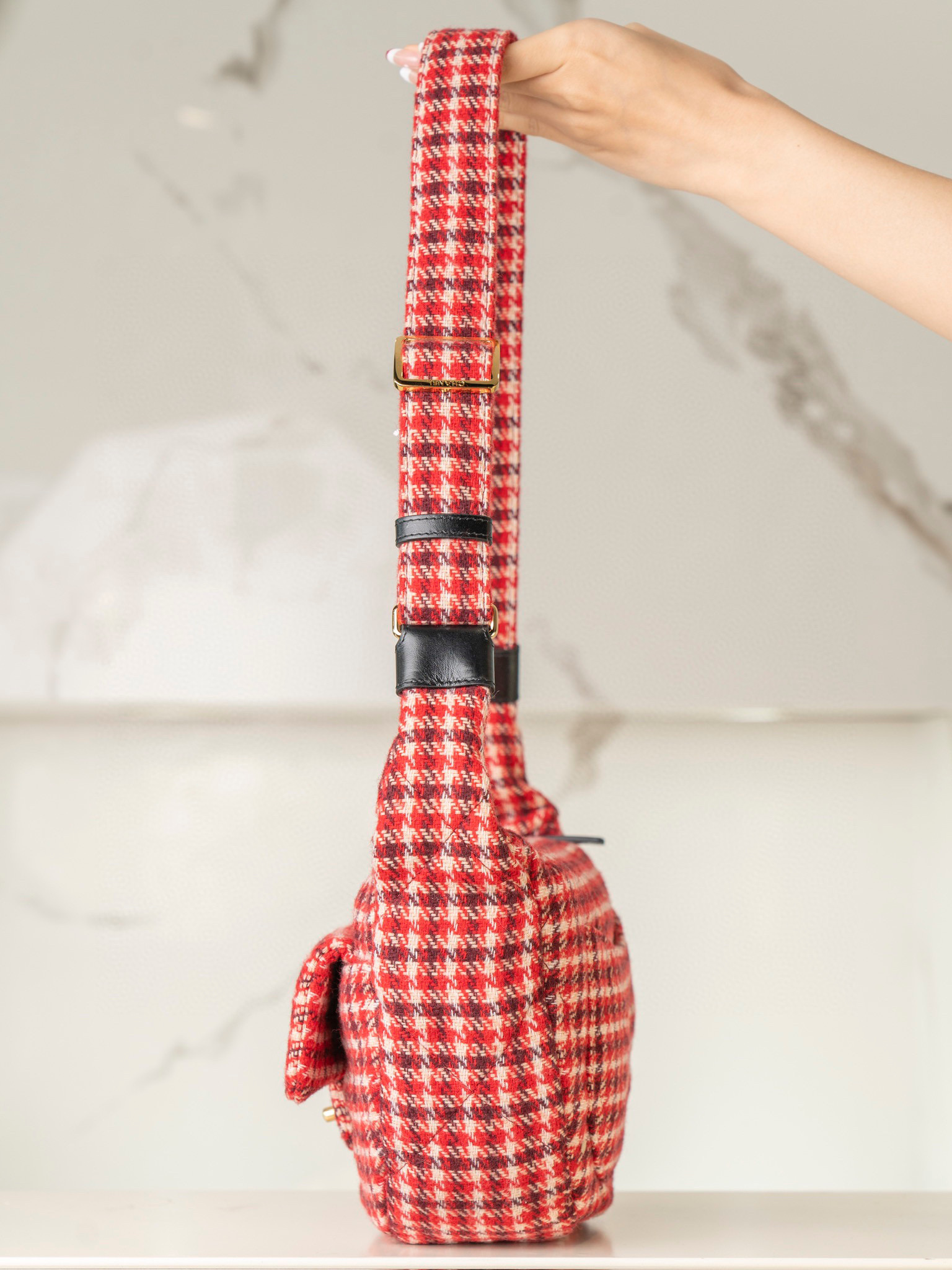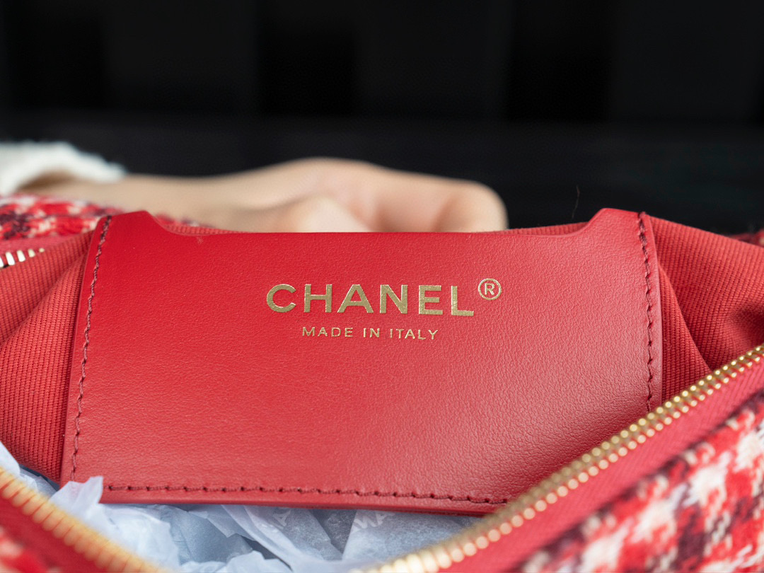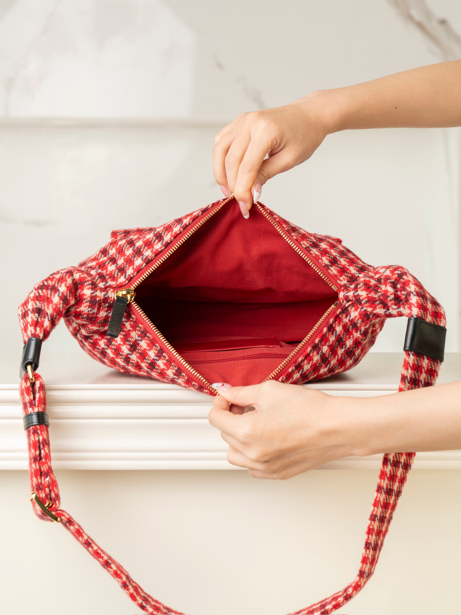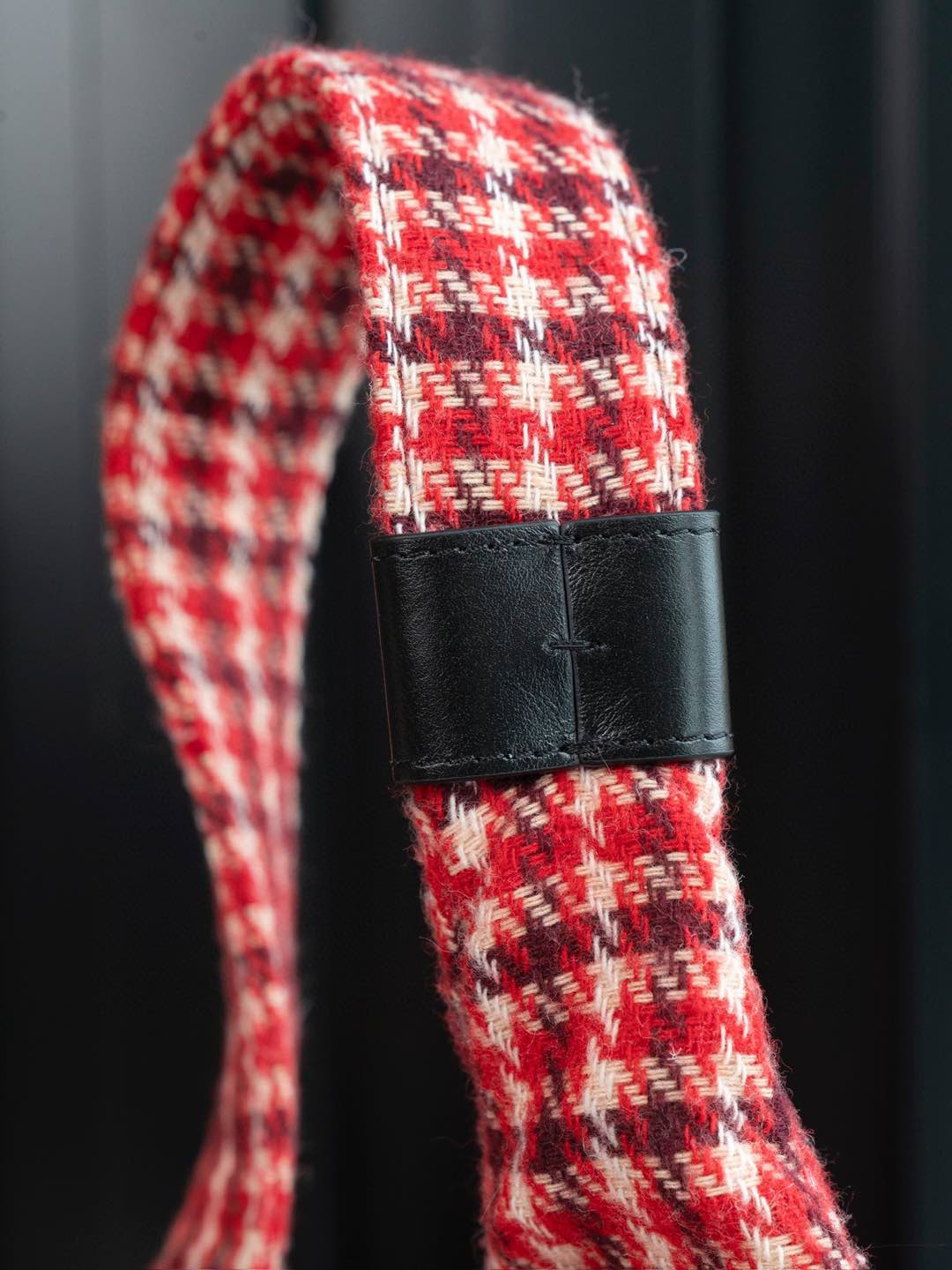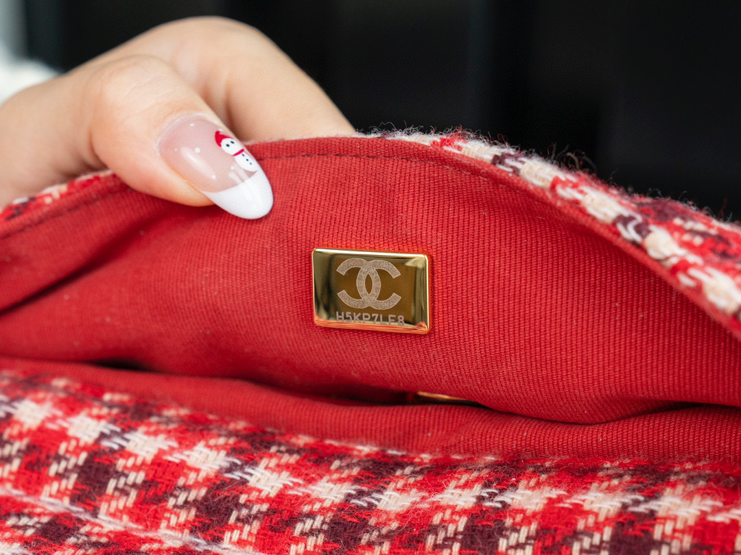 內裡: 高密度豎紋棉柔感紅色裡布,與外層的千鳥格紋完美呼應。真金腐蝕燙金細節,讓包包更具質感。