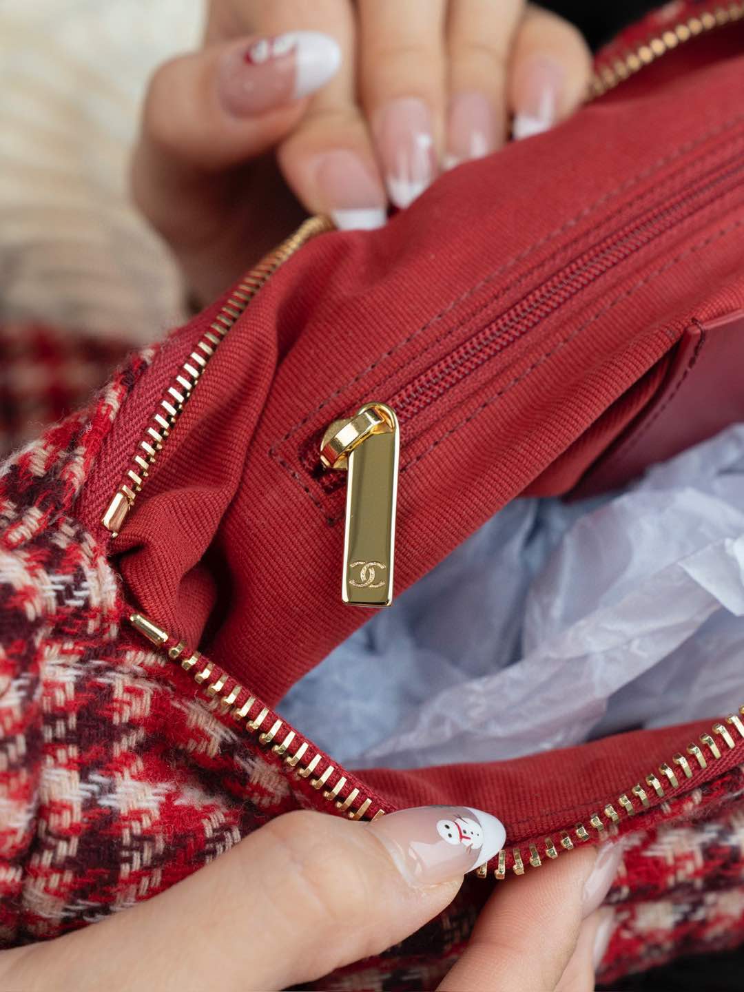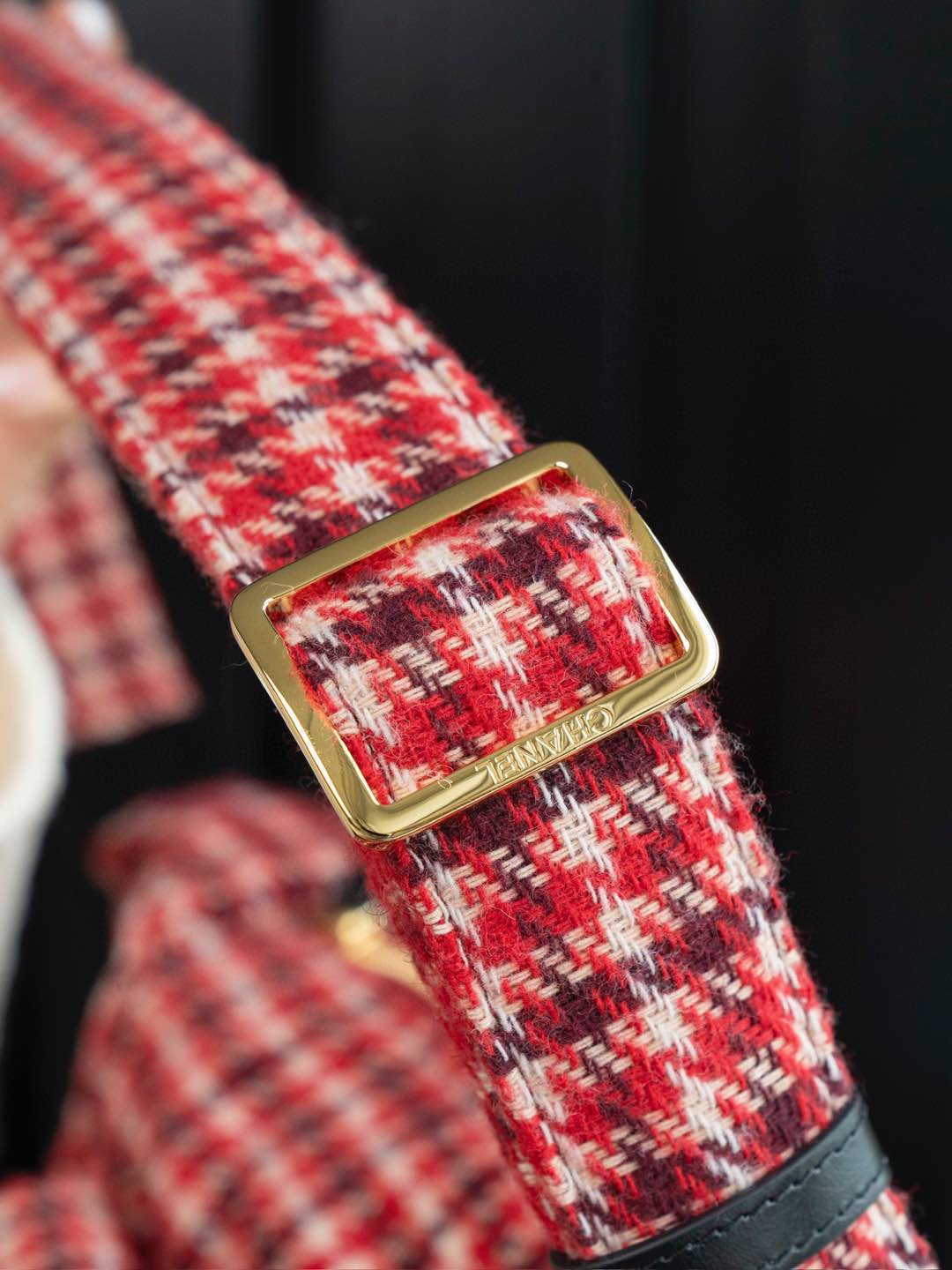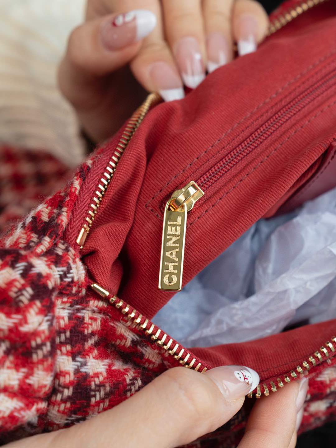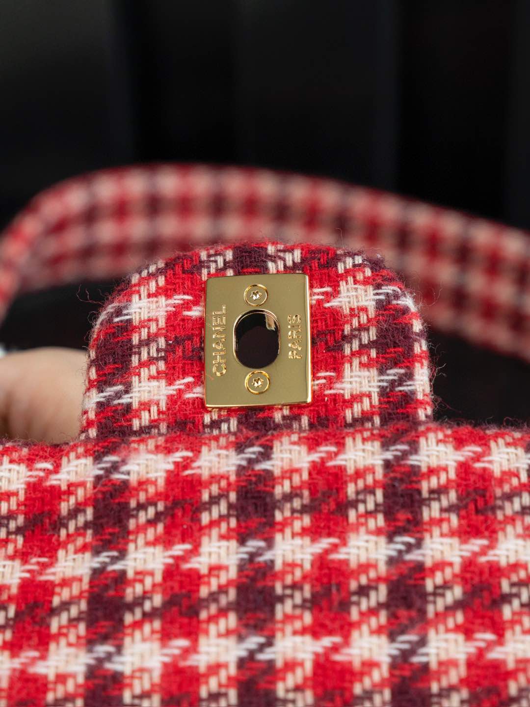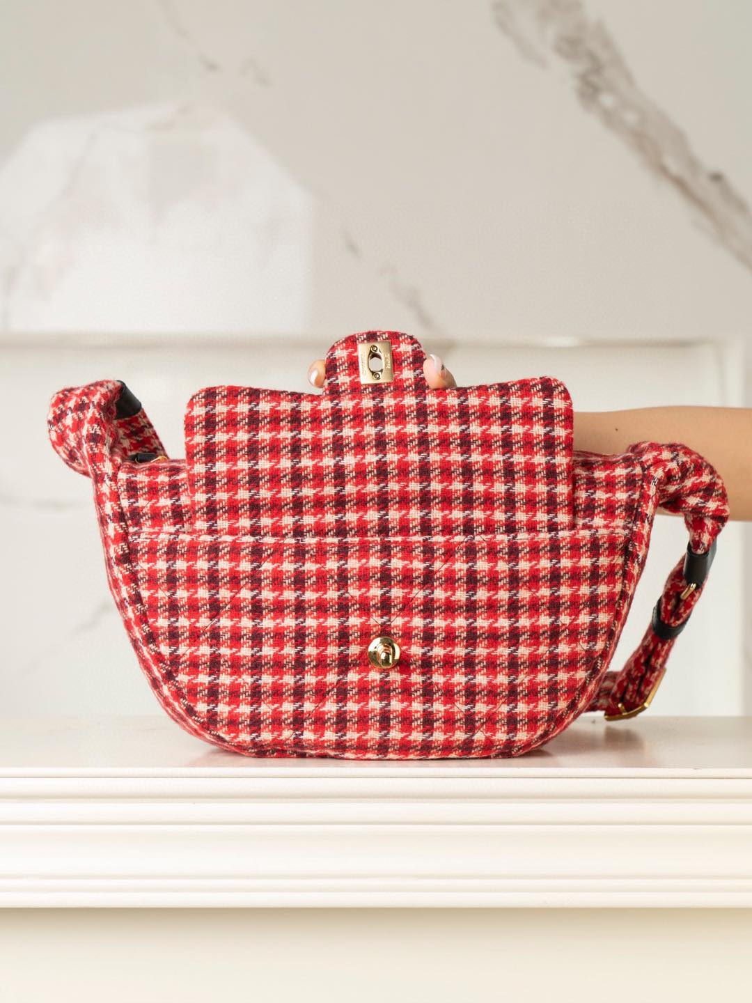 內裡: 高密度豎紋棉柔感紅色裡布,與外層的千鳥格紋完美呼應。真金腐蝕燙金細節,讓包包更具質感。