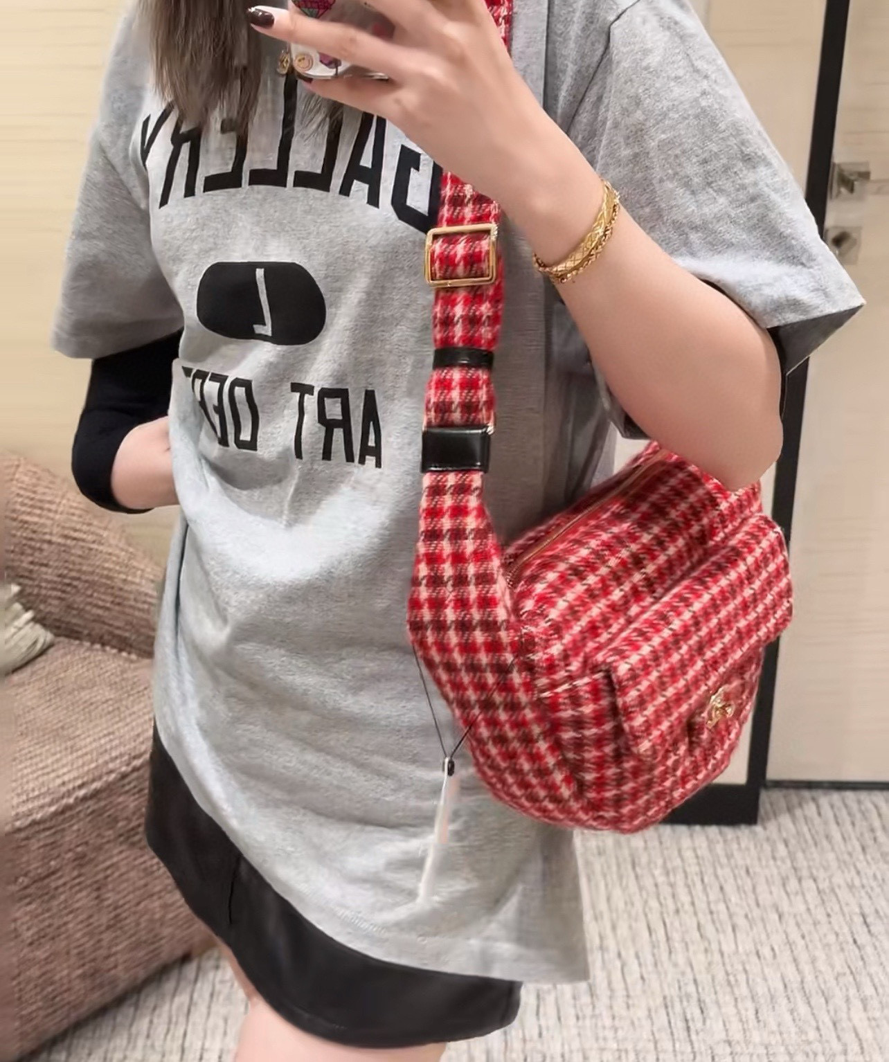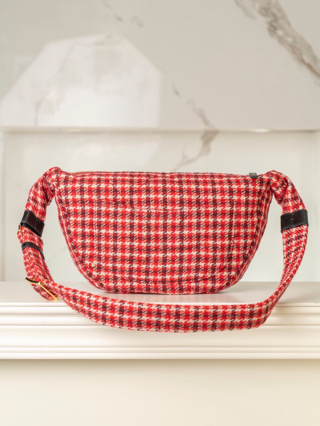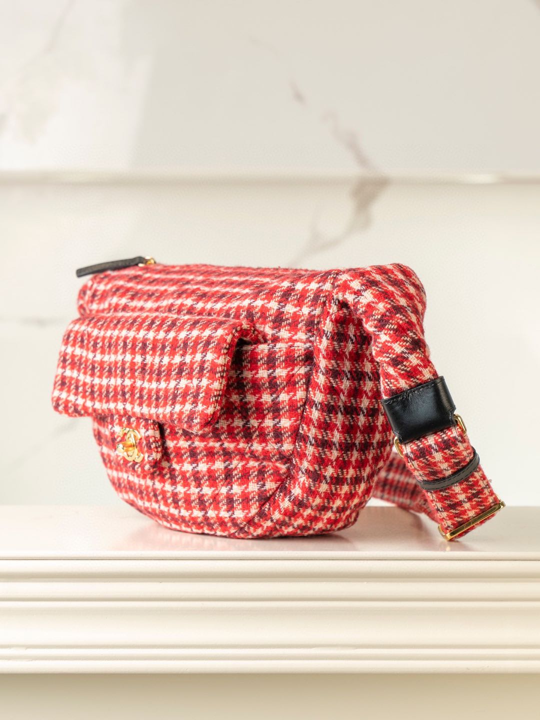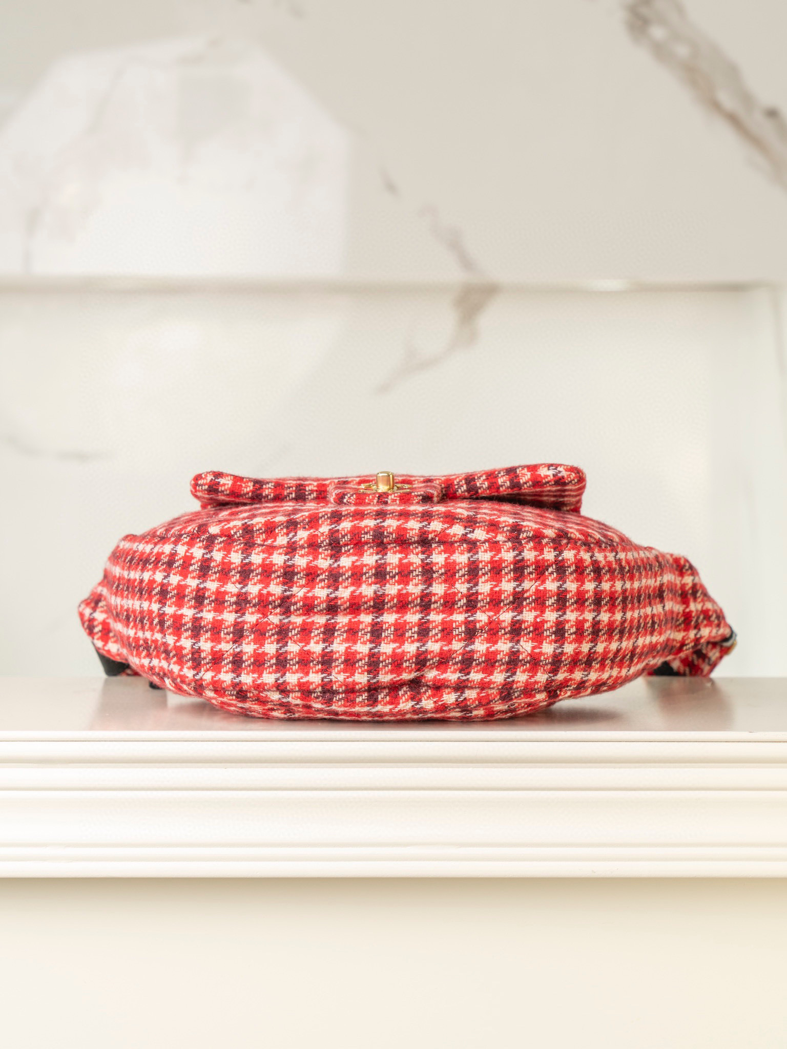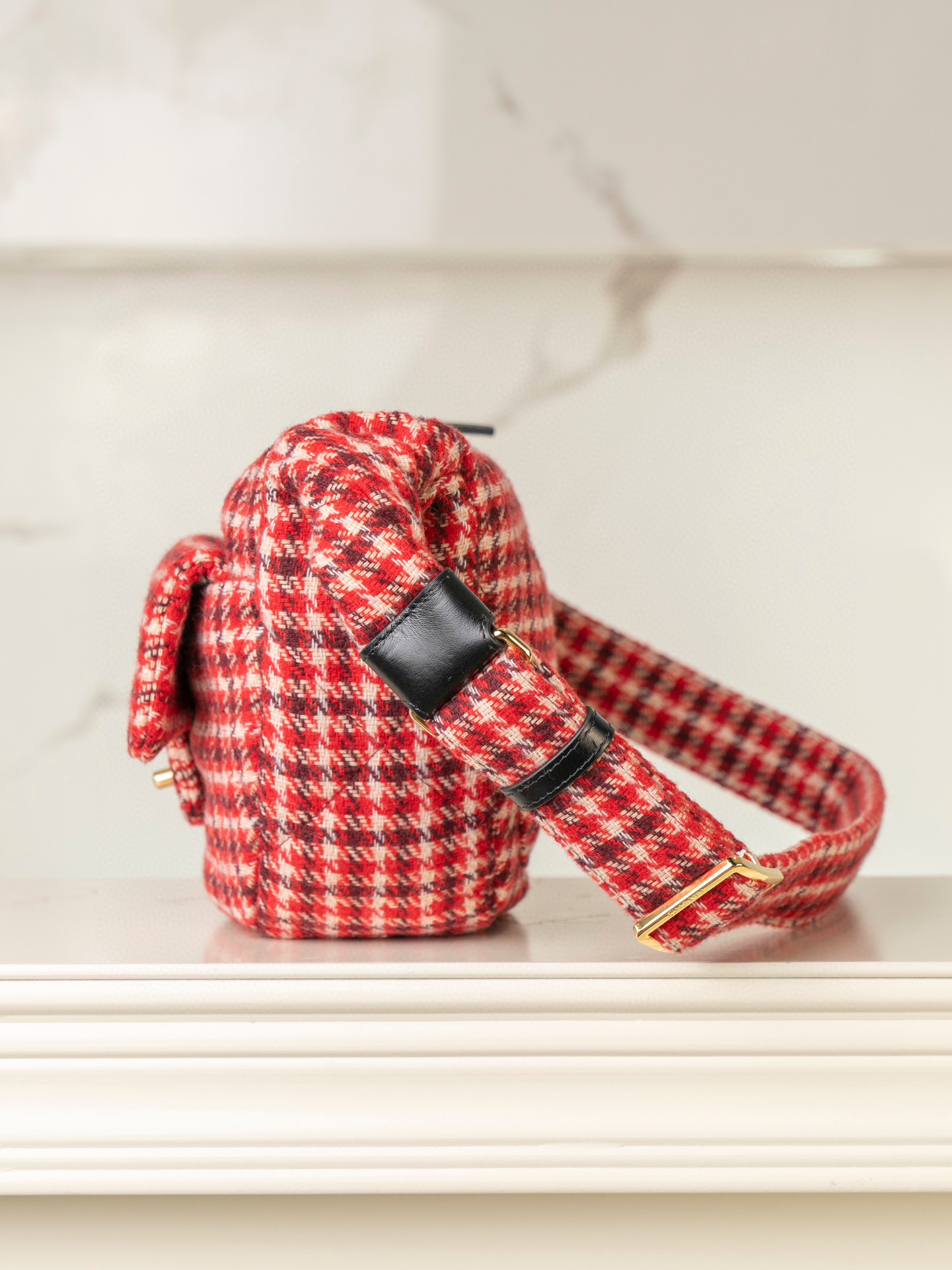 內裡: 高密度豎紋棉柔感紅色裡布,與外層的千鳥格紋完美呼應。真金腐蝕燙金細節,讓包包更具質感。