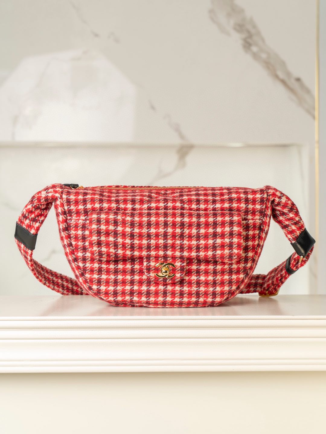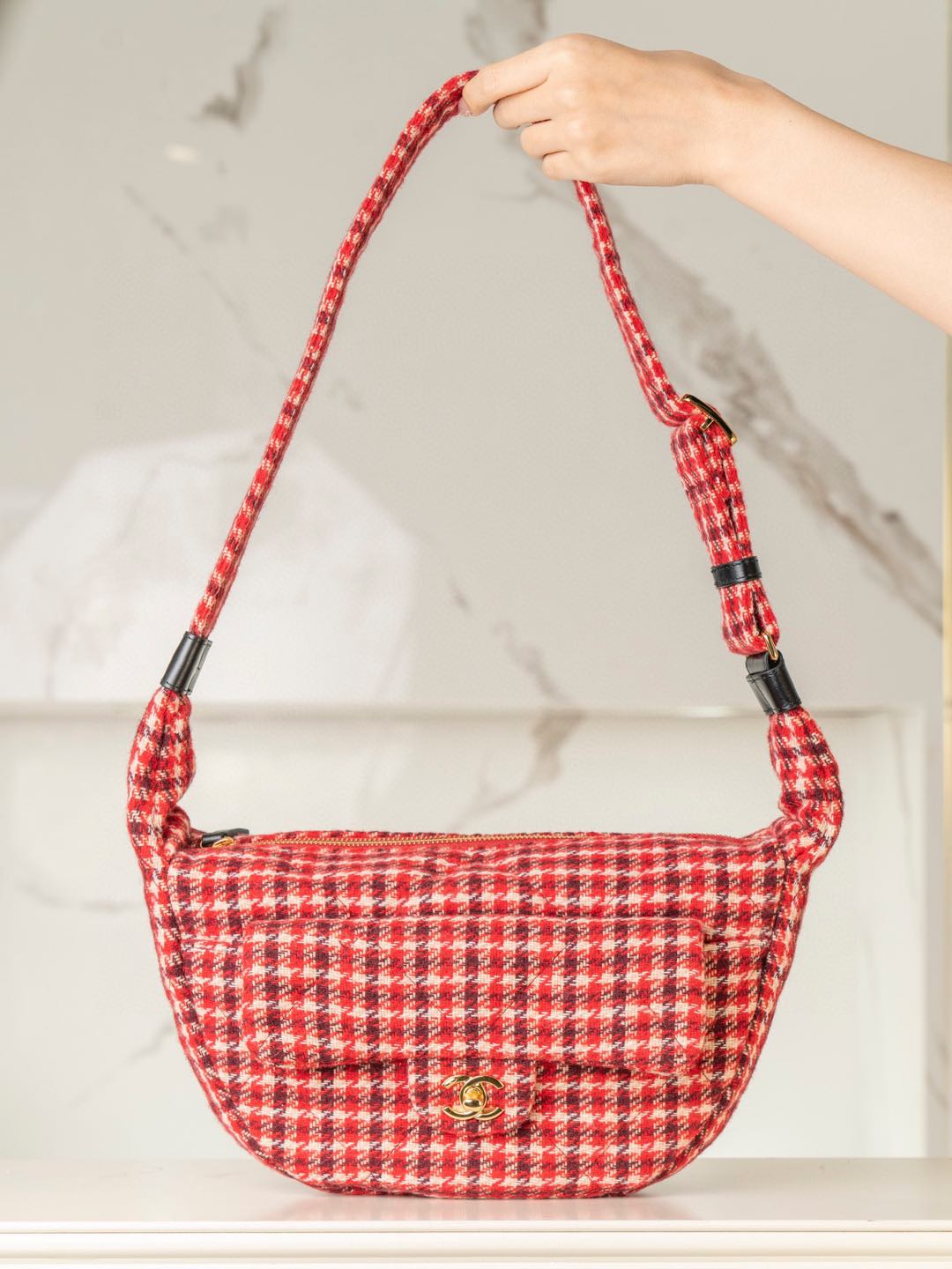 C家24N coco neige 滑雪系列紅千鳥格hobo半月包