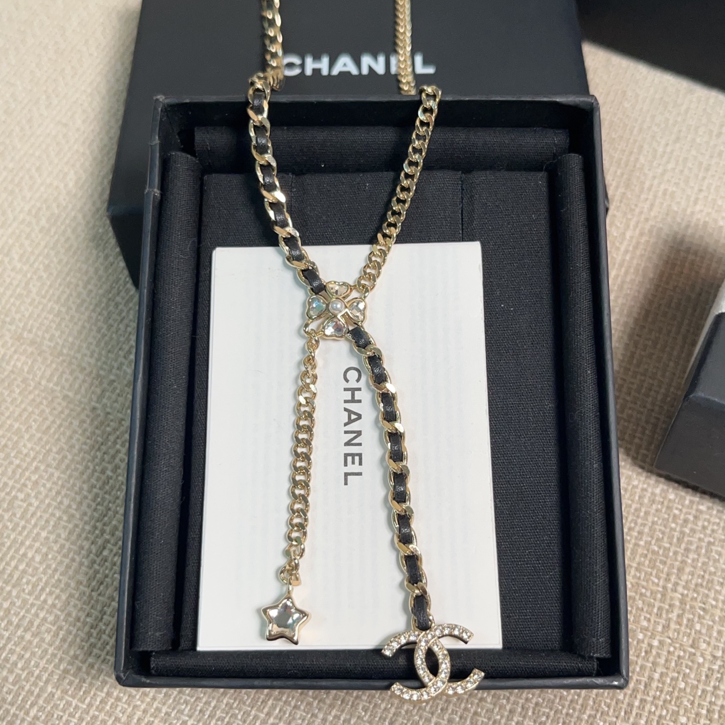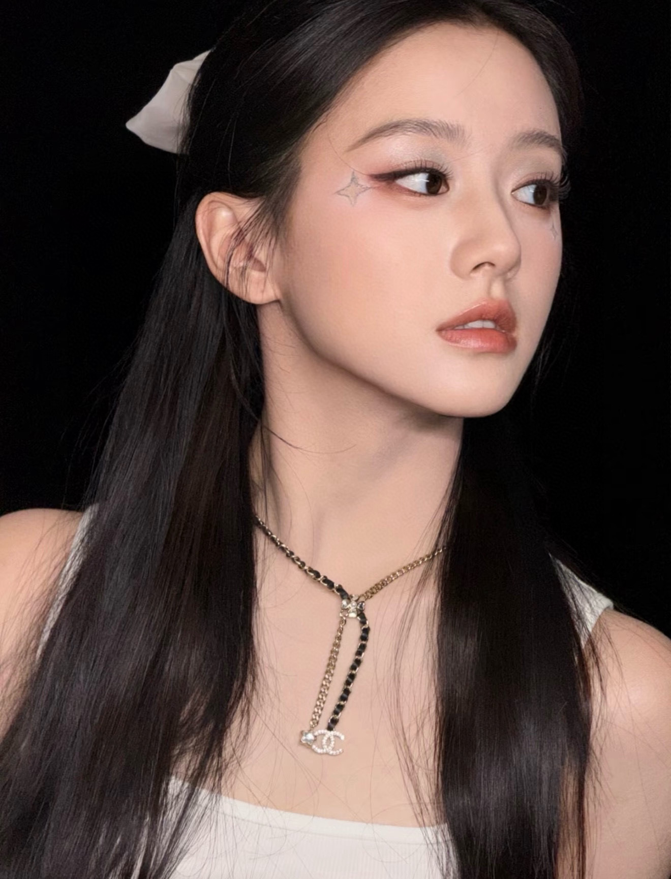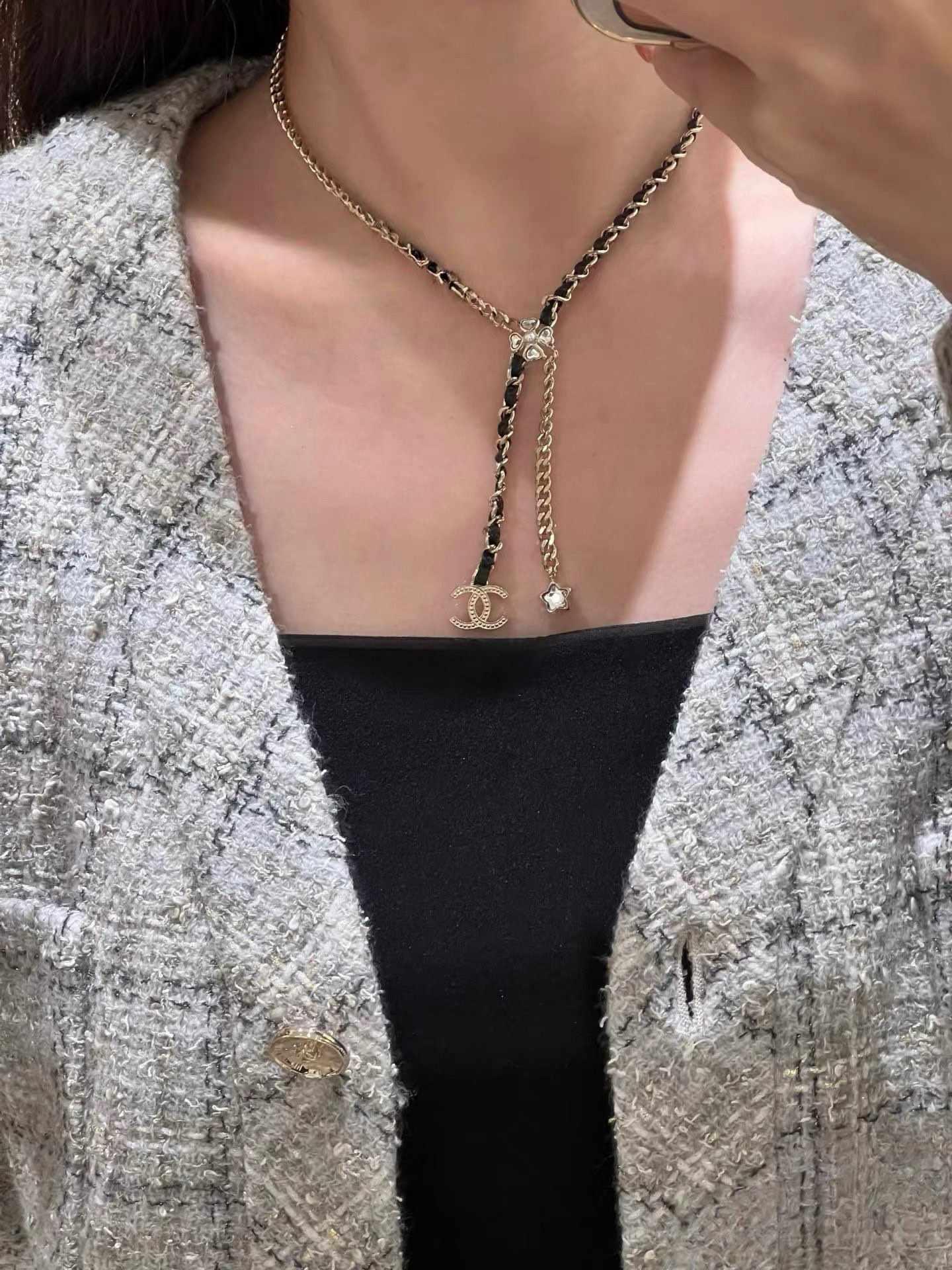 長度可自由調節,戴上後會隨著光線閃耀出不同層次的光芒。設計上結合了星星、四葉草、雙 C 以及皮穿鏈等經典元素,再搭配特別定制的愛心與星星形狀水晶,整體靈動俏麗又帶點甜颯感。