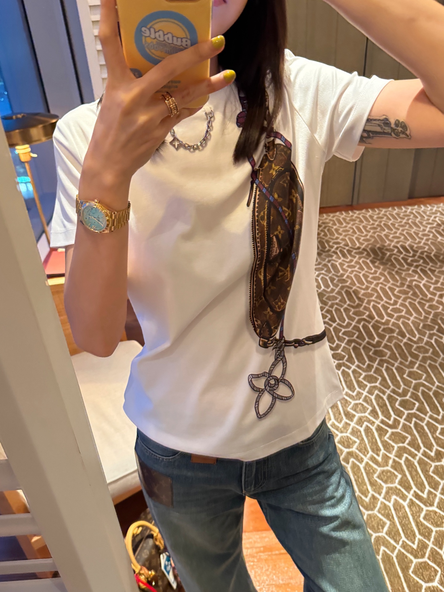 這件 T 恤屬於那種「一眼就讓人記得」的單品,細節滿滿卻不浮誇,穿上身自然散發時髦態度。