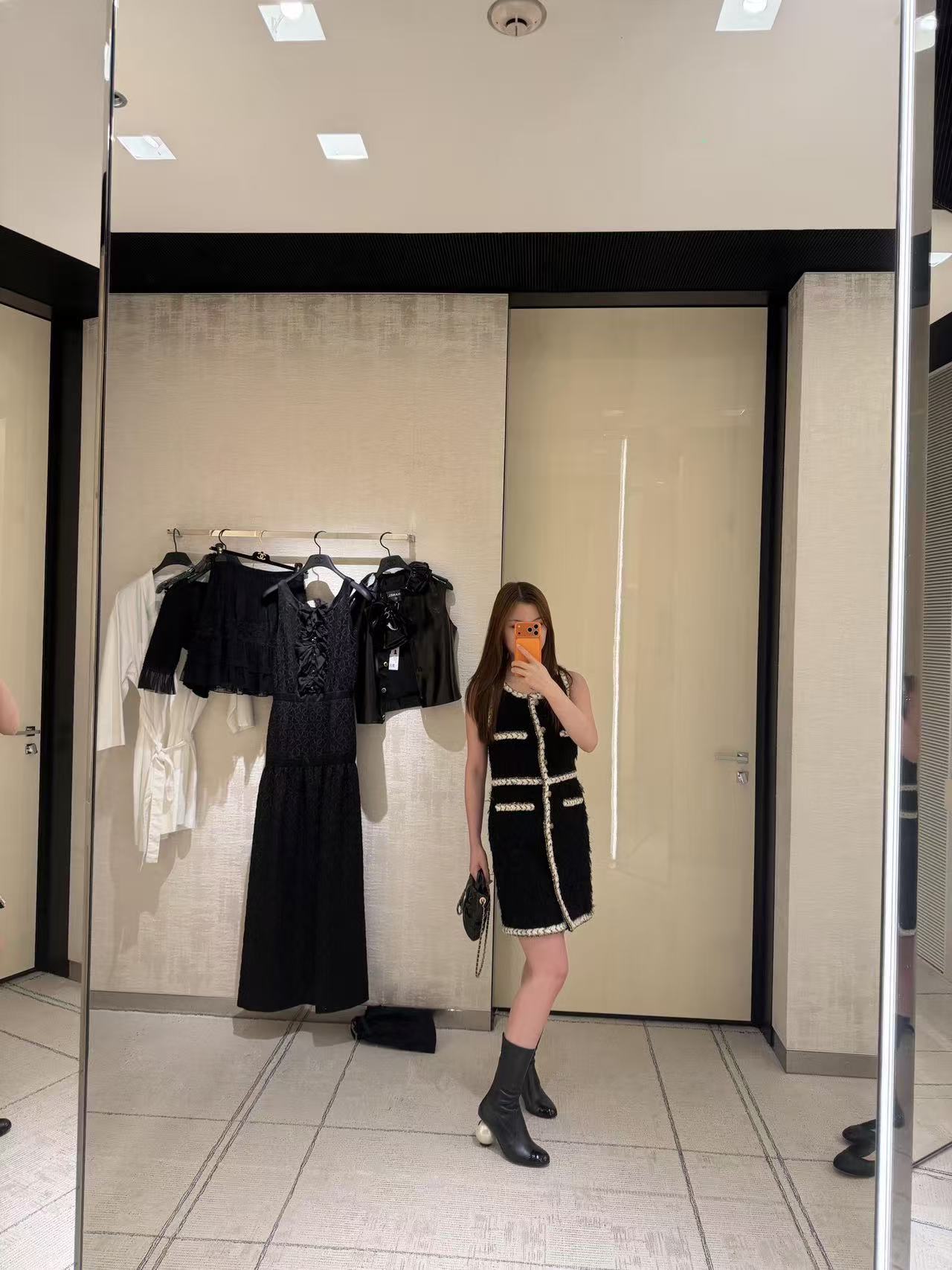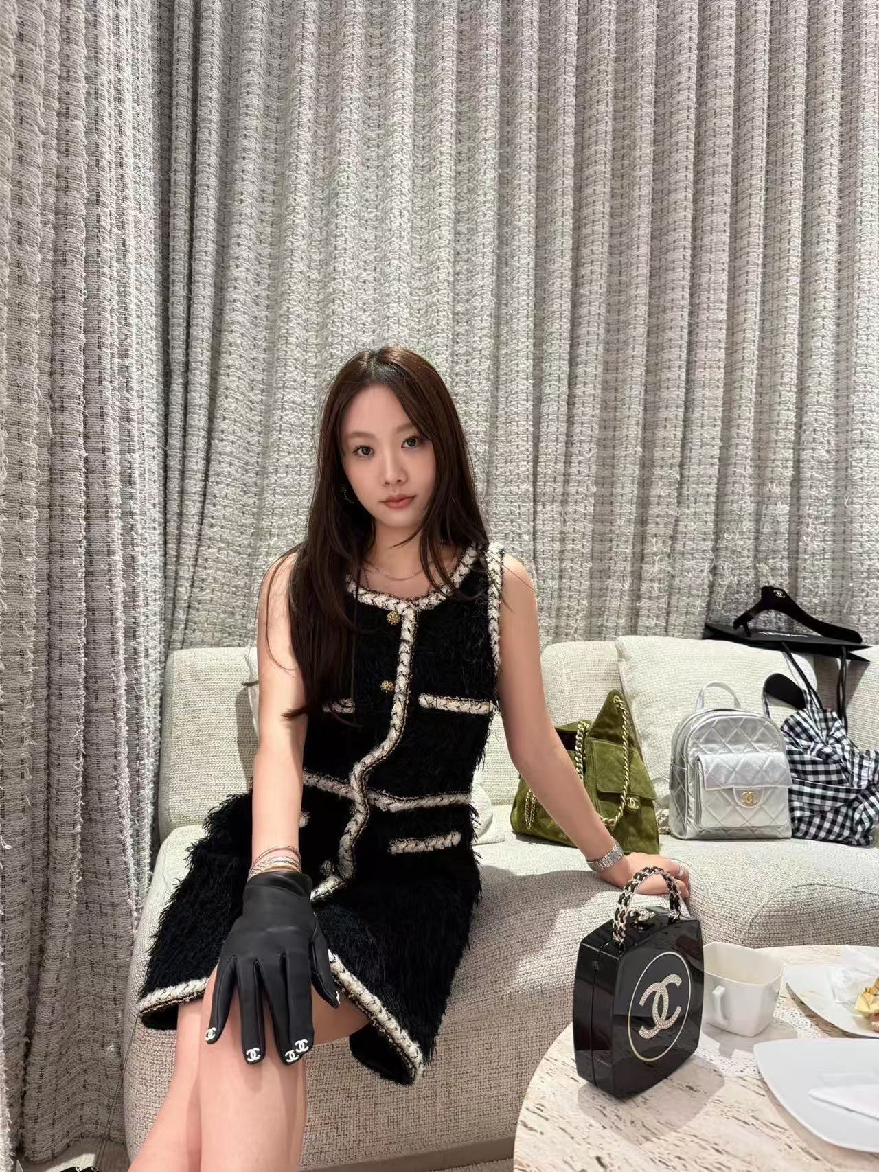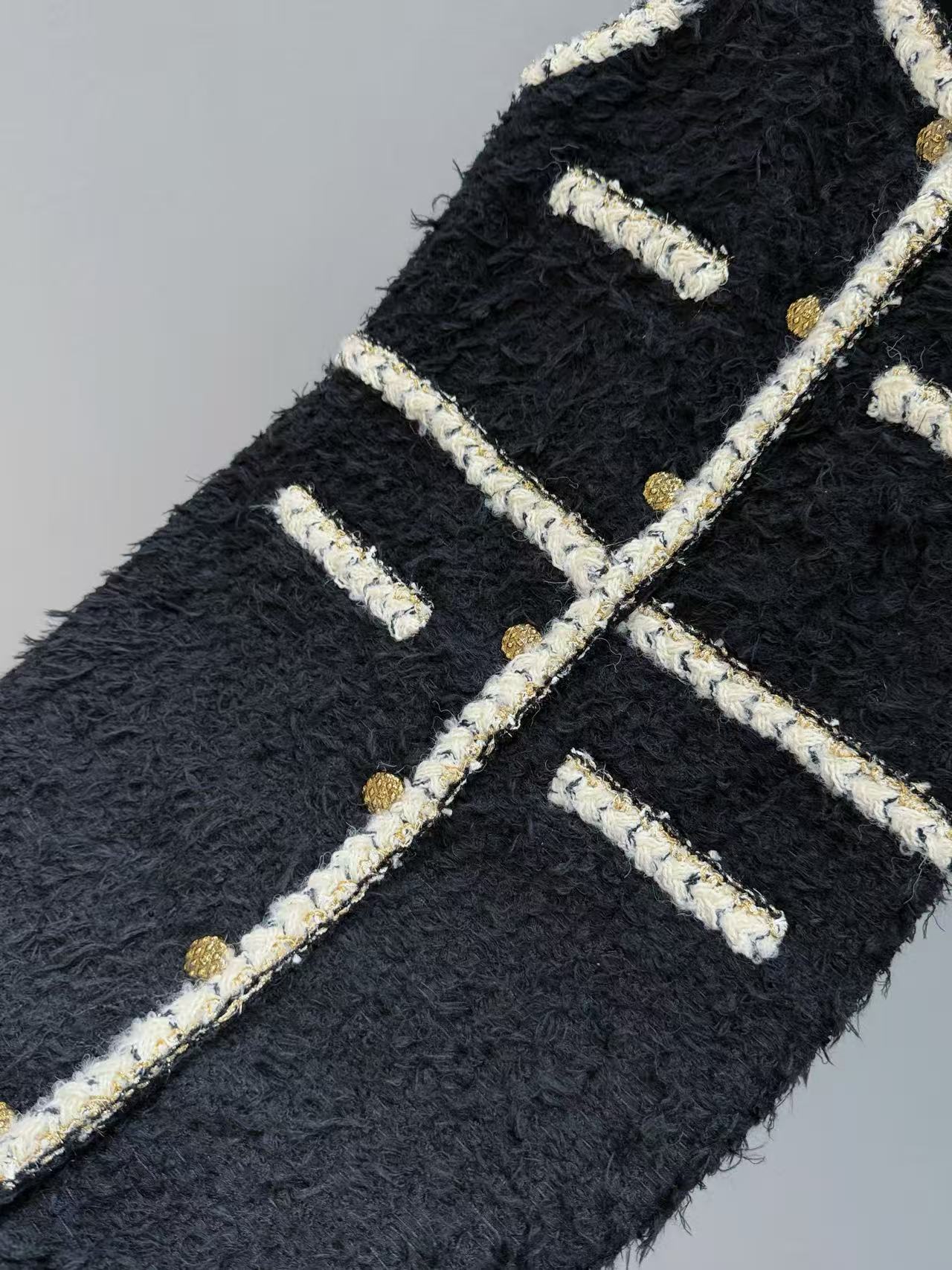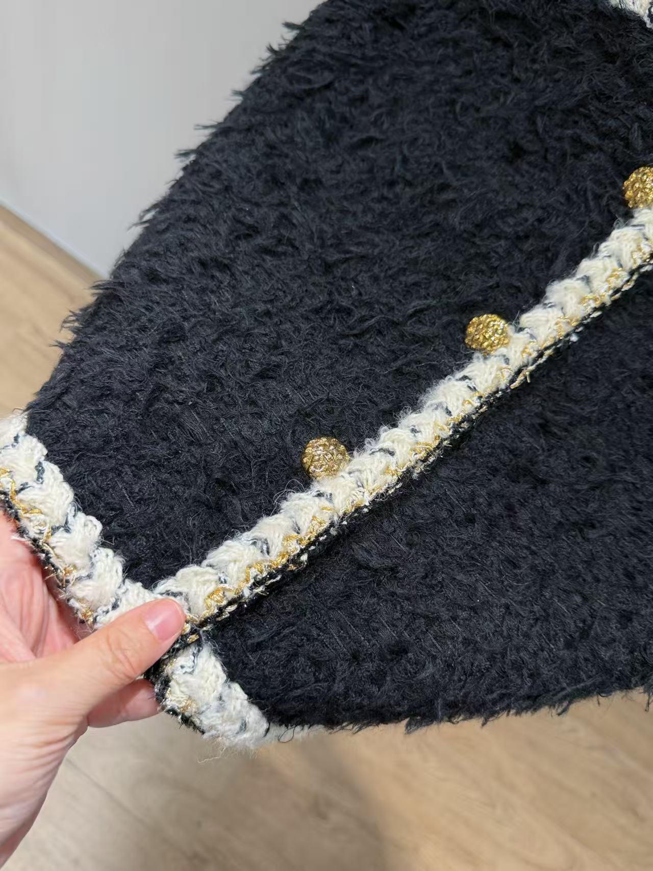 材質:經典黑色粗花呢為底,特別混織了細膩黑紗與天鵝絨毛,遠看是低調粗花呢,