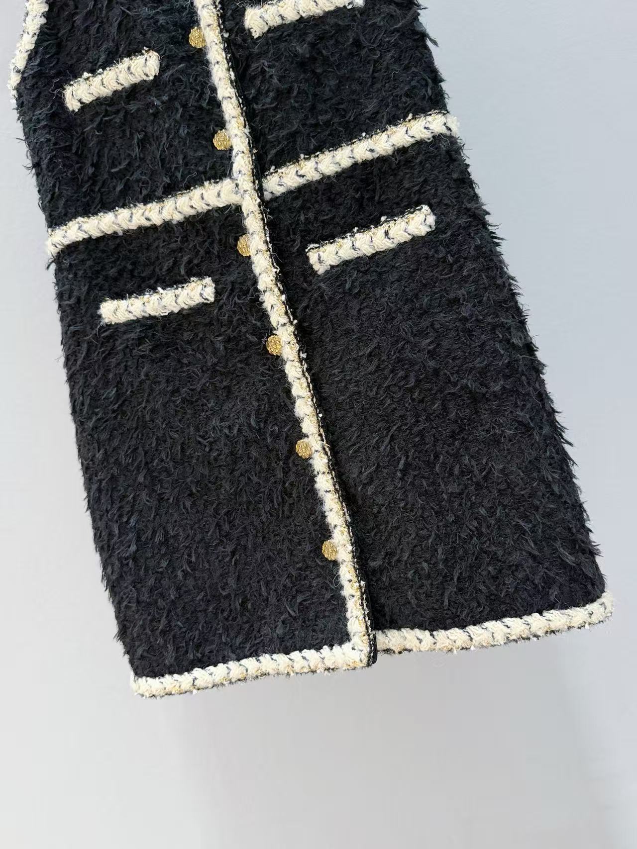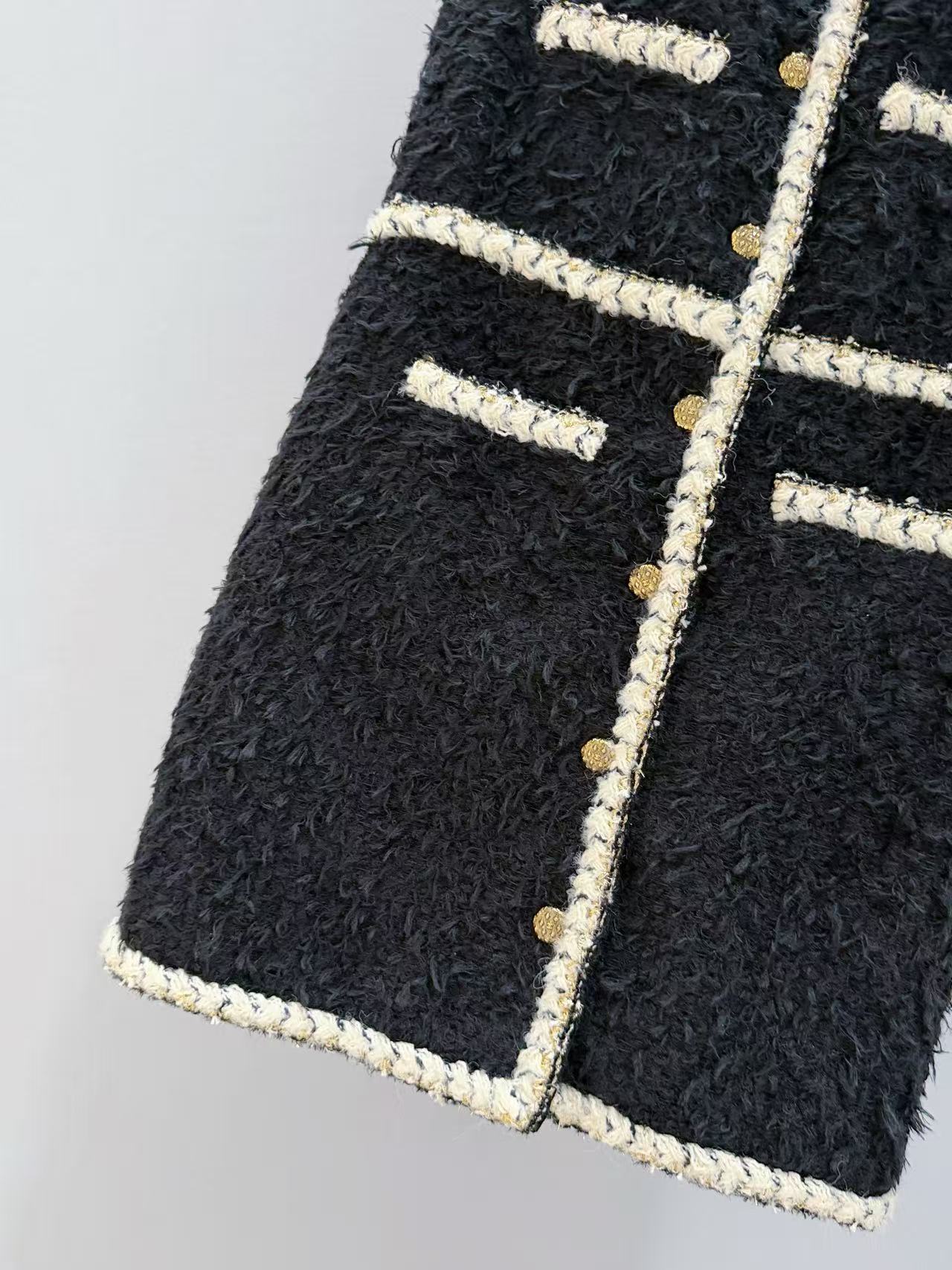 米金色金絲編織滾邊,沿著門襟、小口袋、裙襬一圈勾勒,像給整件黑裙鑲了一道流動的光暈,復古金屬質感鈕扣一字排開,優雅到不行