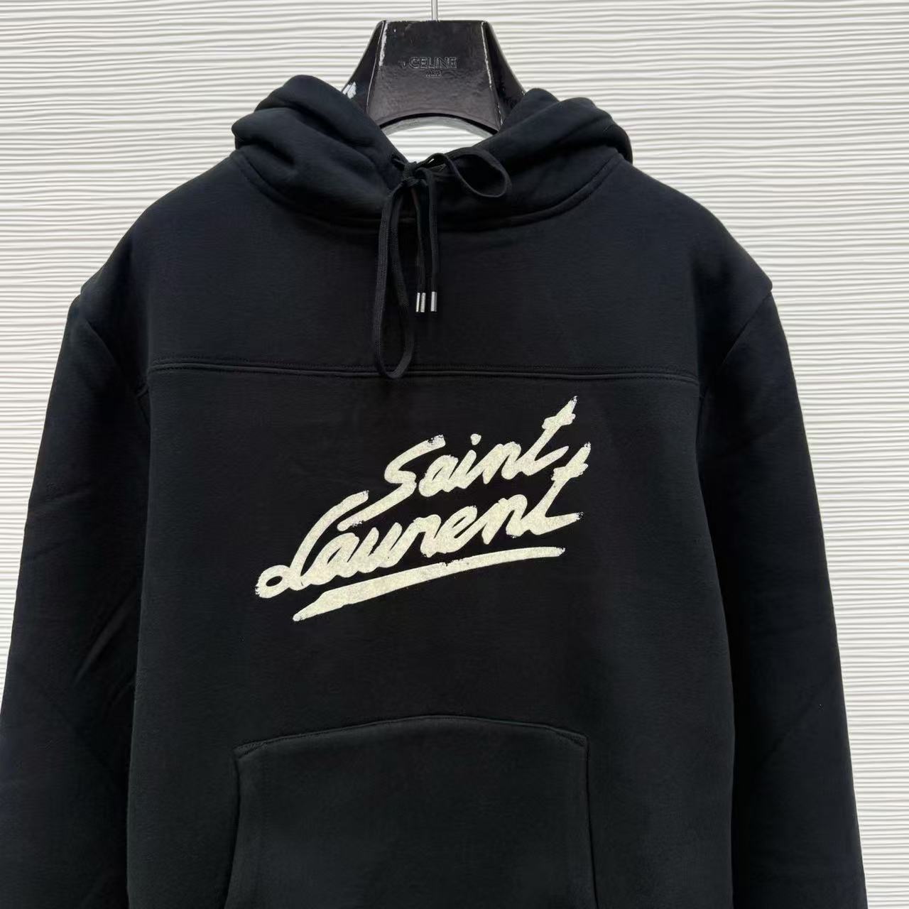 這款連帽衛衣以極簡的純黑為基底,胸前標誌性的草寫 Logo 採用精緻的植絨工法呈現,不僅極具品牌辨識度,更為整體的街頭氛圍注入了一份優雅的氣息。