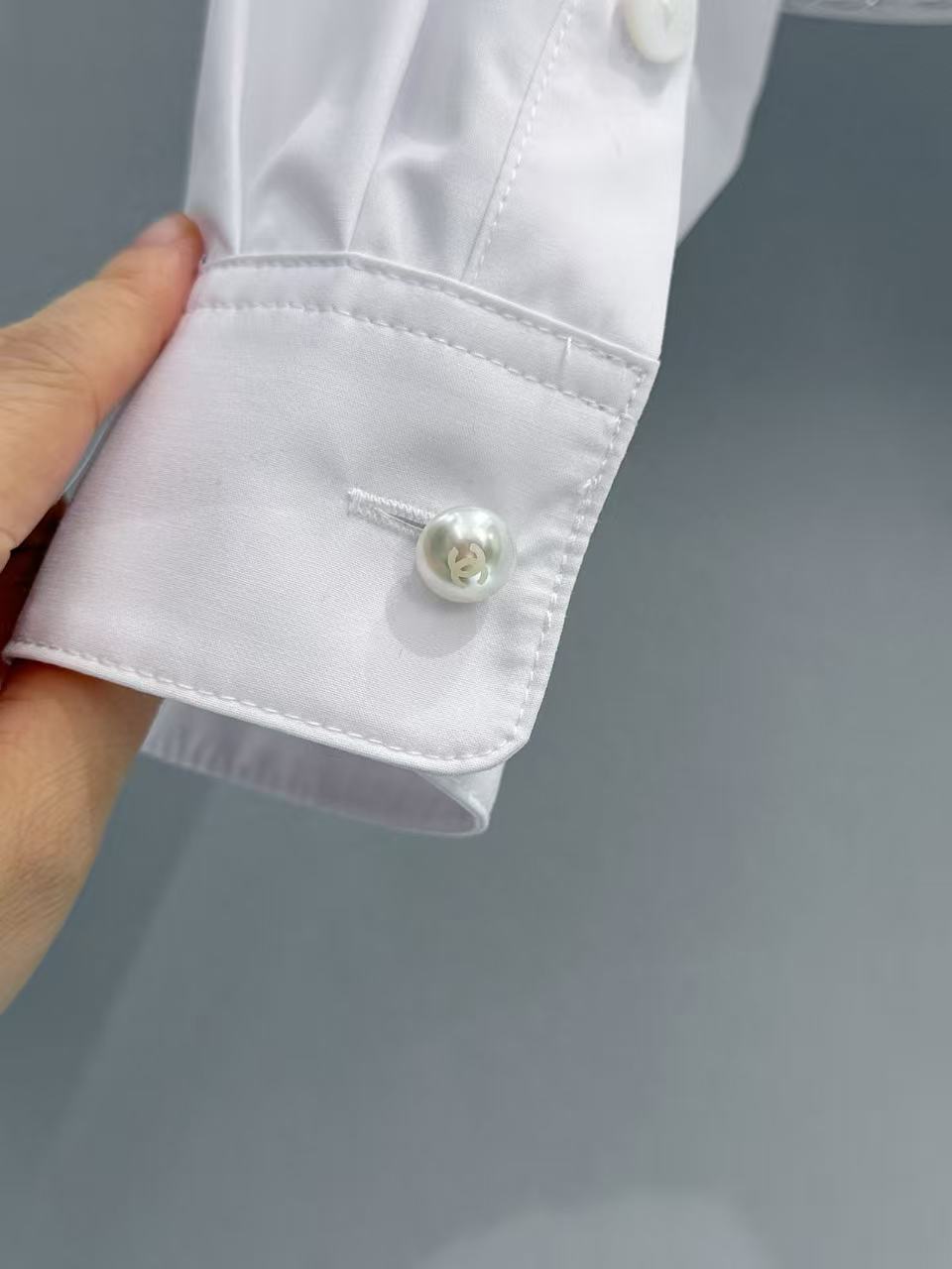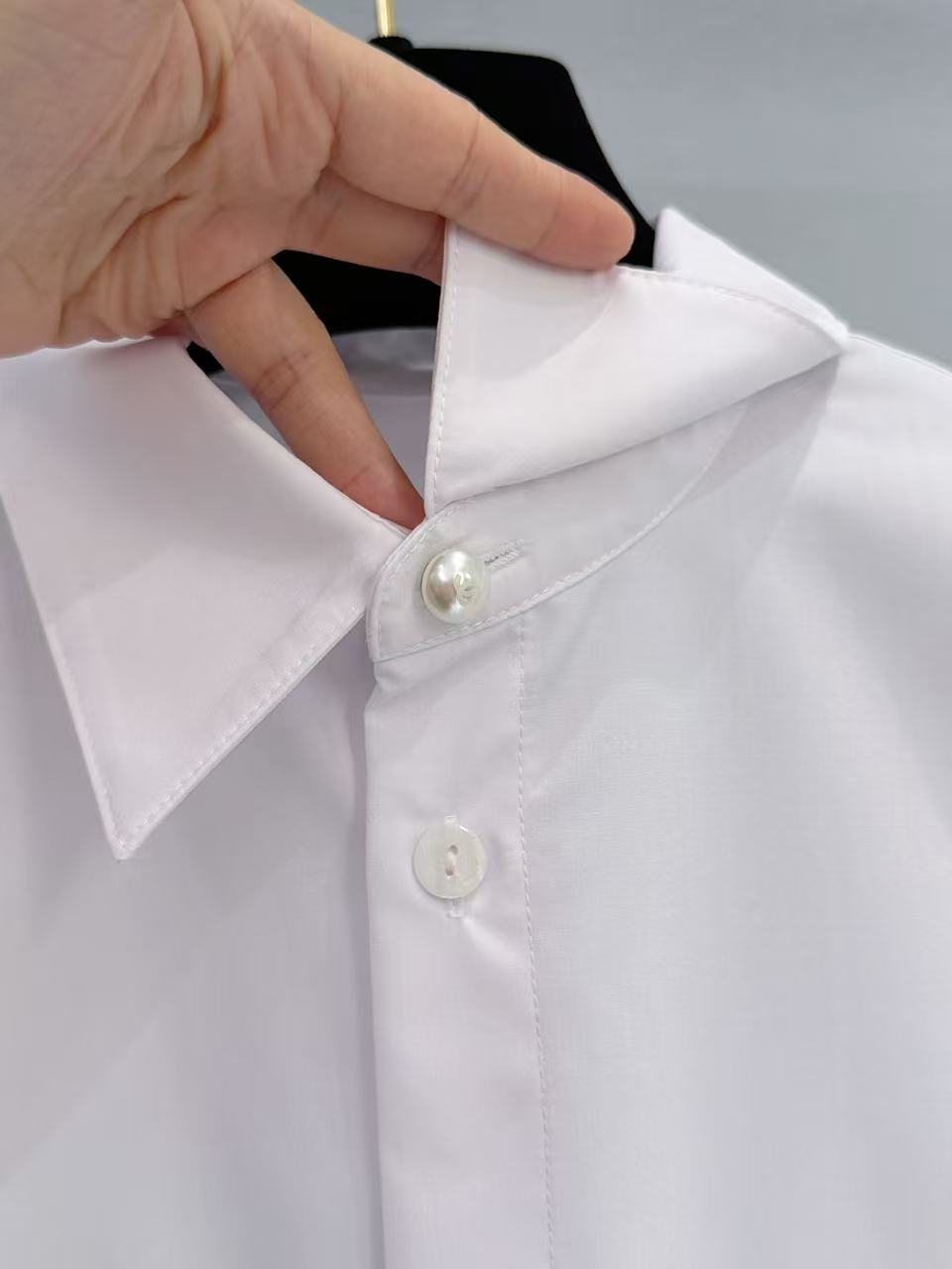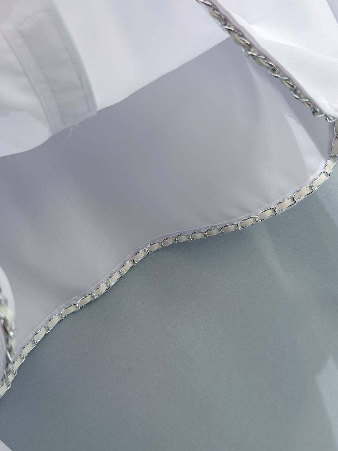重工手縫金屬鏈條: 下擺處的每一寸金屬鏈條均由資深工匠純手工縫製而成。鏈條的重量經過精確計算,能為輕盈的襯衫增加優雅的垂墜感,確保走動時下擺依然服貼,不會隨意翻翹。