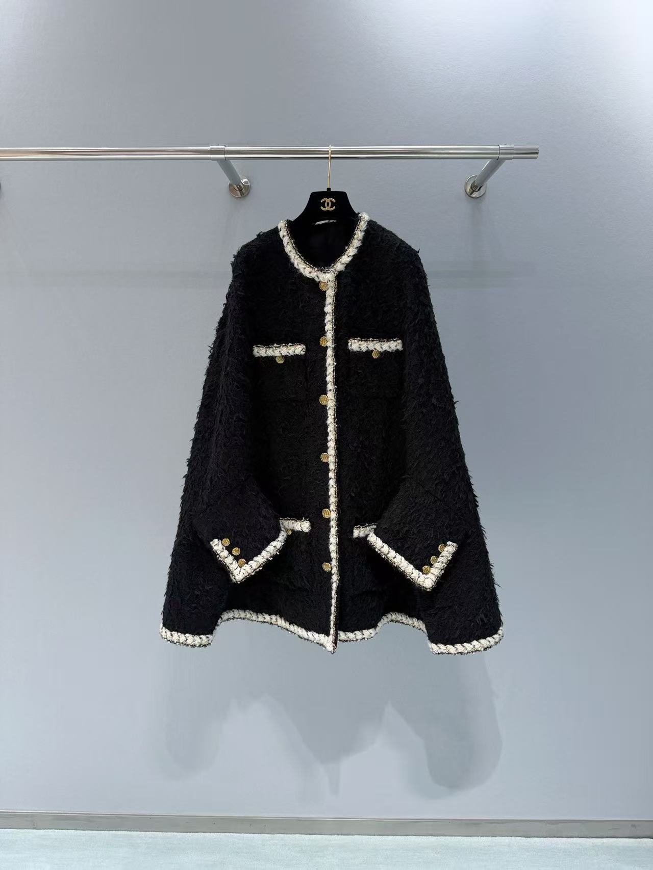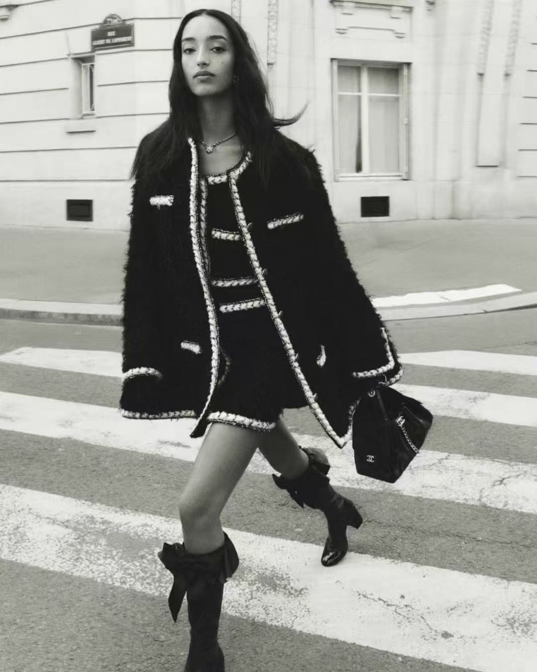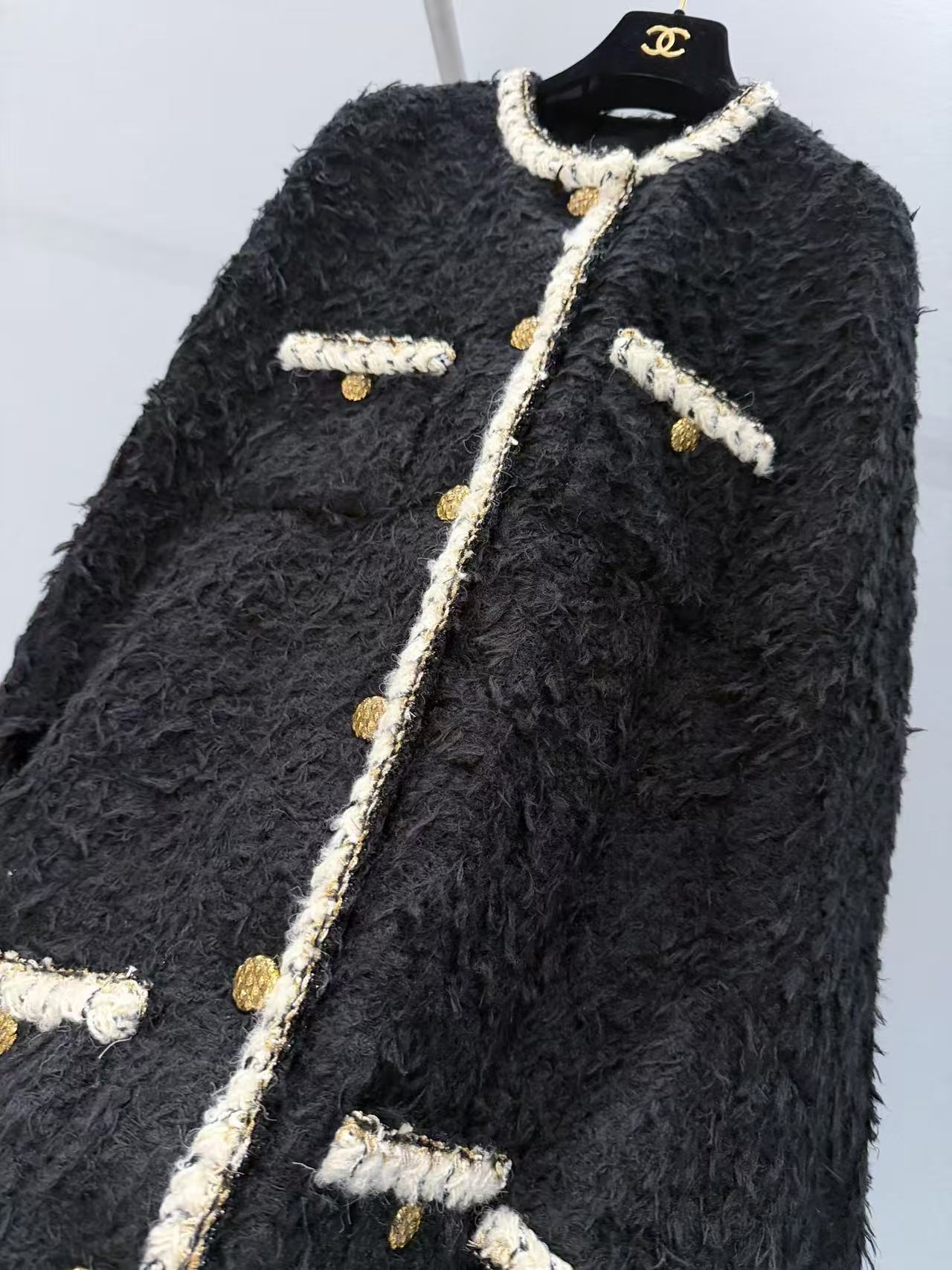 選用長毛黑色粗花呢,質地豐富立體,觸感柔軟卻帶有粗花呢獨特的顆粒感,白色鑲邊與金色紐扣增添細膩光澤,細節精致到不行,將經典元素完美融合現代剪裁,既時尚又實穿,保暖性與質感都一流。