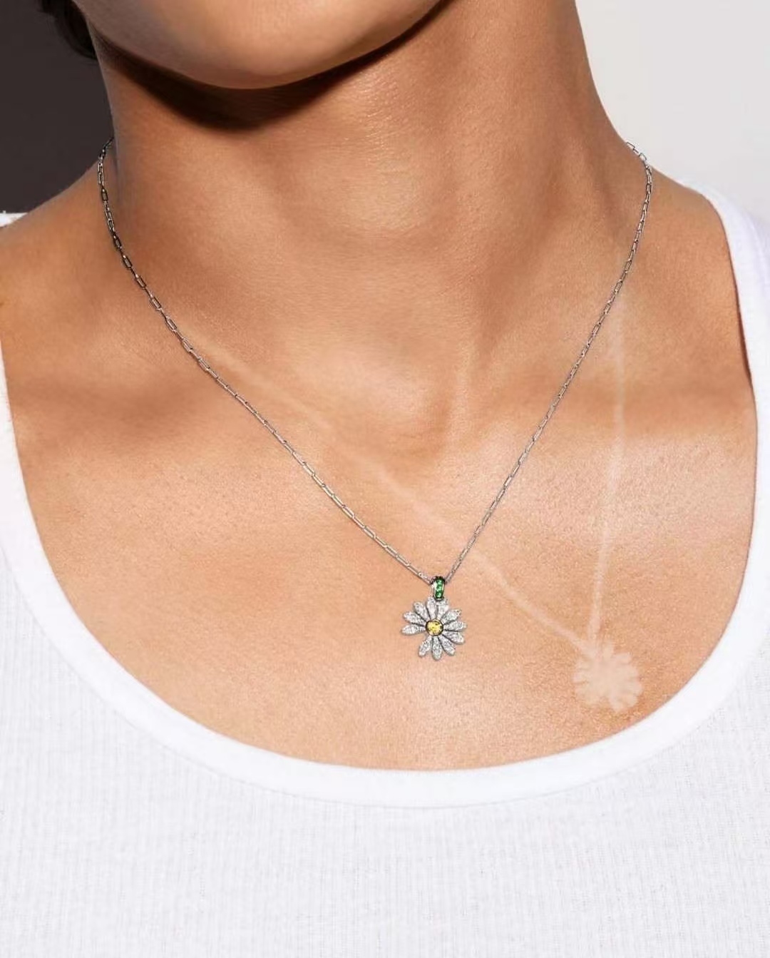 這條項鍊的材質也相當講究,整體採用了高質感的 925純銀,戴起來不僅有份量感,也更顯精緻。最吸睛的是項鍊上點綴的黃、藍寶石,寶石的光芒讓雛菊和向日葵的設計更加生動立體,每一個細節都做得非常完美,充分展現了 Jacob & Co. 的精湛工藝。