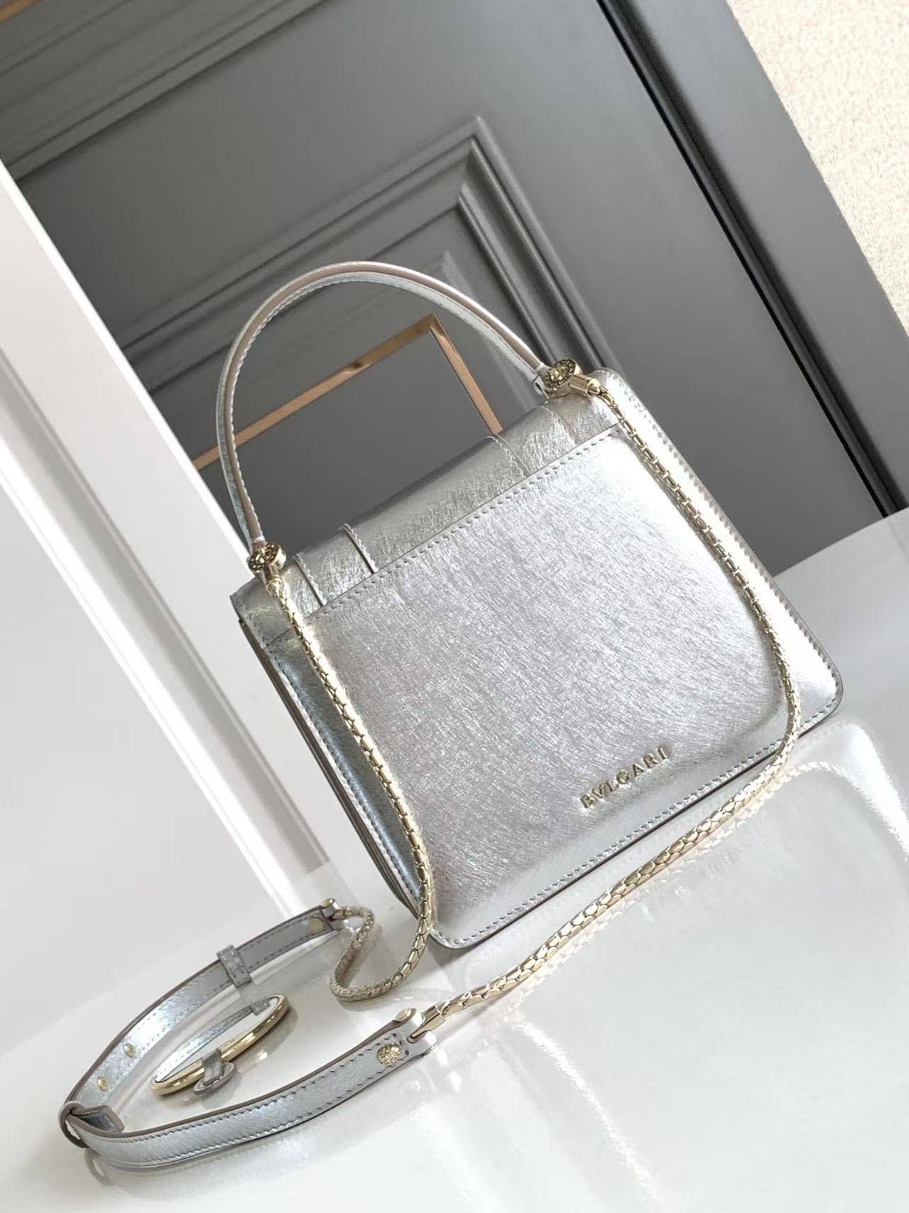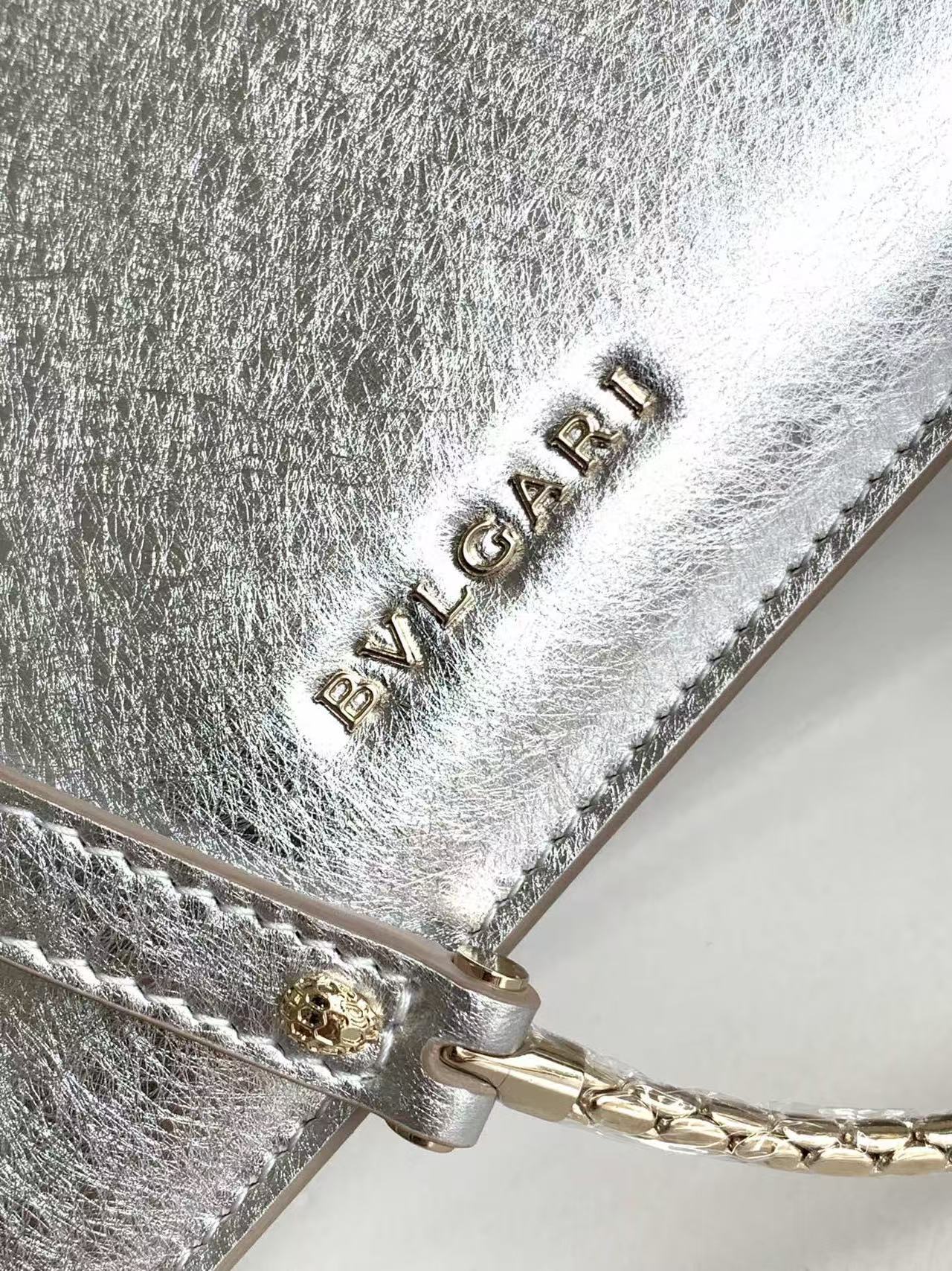 這款包的材質真的非常特別!它採用了銀色的紋理小牛皮製作而成,這種獨特的處理工藝,不僅完美彰顯出高級的金屬質感,那精緻的紋路更是讓人聯想起鑽石原石美麗的內含物,充滿了視覺的享受。搭配上淺金鍍金的黃銅配飾,整體奢華感瞬間拉滿。