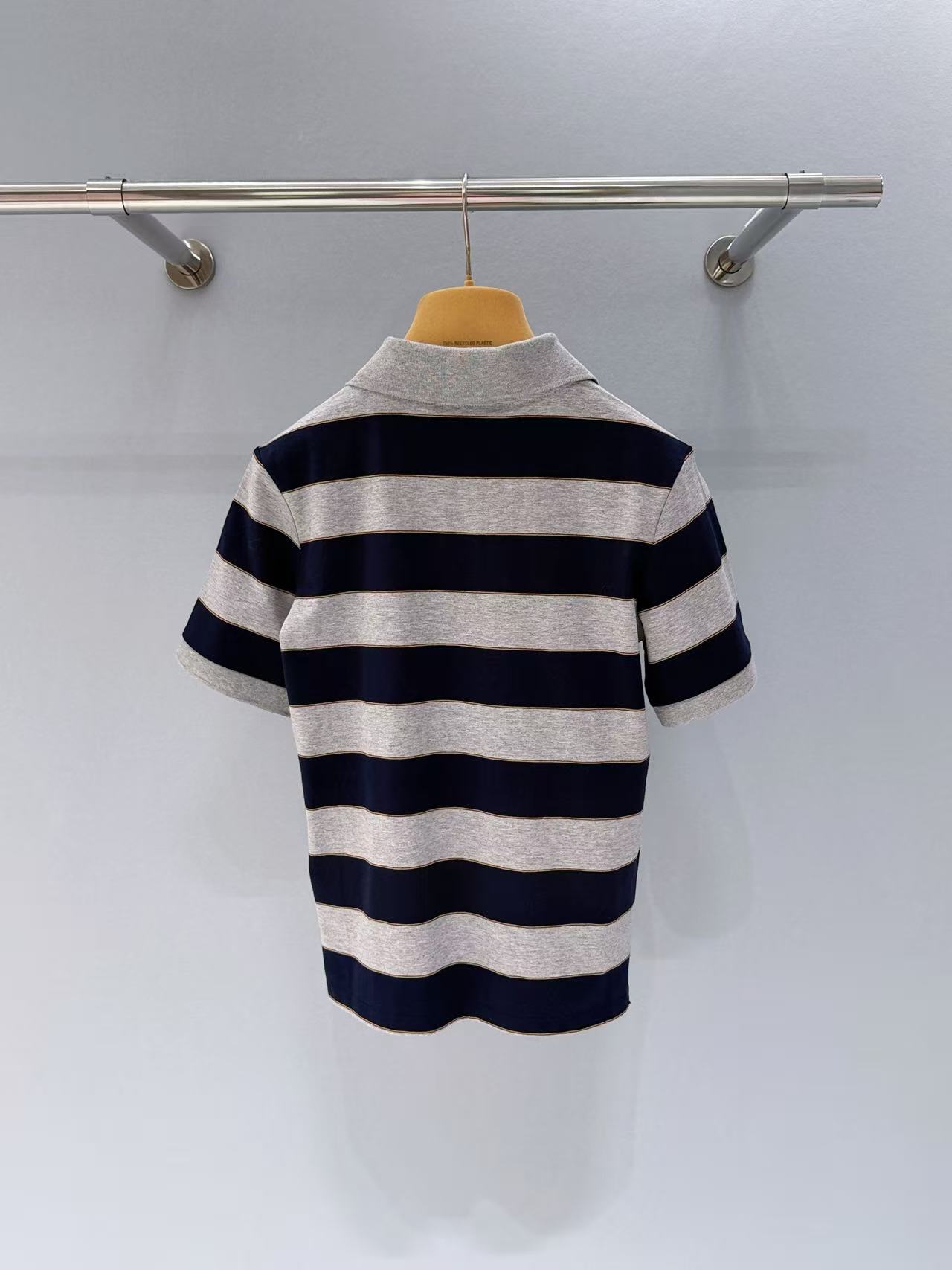 整件衣服採用了超經典的 Polo 領設計,搭配質感的藏藍與淺灰撞色條紋,配色低調卻顯得非常高級。俐落的短袖剪裁,加上胸前精緻的品牌徽标點綴,細節感直接拉滿。