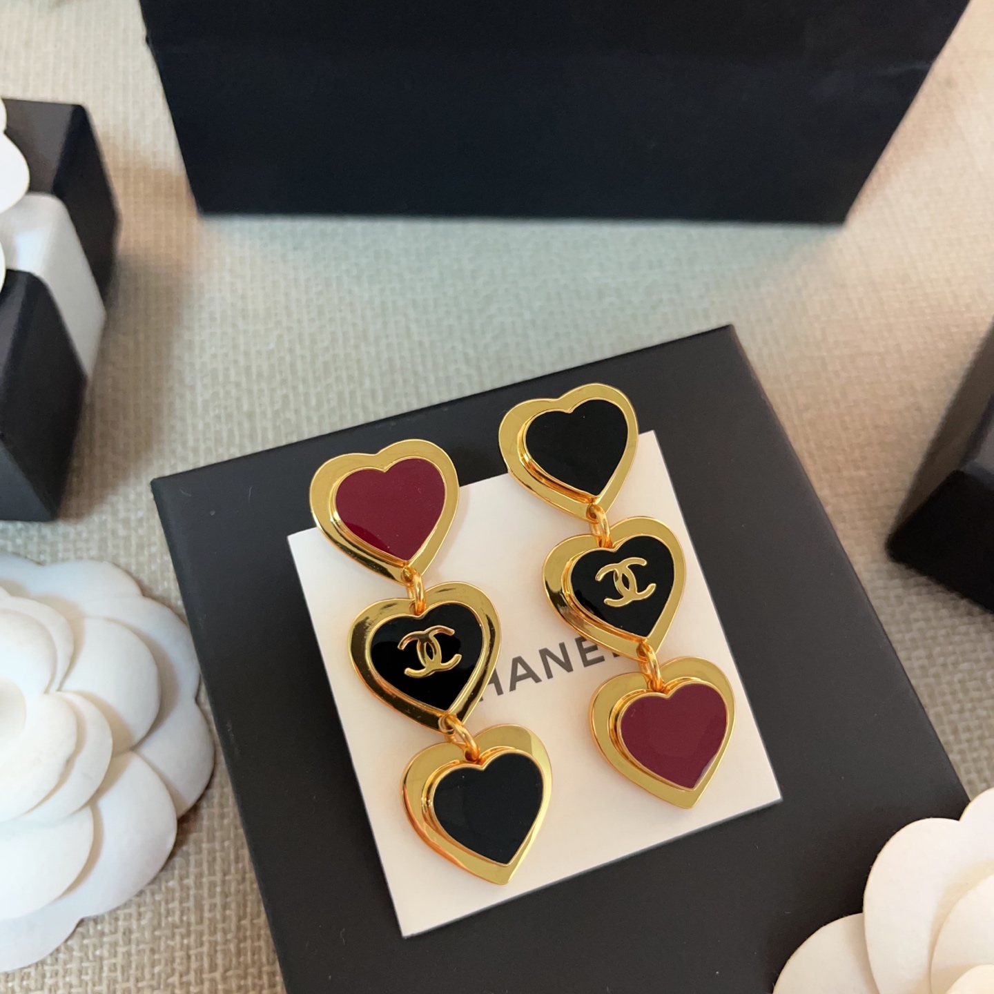 2026春夏新品 C家 紅黑撞色三愛心耳環