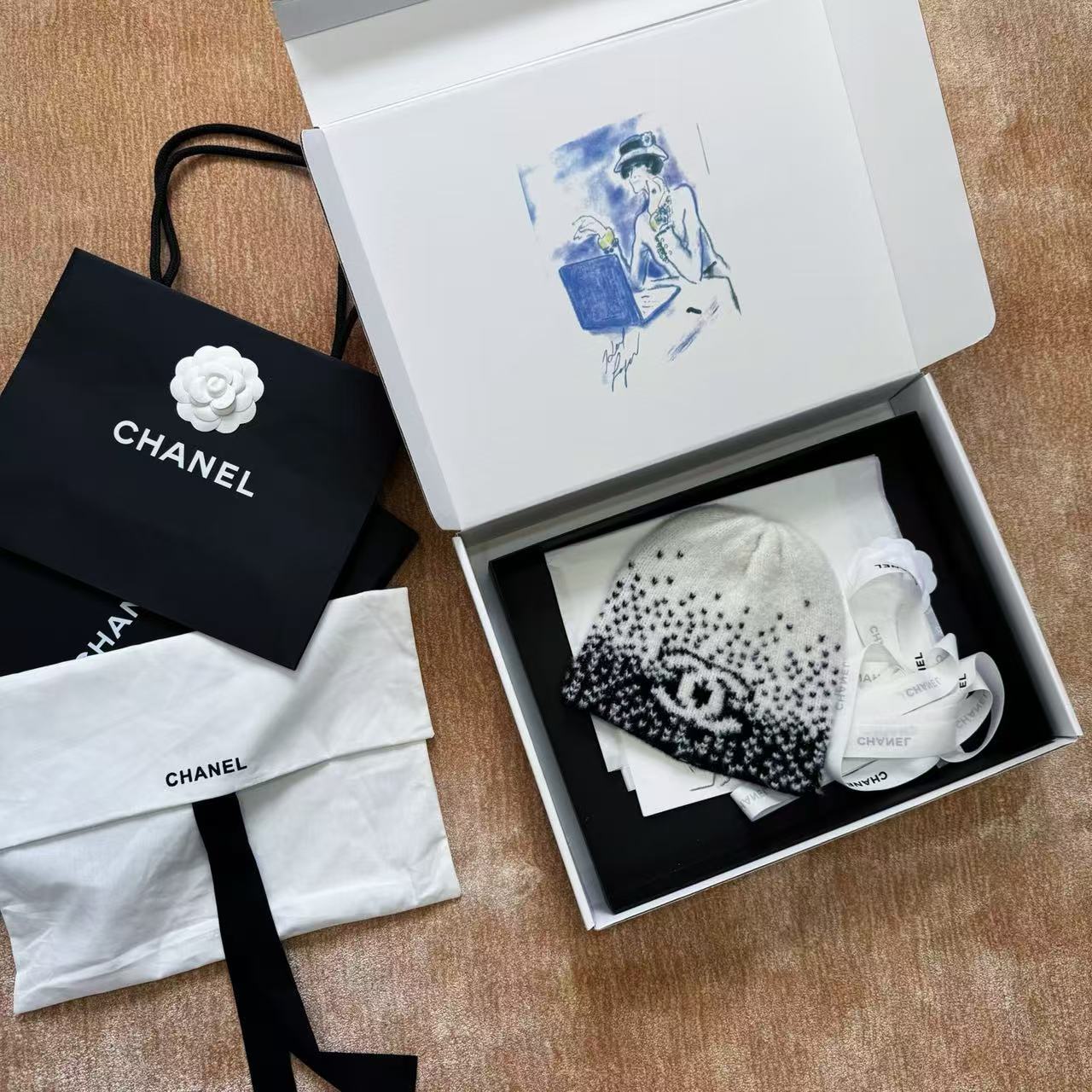 這頂根本是「把雪山貴婦直接戴在頭上」的夢幻神器,遠看就是一頂低調黑白毛帽,近看才發現整頂是7針拔花凹凸格紋+漸變錯位雙C若隱若現,戴上去整個頭型瞬間變精緻小臉,貴到讓路人自動幫你讓路~