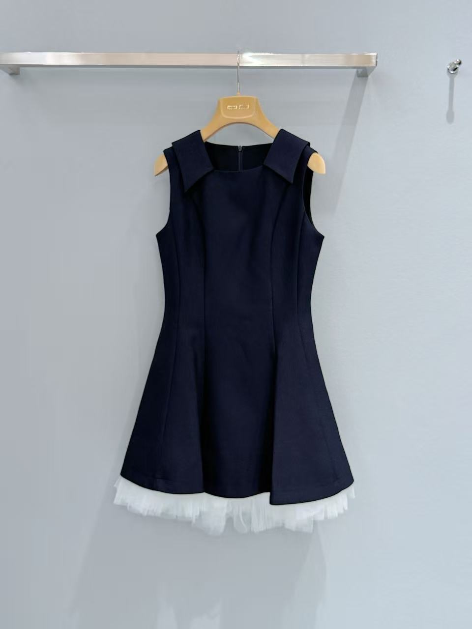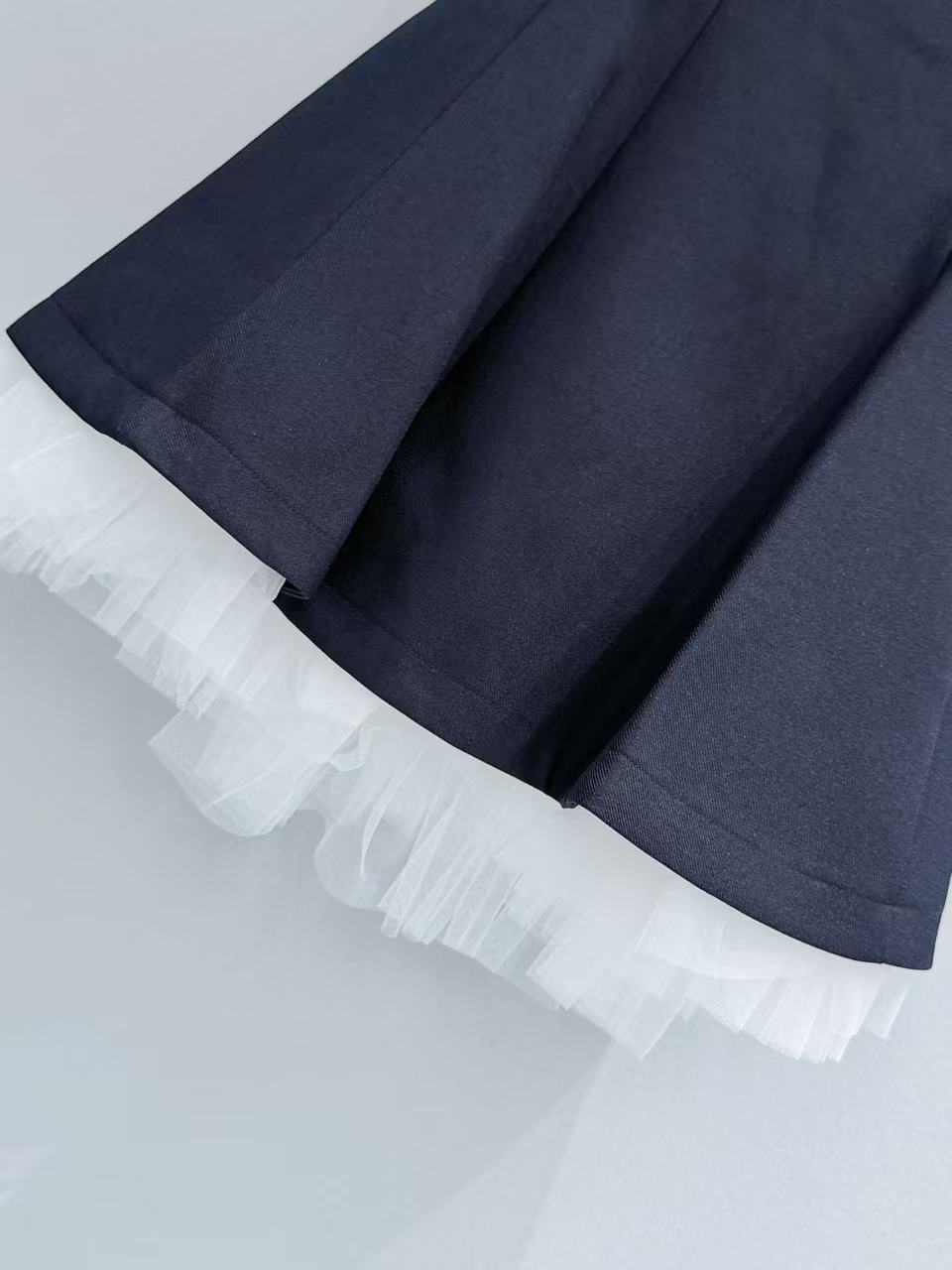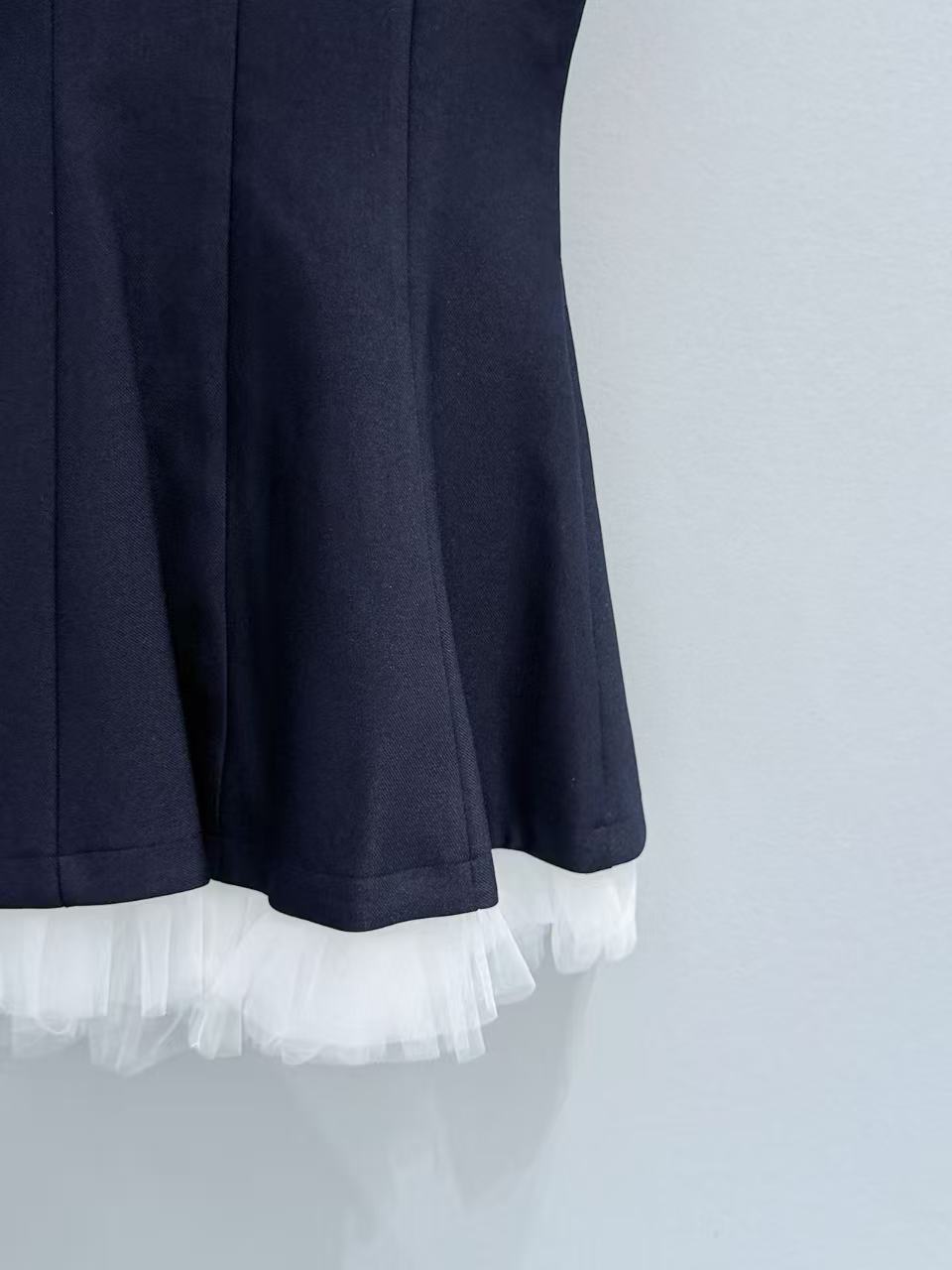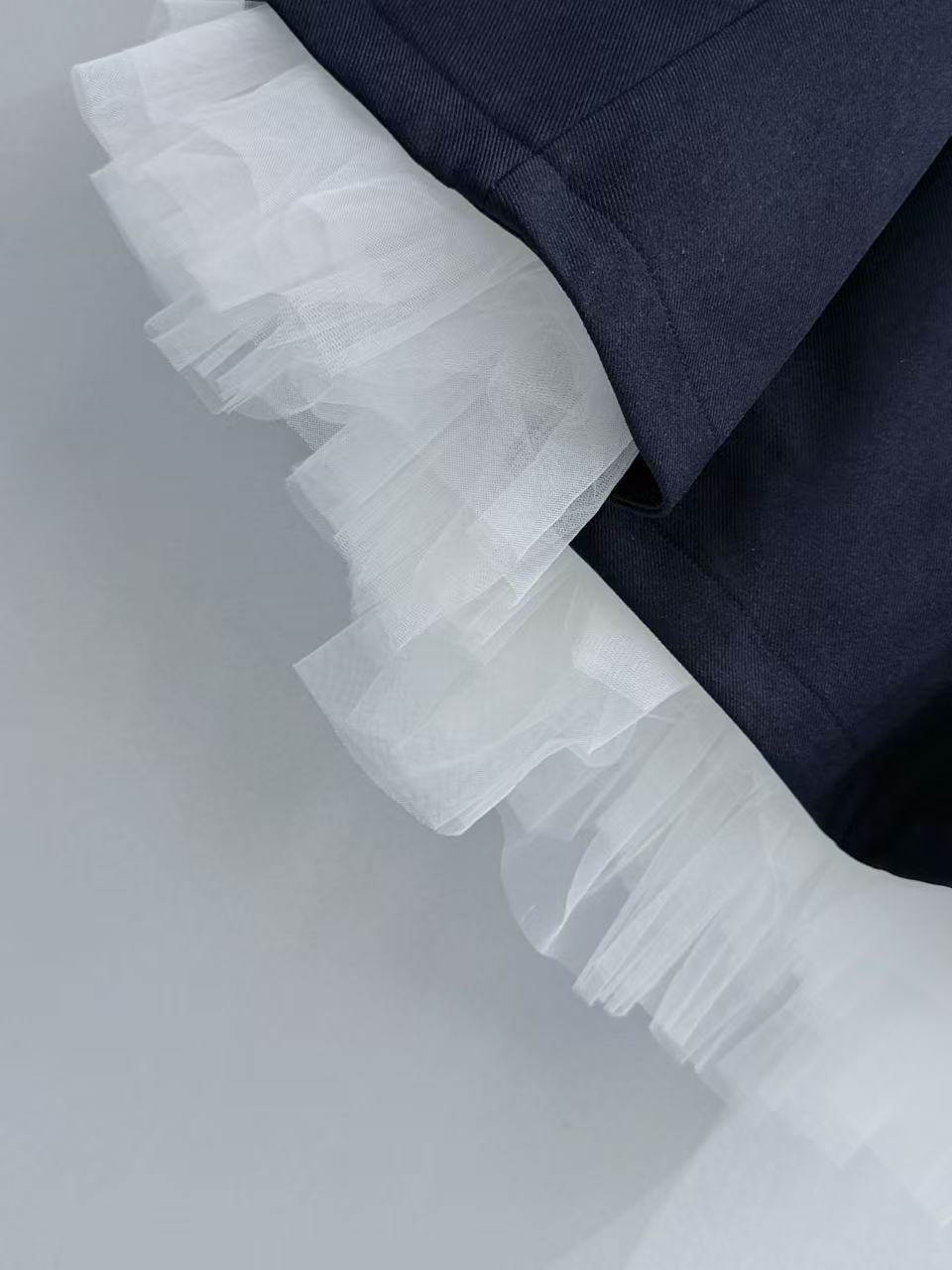 下擺拼接的一層白色細緻薄紗,在挺括的材質下若隱若現,完美平衡了藏青色的沉穩,注入了一份靈動的夢幻感。
