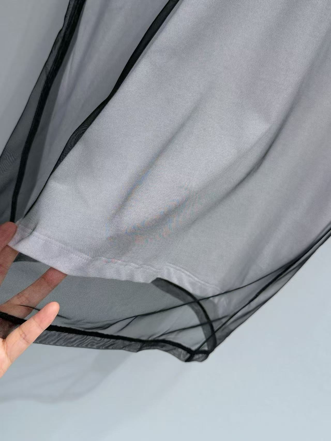 特供高品質輕薄黑網紗: 嚴選極細纖維織就的透氣網紗,手感滑順且具備極佳的韌性。這種材質擁有天然的呼吸感,且能長久維持外層黑邊滾邊的立體輪廓。
