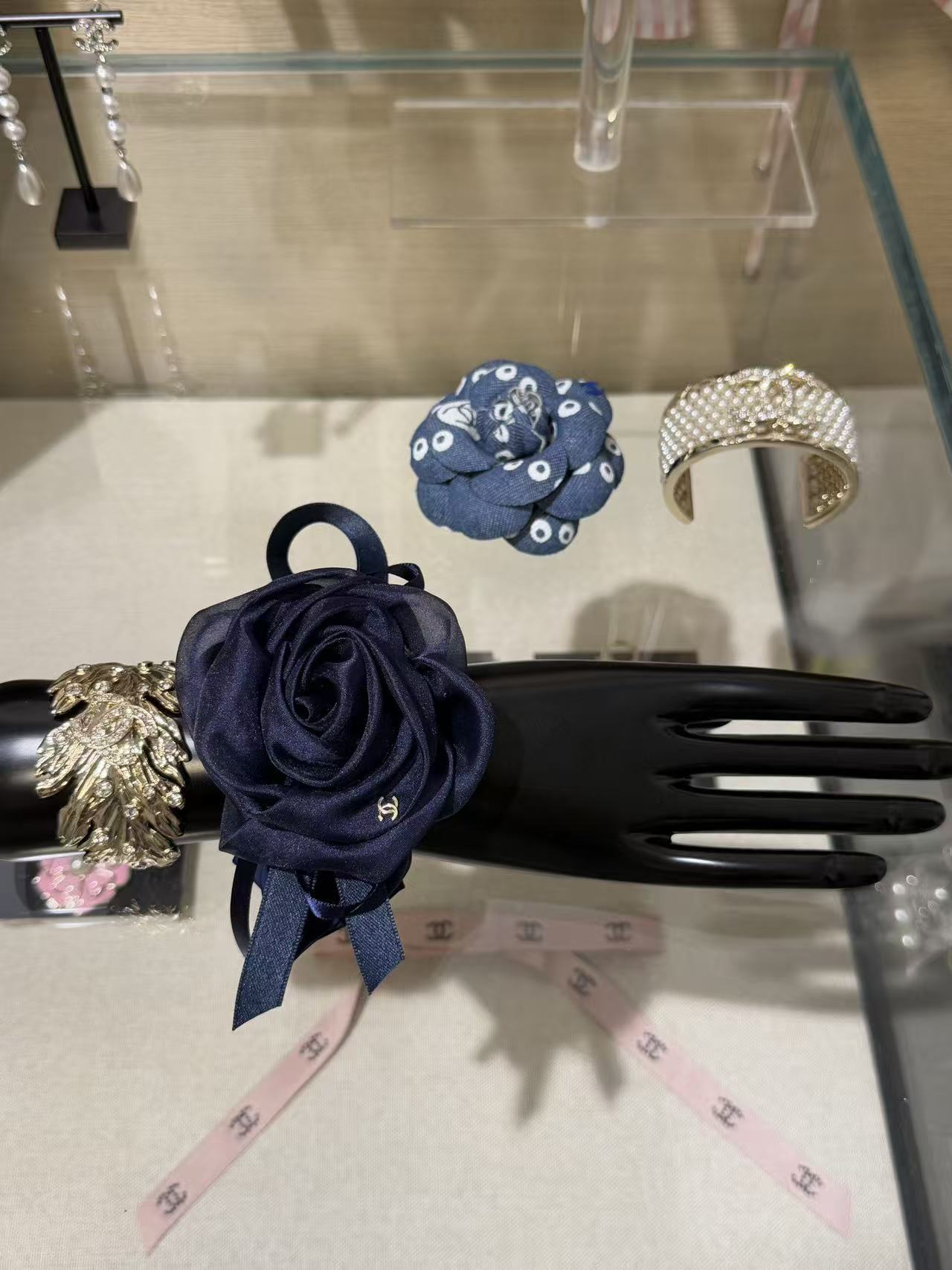深邃的午夜藍緞面打底,立體網紗山茶花層層綻放,旁邊綁著同色系織帶蝴蝶結,