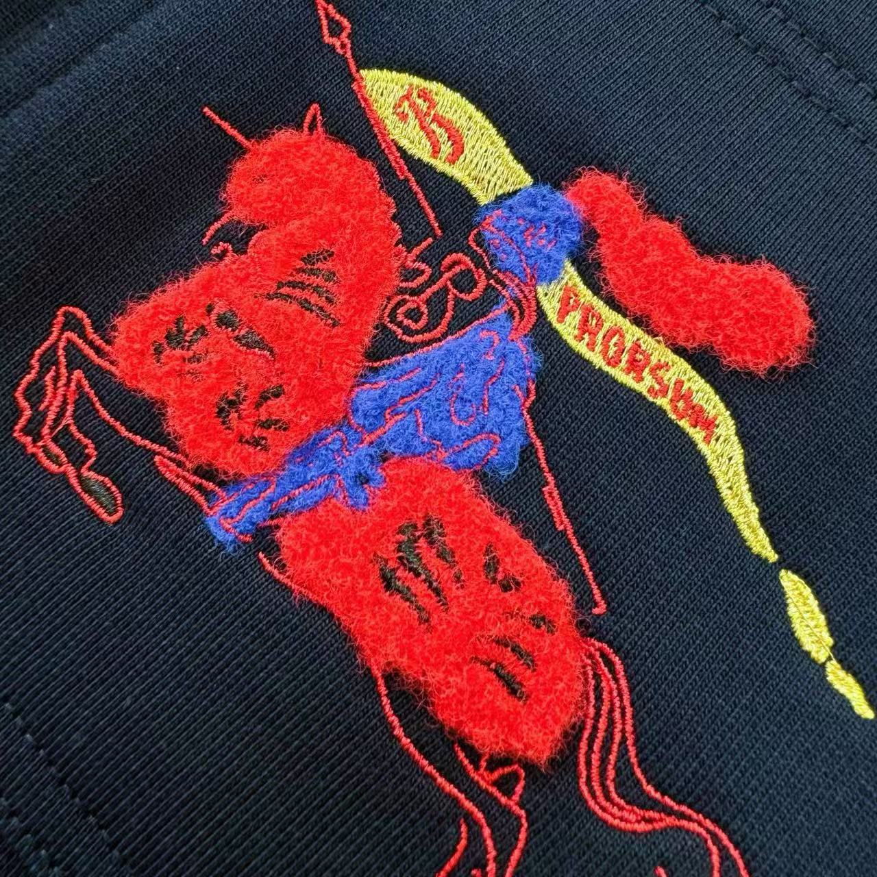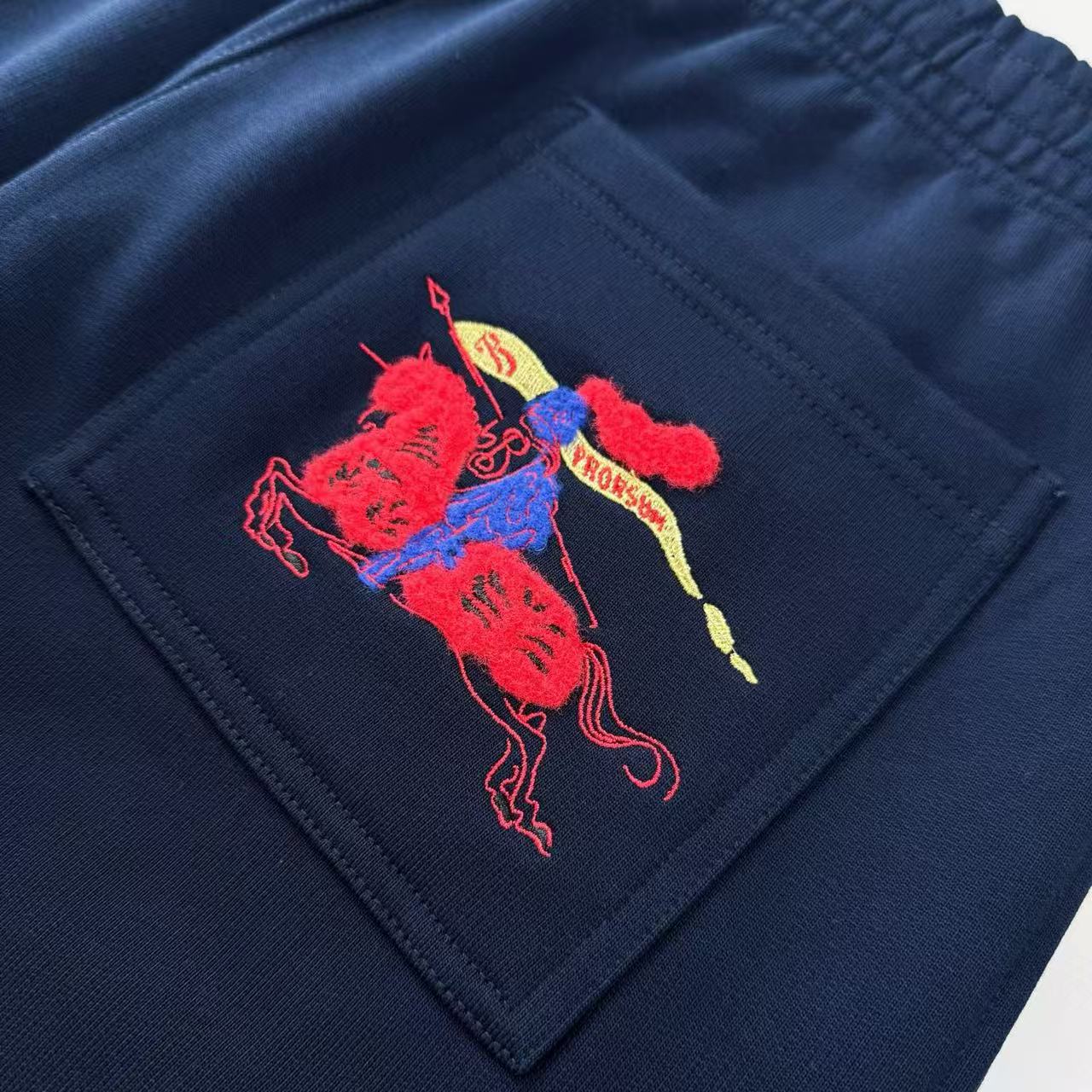 整件單品的精華在於褲身側邊的馬術騎士徽標刺繡。這項工藝並非普通的平面電繡,而是多層次技術的結合: