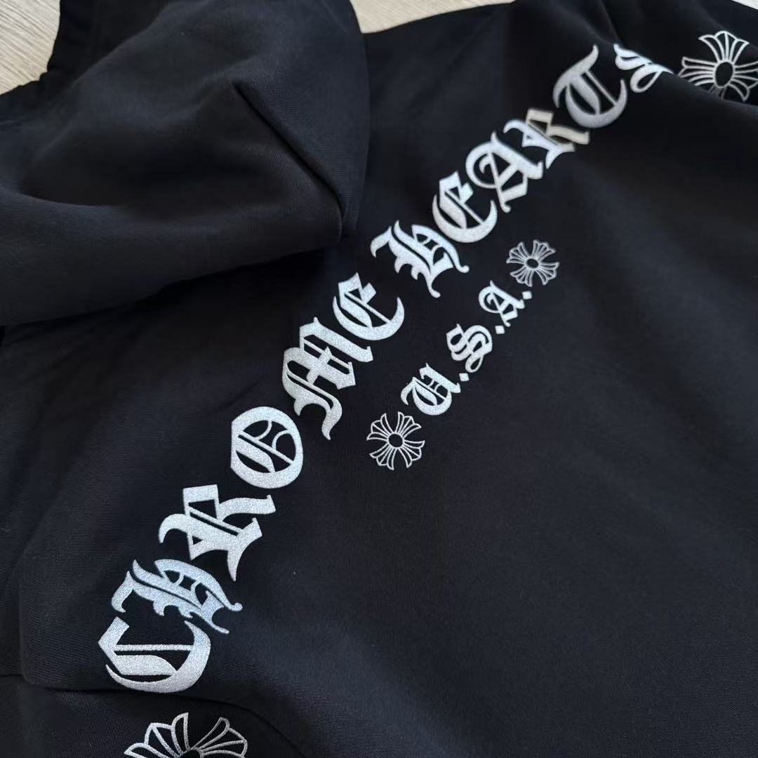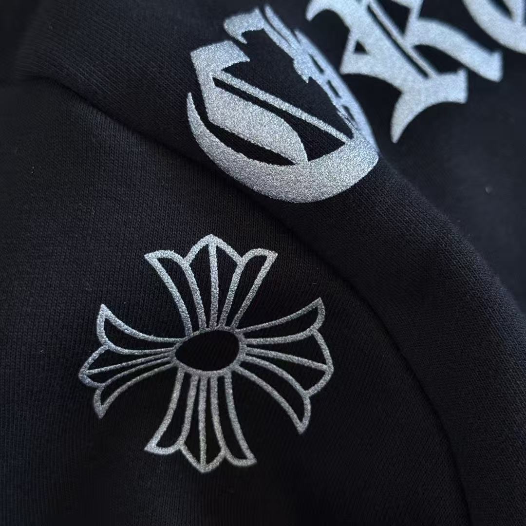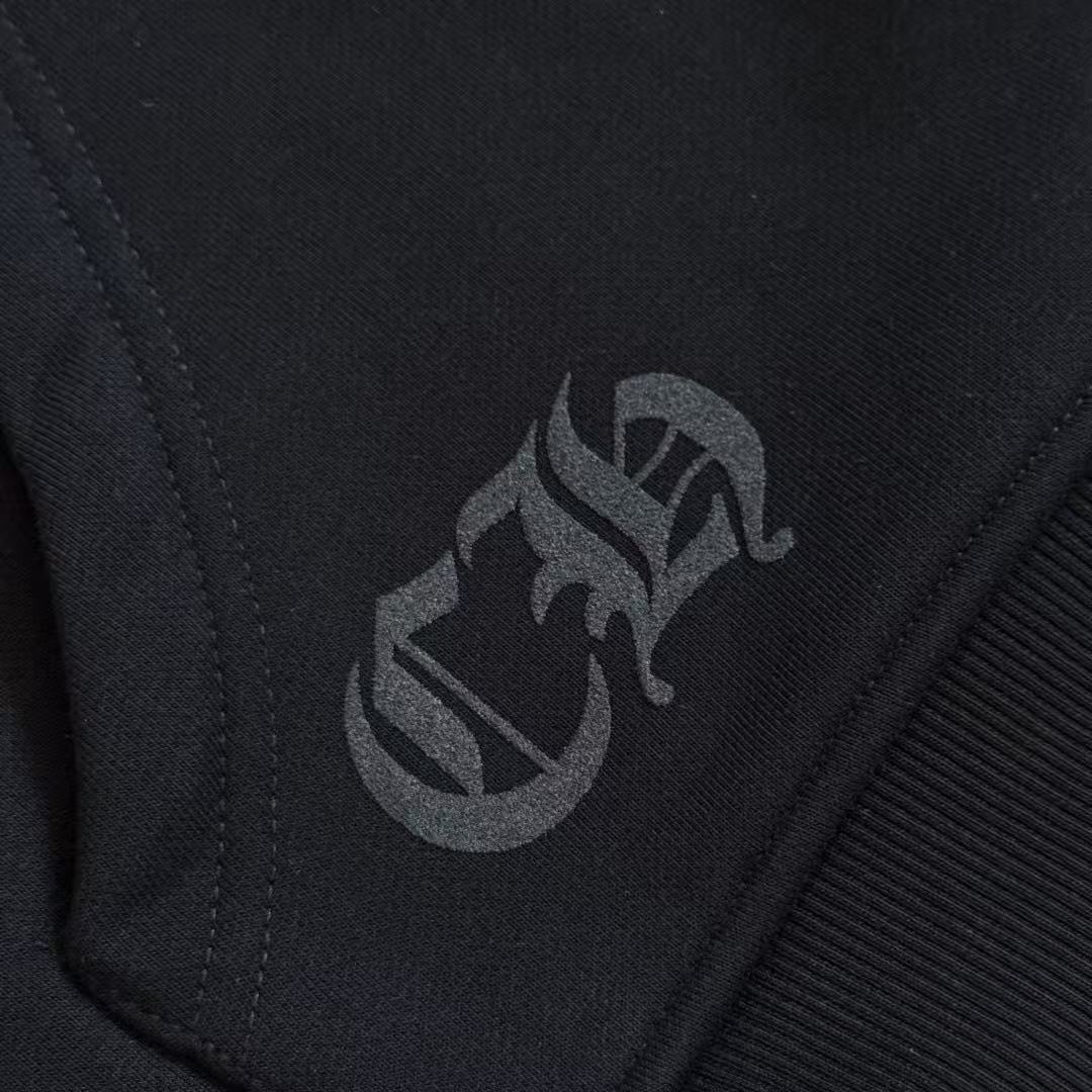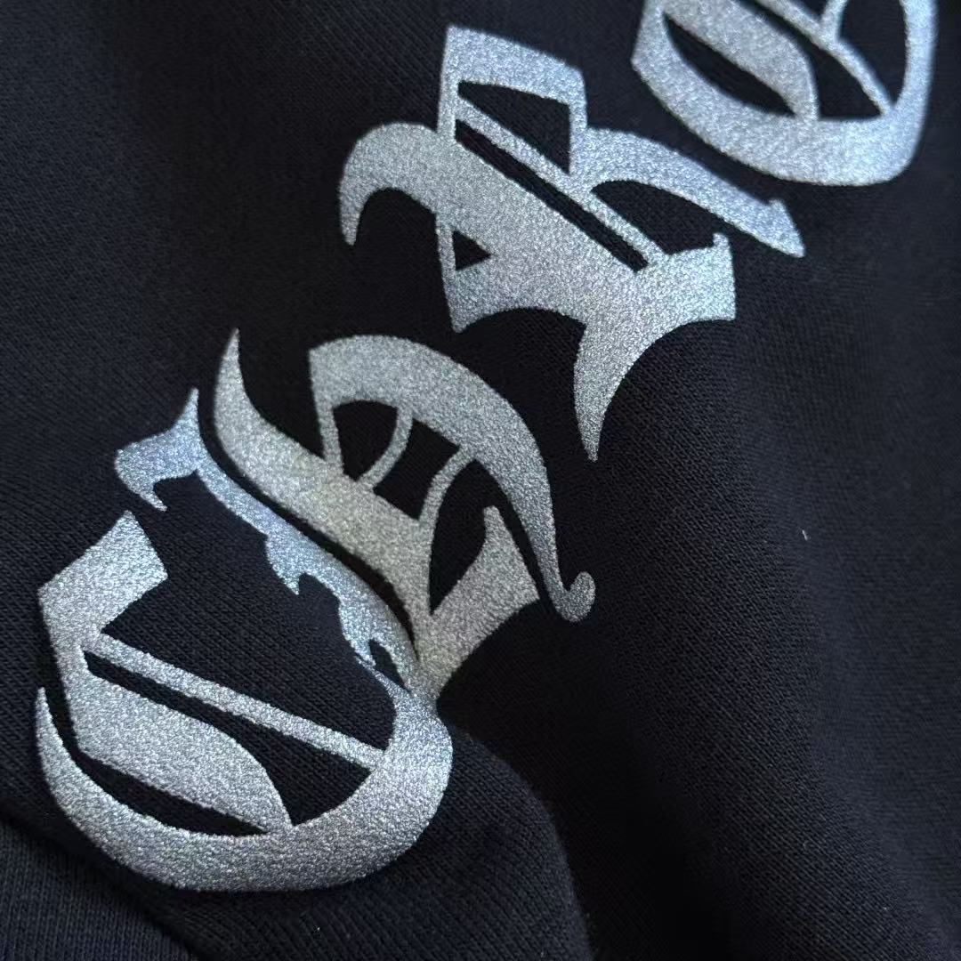 這次分享的梵文燙銀拉鍊衛衣,將複雜的梵文字體與華麗的燙銀工藝結合,光線照射下的銀色光澤與漆黑的重磅棉布形成強烈對比,不僅展現了暗黑街頭的硬派質感,更散發出一種高級的視覺壓迫感。