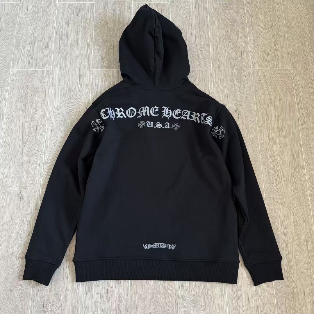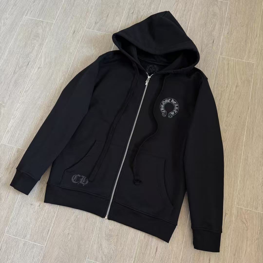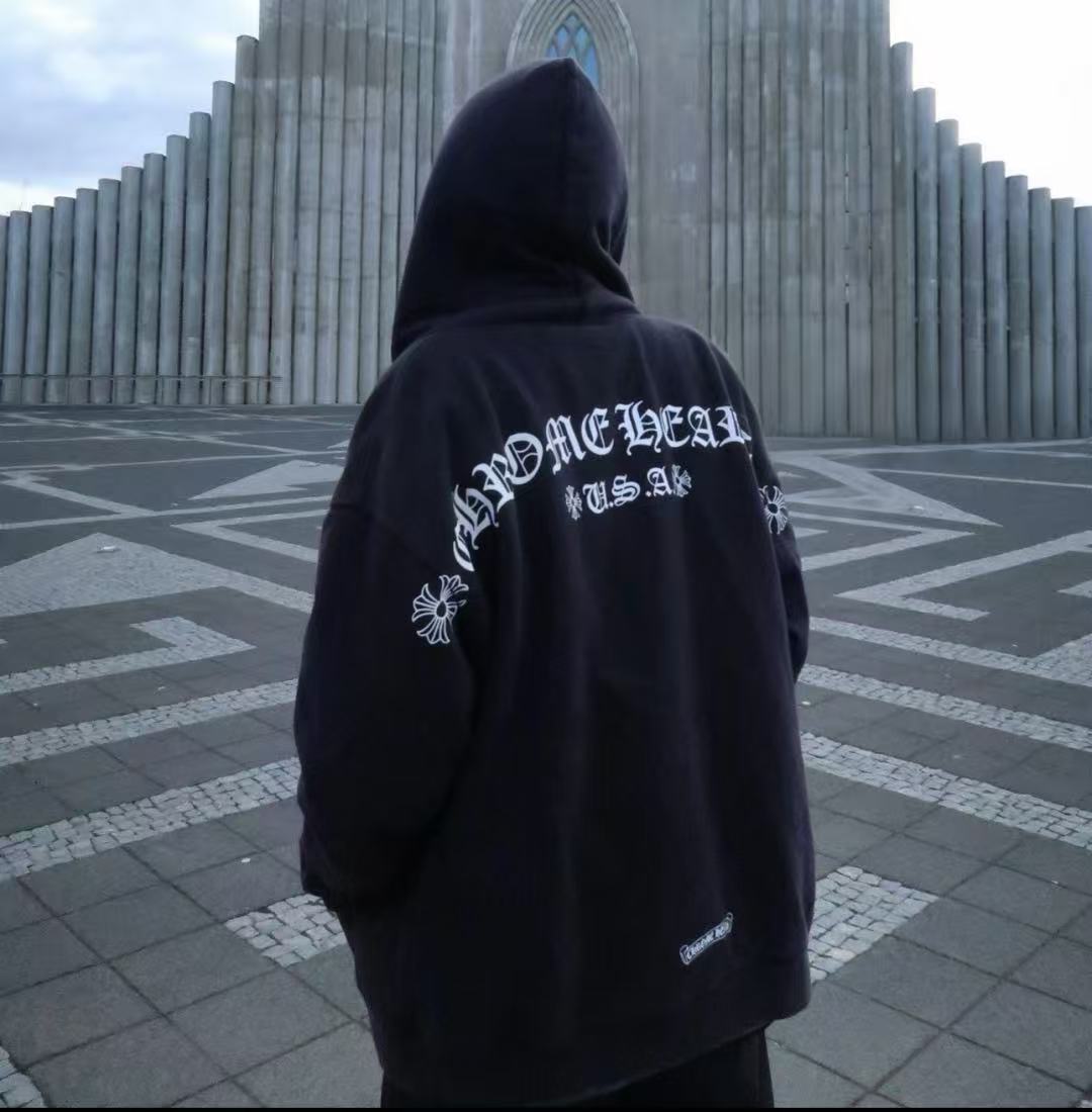 這次分享的梵文燙銀拉鍊衛衣,將複雜的梵文字體與華麗的燙銀工藝結合,光線照射下的銀色光澤與漆黑的重磅棉布形成強烈對比,不僅展現了暗黑街頭的硬派質感,更散發出一種高級的視覺壓迫感。