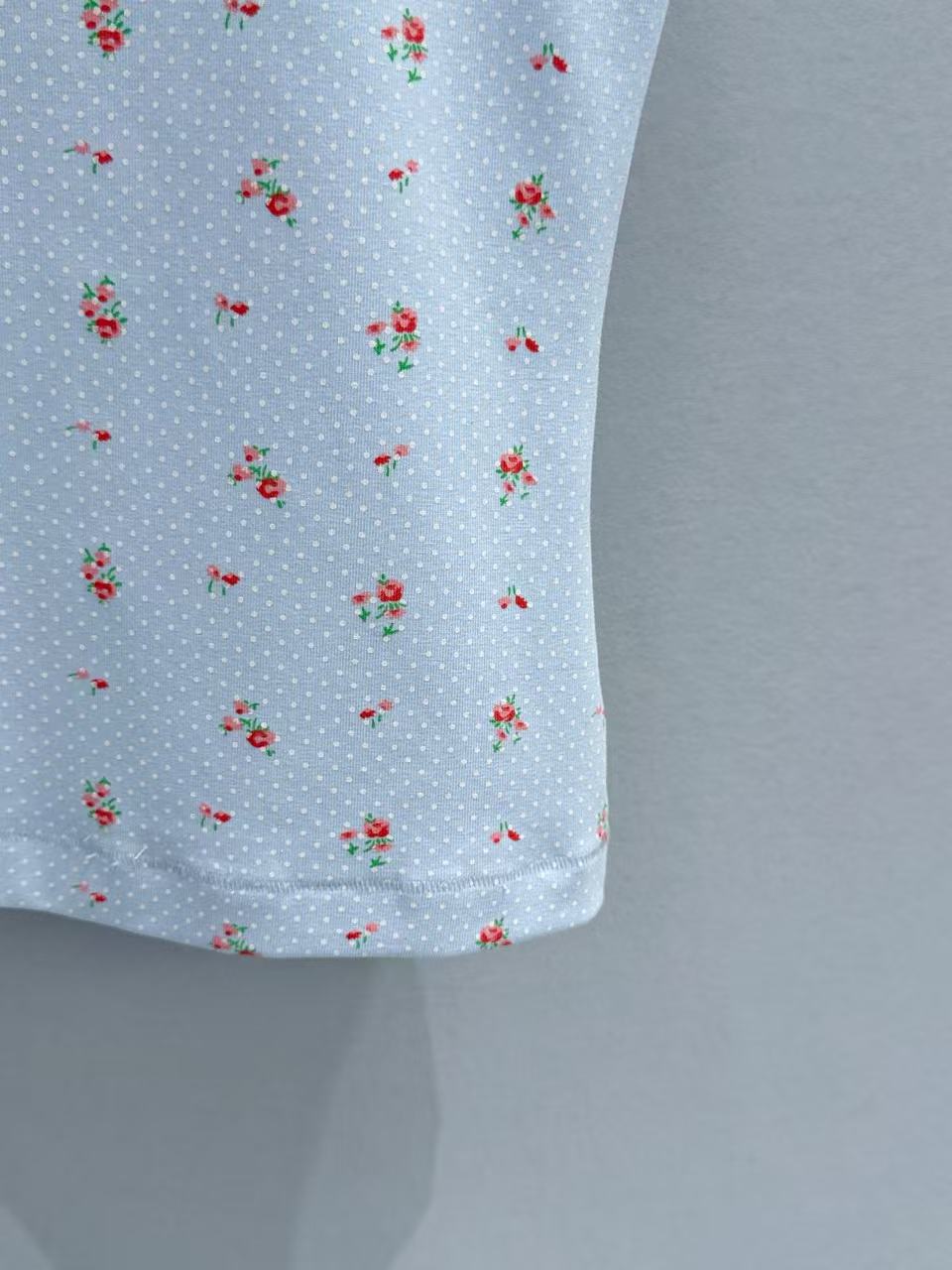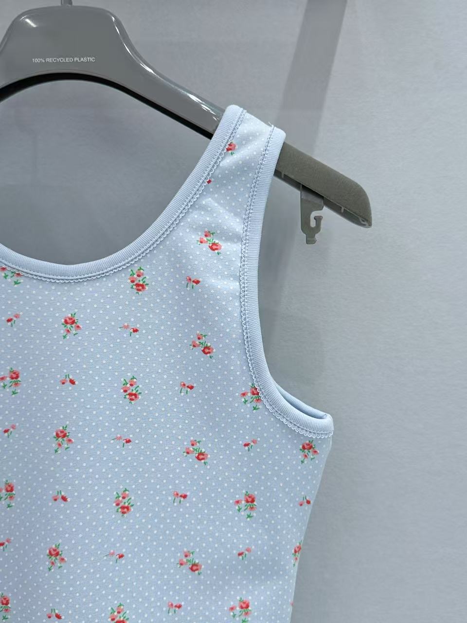 淺藍、純白與小紅花的交織設計 賦予了整件衣服極強的層次感,而領口與肩帶處的同色羅紋包邊,更是把精緻的少女靈魂直接拉滿。