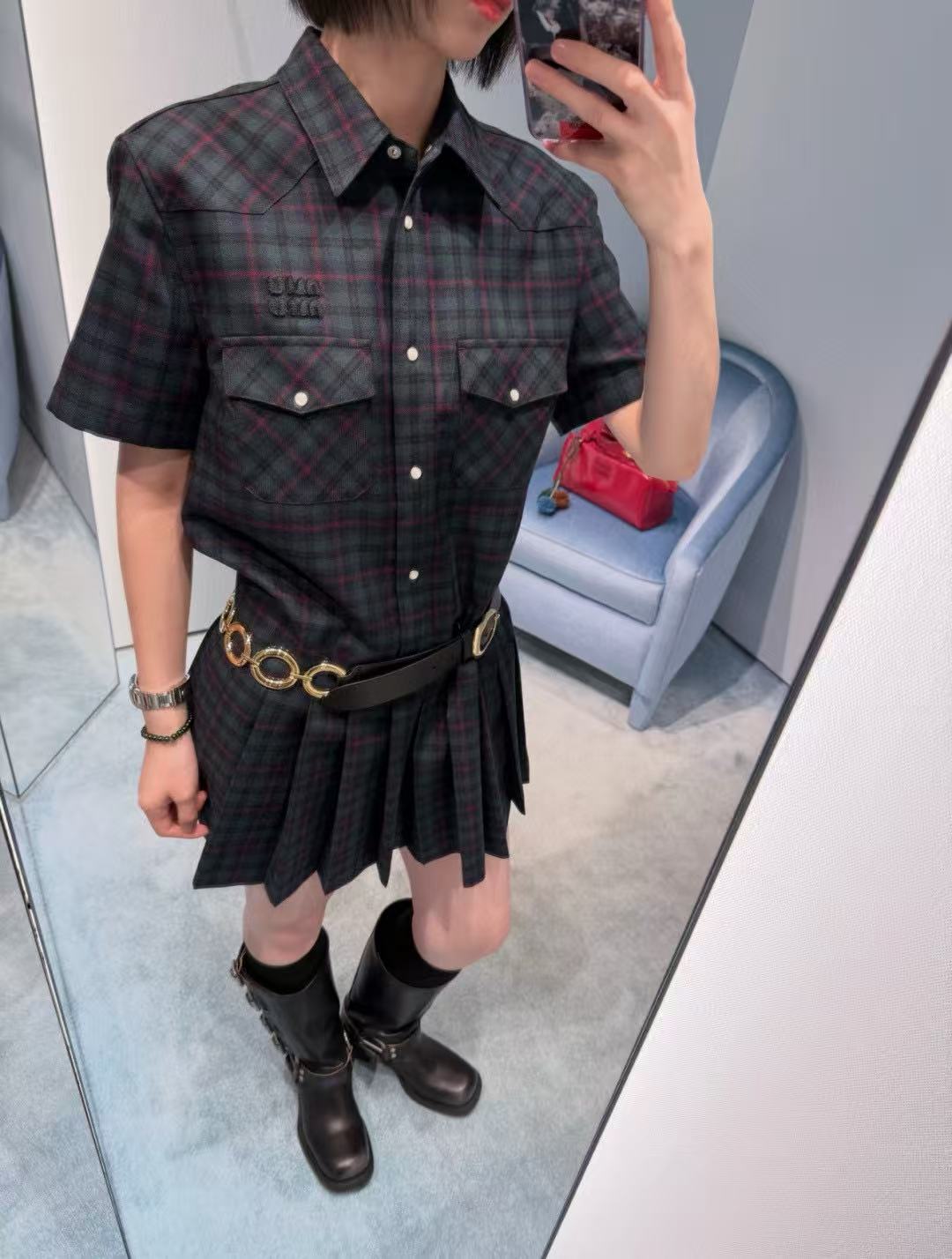 Miu家 徽標字母格紋襯衫百褶裙