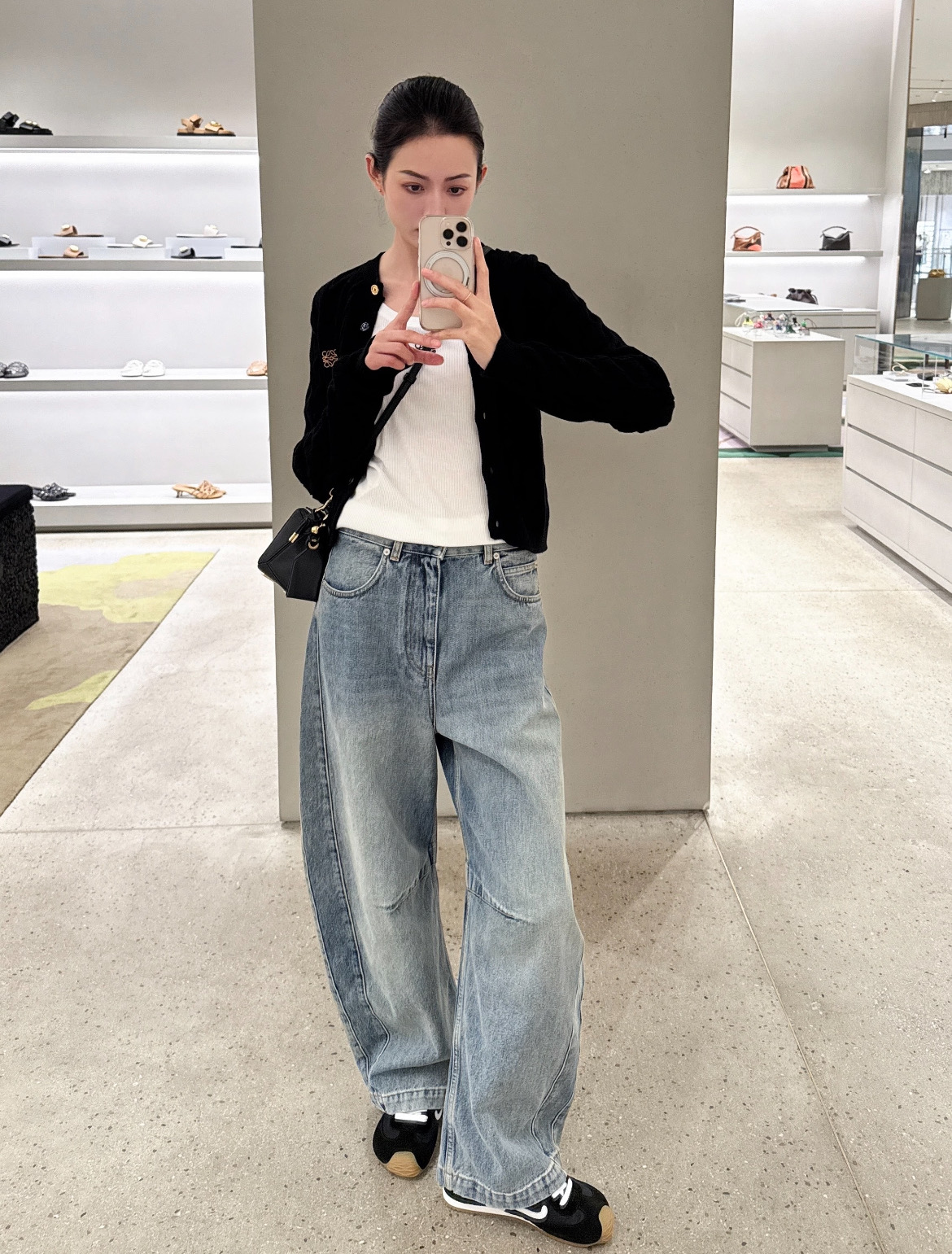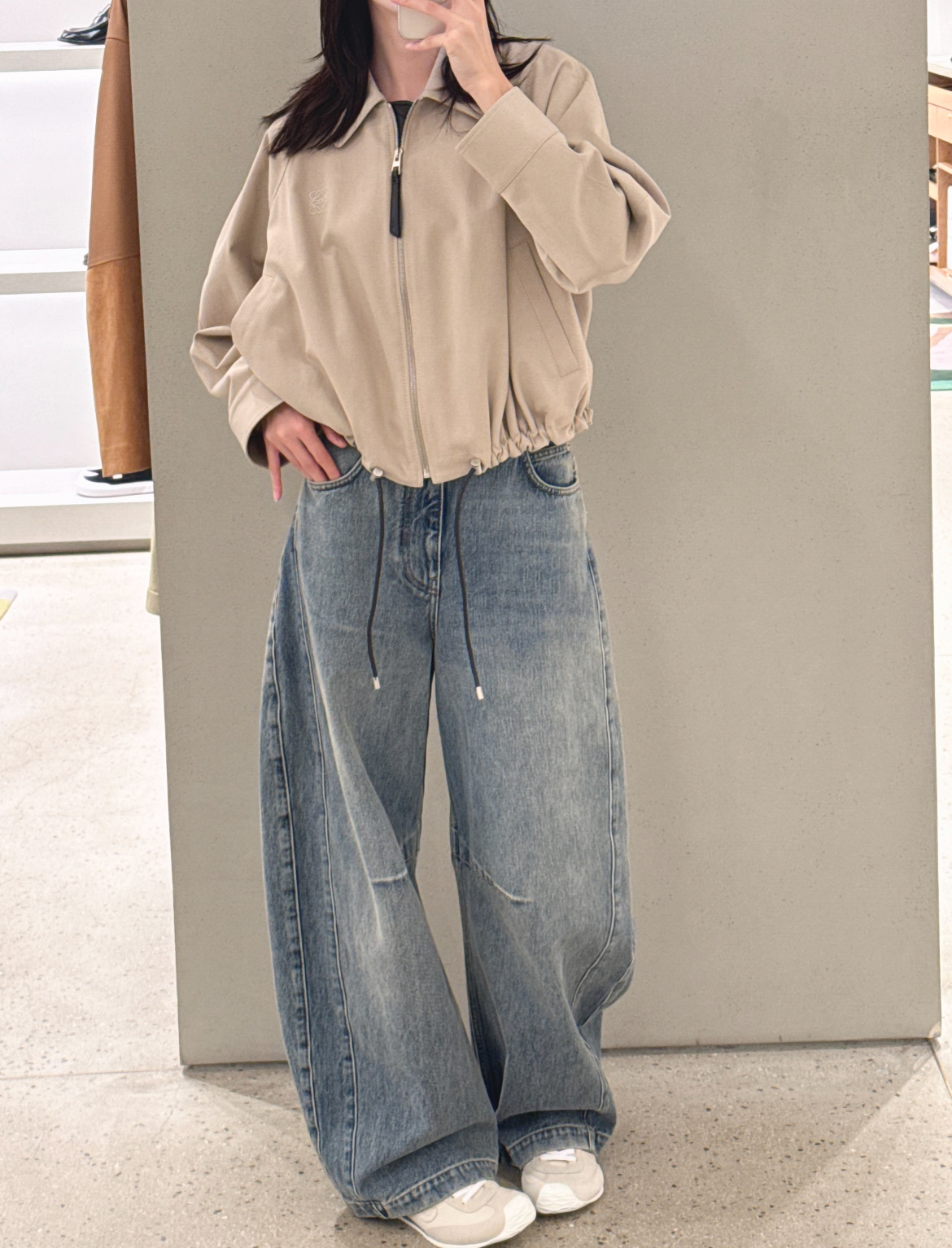 整體版型走的是俐落硬挺的直筒路線,長度抓得剛剛好,不會壓身高、也不挑腿型,尤其對梨形身材超級友善,腰胯比例修飾得非常漂亮。